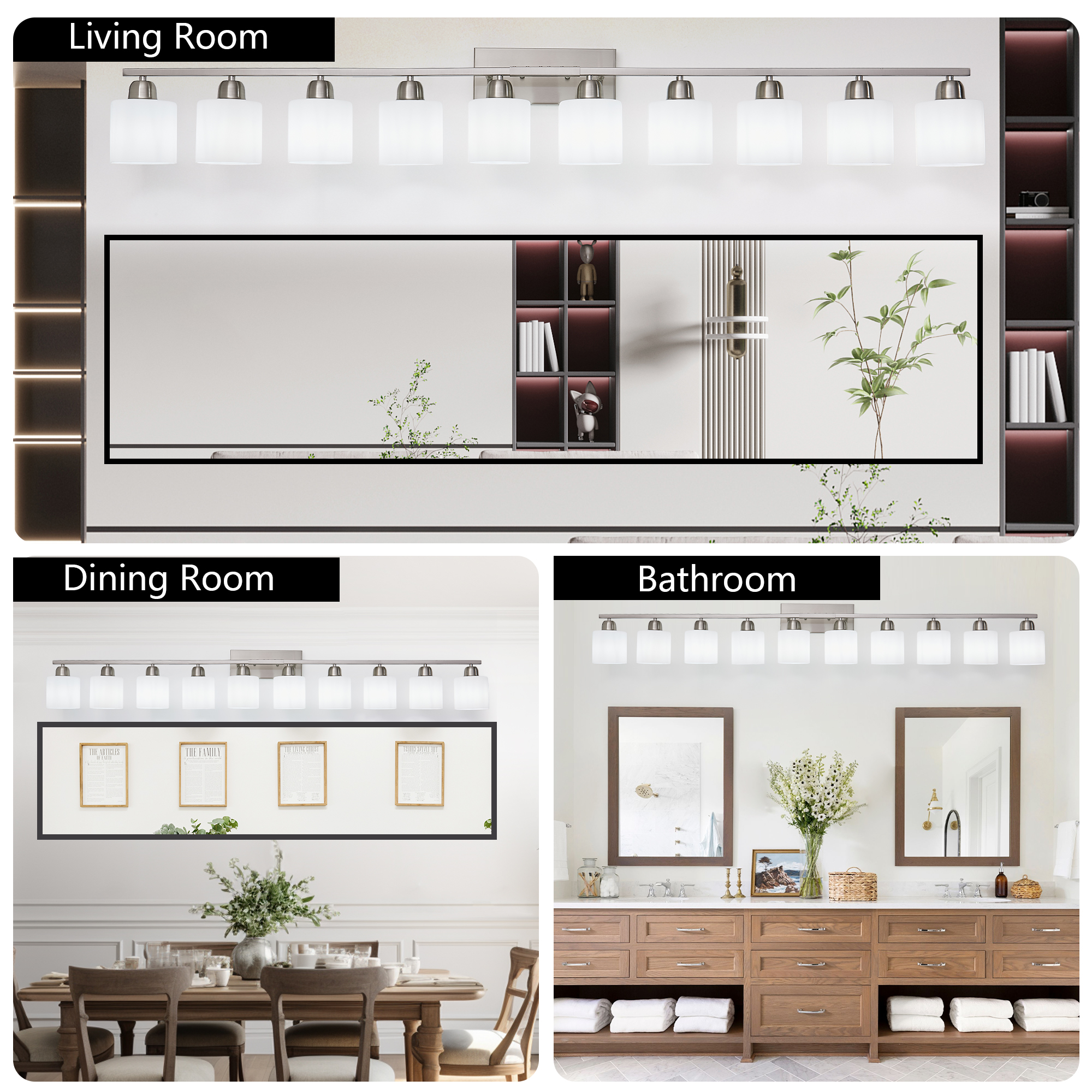 NEOSGO 10-Light Bathroom Light Fixtures, 6552inch Nickel Vanity Light with Milky White Glass Shade, Modern Bathroom Wall Lights Over Mirror, Farmhouse Wall Sconces Lighting for Bedroom Living Room is designed to improve daily bathroom routines with a clearer mirror area and more useful lighting around the vanity space. The product presentation suggests a modern wall-mounted mirror intended for grooming, makeup, skincare, shaving, and other tasks that benefit from more even front-facing light. It works especially well in bathrooms, powder rooms, and remodeled vanity areas where customers want the mirror to provide both practical function and a cleaner visual upgrade. This type of mirror is a strong fit for shoppers looking to make the room feel brighter, more modern, and easier to use every day. Overall size is approximately 34.65 x 16.54 x 8.27 inches with a listed weight of 13.1. The current listing includes 10 product images, which help clarify the product shape, proportions, and visual placement in a real room setting.