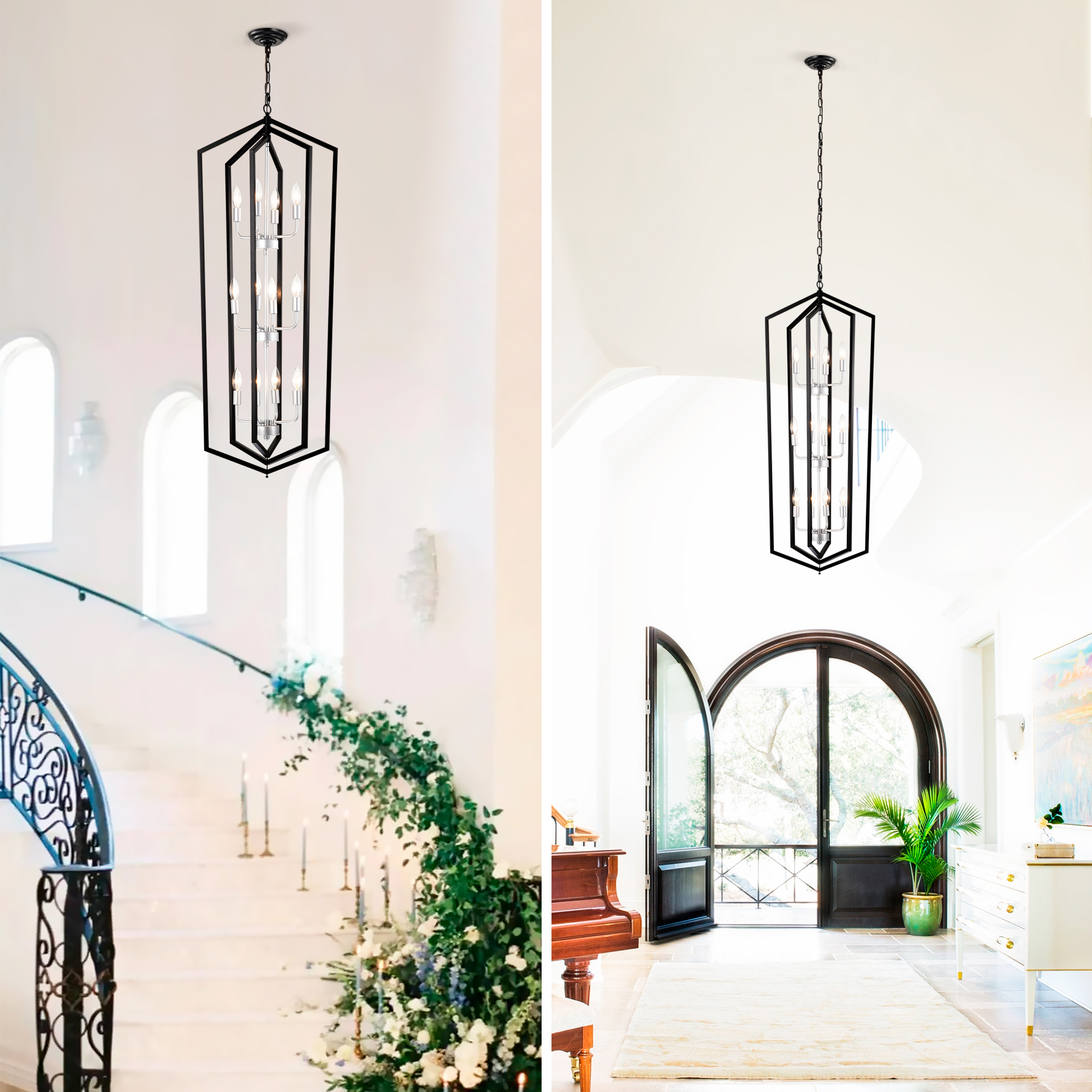 NEOSGO 12-Light Farmhouse Kitchen Chandeliers, Matte Black and Sliver Vintage Rustic Cage Light Fixture Adjustable Height Chandeliers for Dining Room Hallway Foyer Entryway(E12 Bulbs Not Included). Made to bring focused overhead illumination and decorative impact to dining areas, entryways, or other statement spaces. Product dimensions and weight: length 49.41, width 14.69, height 4.93, weight 14.06.