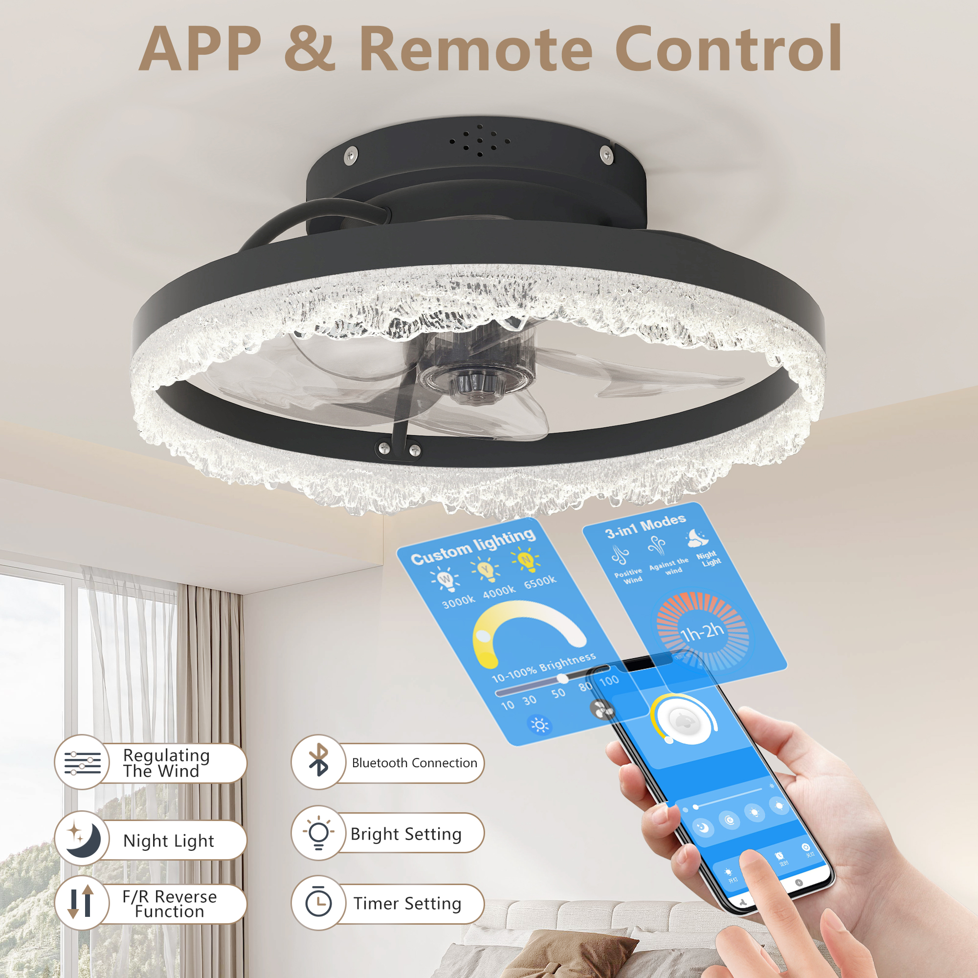 16" Decorative LED Ceiling Fan Light – Modern Flush Mount with Crystal-Inspired Acrylic Ring, Hidden Blades, Remote Control, and Dimmable Light for Stylish Homes (Black)