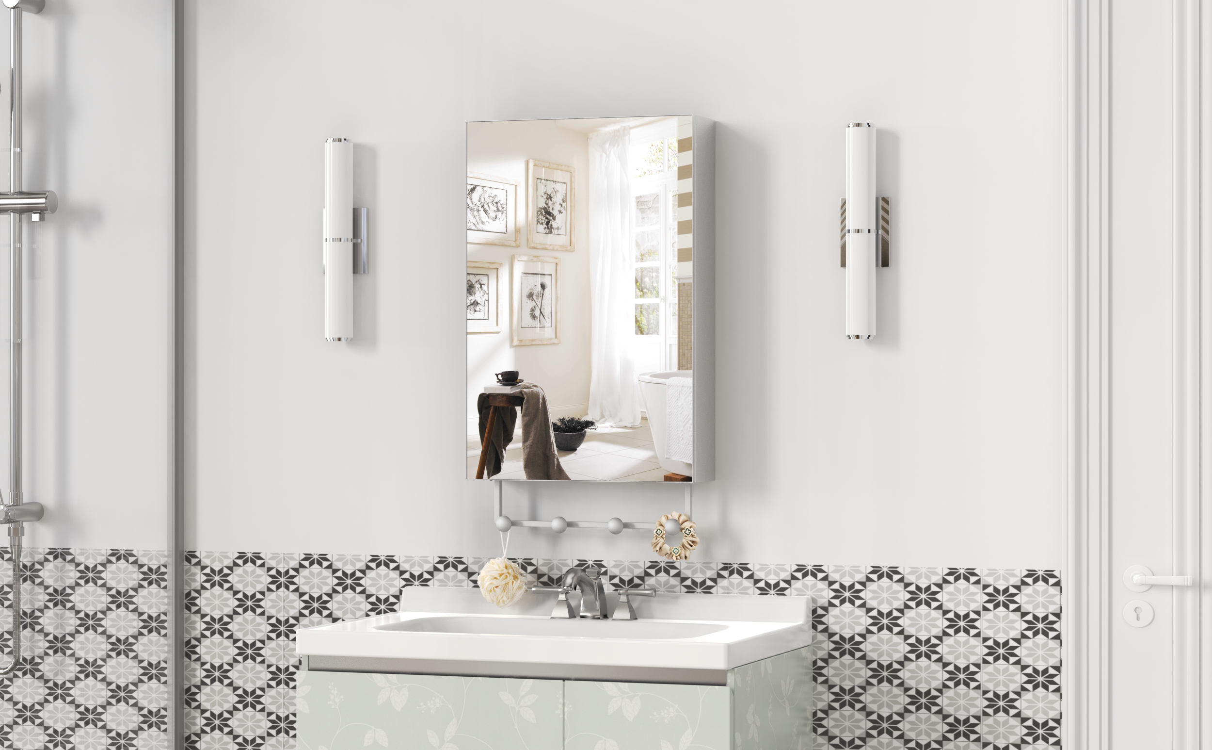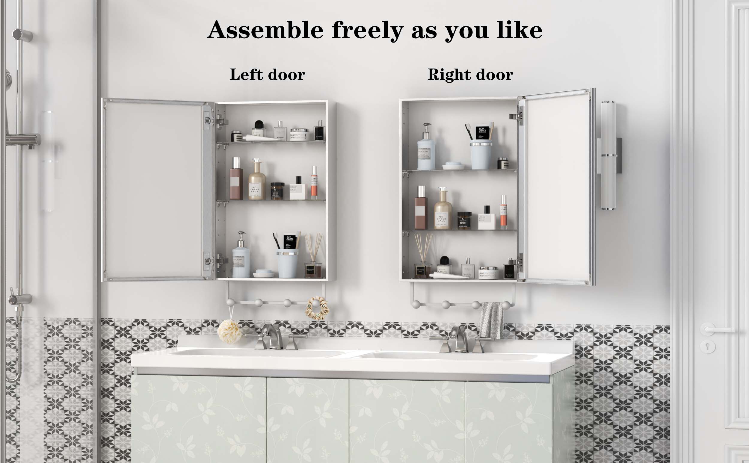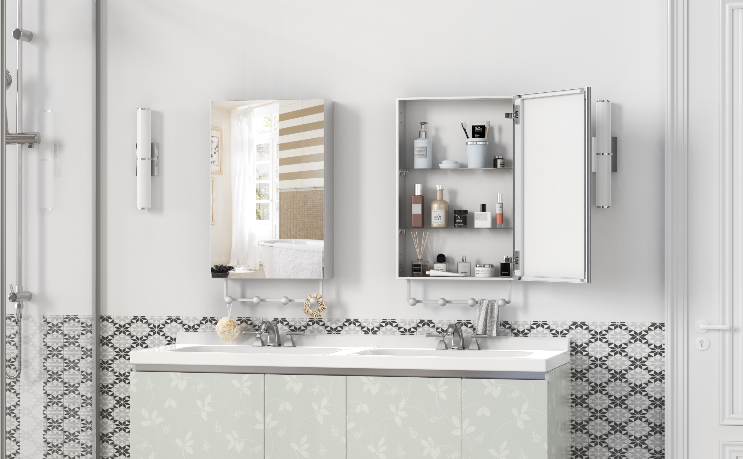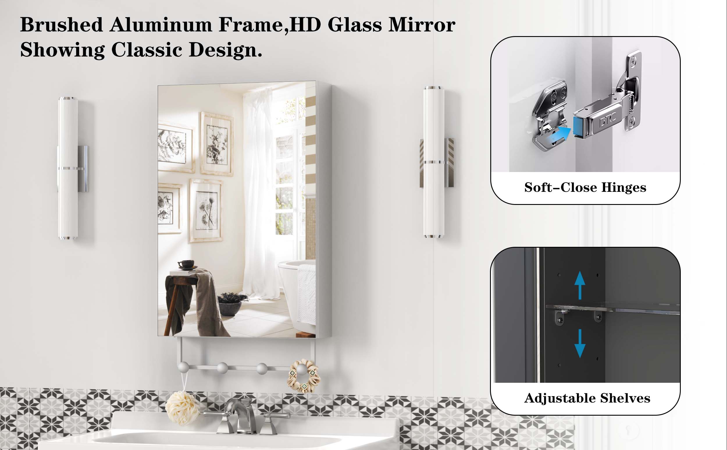BEAUTME 16'' x 24'' Medicine Cabinet with Mirror for Bathroom, Wall Mounted Bathroom Mirror with Storage, Adjustable Shelves, Aluminum Framework, Surface Mount Silver. Designed to provide practical task lighting around a vanity or bathroom mirror while supporting everyday grooming routines. Material: Aluminium. Product dimensions and weight: length 27.1, width 18.3, height 3.3, weight 12.7.