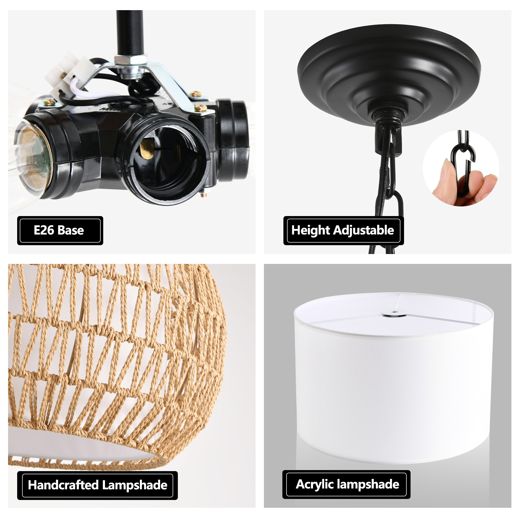 18" Farmhouse Pendant Light with Adjustable Height, Boho Woven Jute Rope Hanging Ceiling Light Fixture, E26 Base, 60W Max, Compatible with Flat, Vaulted, and Sloped Ceil (Bulb Not Included)