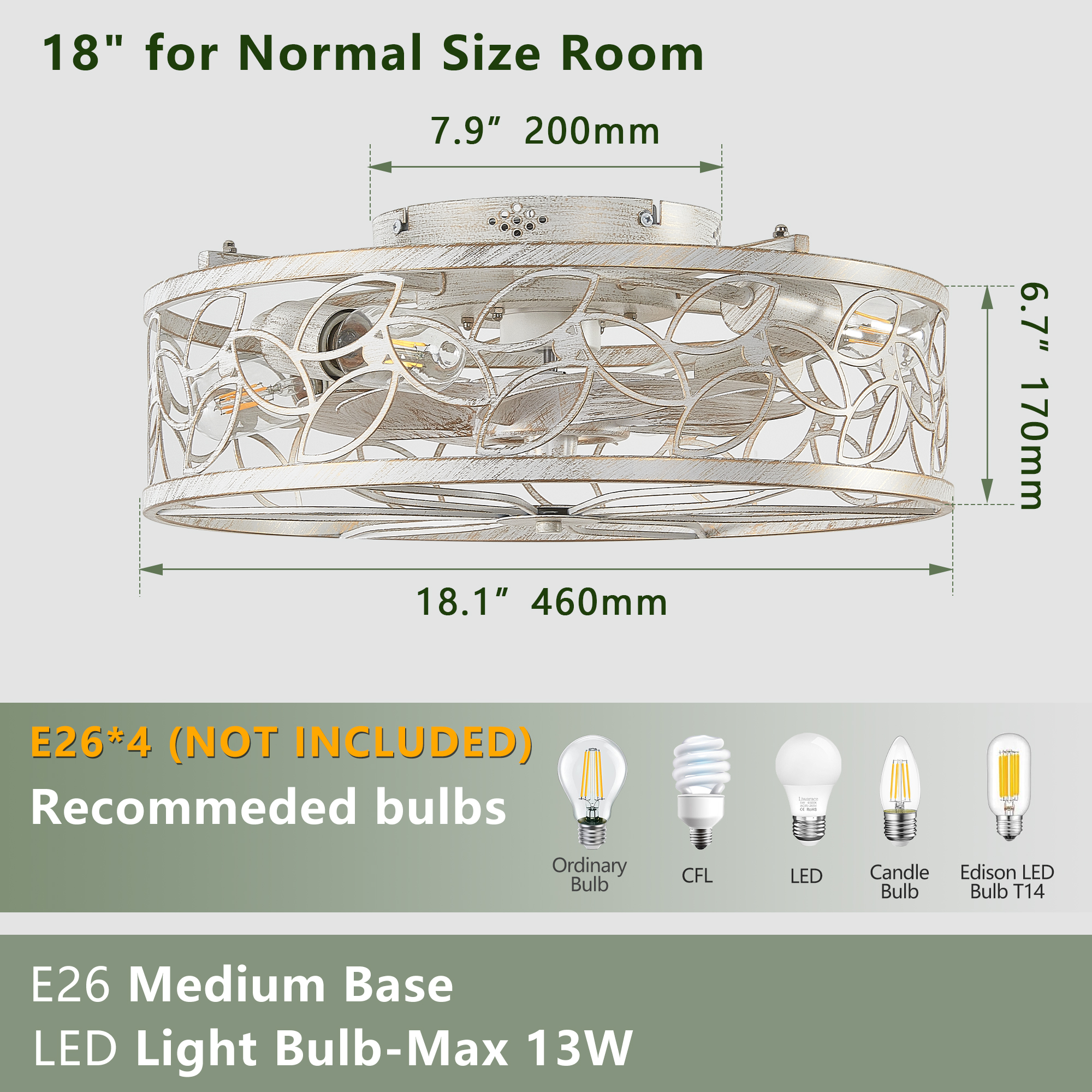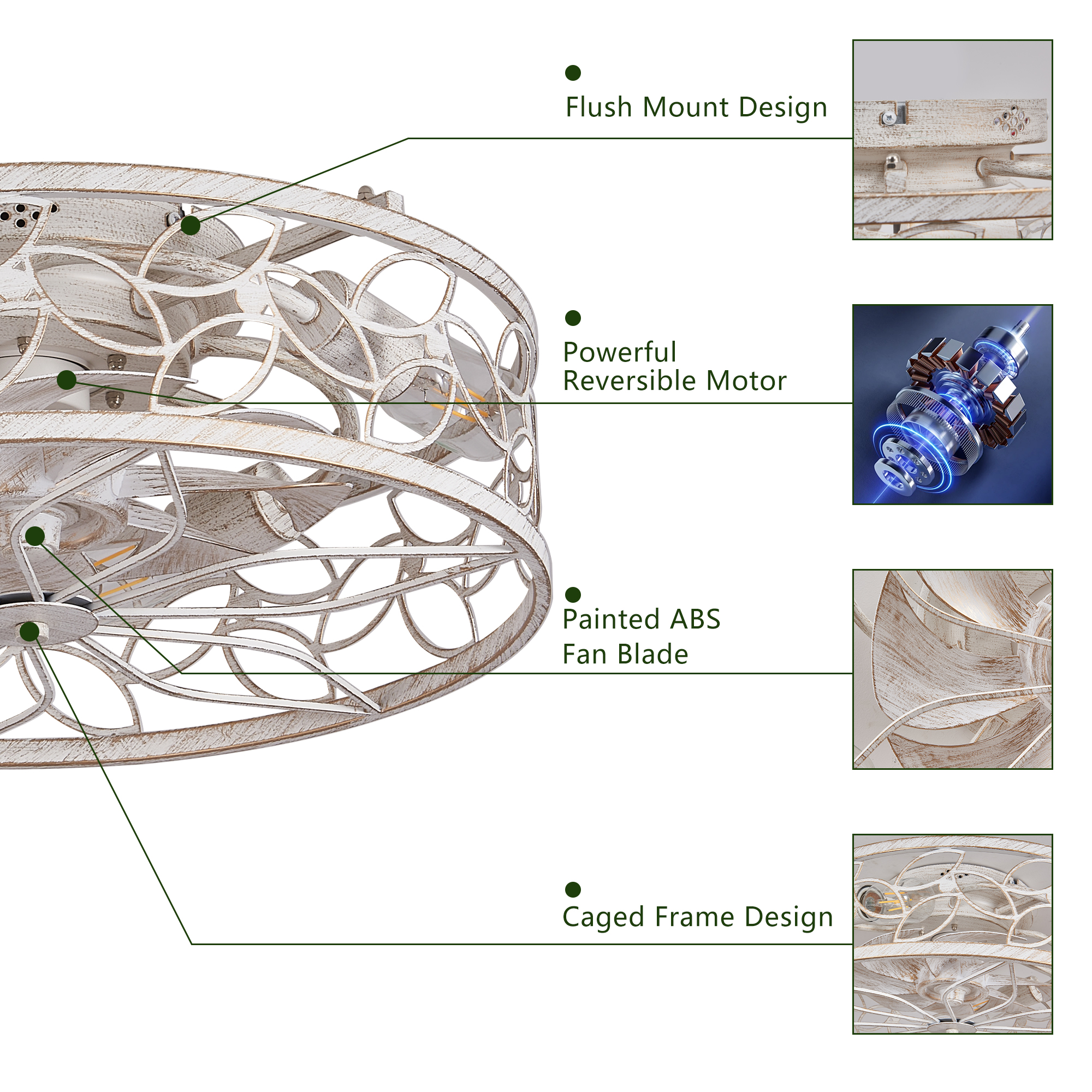 NEOSGO 18-inch White Vintage Caged Ceiling Fan Light – Quiet Operation, Remote Control, Industrial Style for Living Room, Bedroom, and Kitchen (Silent/6-Speed/Reversible/DC Motor) (Bulb Not Included) combines ceiling lighting and airflow in one fixture, making it useful for rooms that need everyday comfort as well as a more finished overhead look. The caged or close-to-ceiling style shown in the product presentation helps it work well in spaces where customers want decorative character without the visual bulk of a larger hanging fixture. It is well suited for kitchens, dining rooms, bedrooms, living areas, and similar spaces where air movement, ambient light, and a coordinated design all matter. This is a practical choice for customers who want to save ceiling space while improving comfort and keeping the room visually polished. Overall size is approximately 19.69 x 19.09 x 7.87 inches with a listed weight of 9.8. The current listing includes 9 product images, which help clarify the product shape, proportions, and visual placement in a real room setting.
