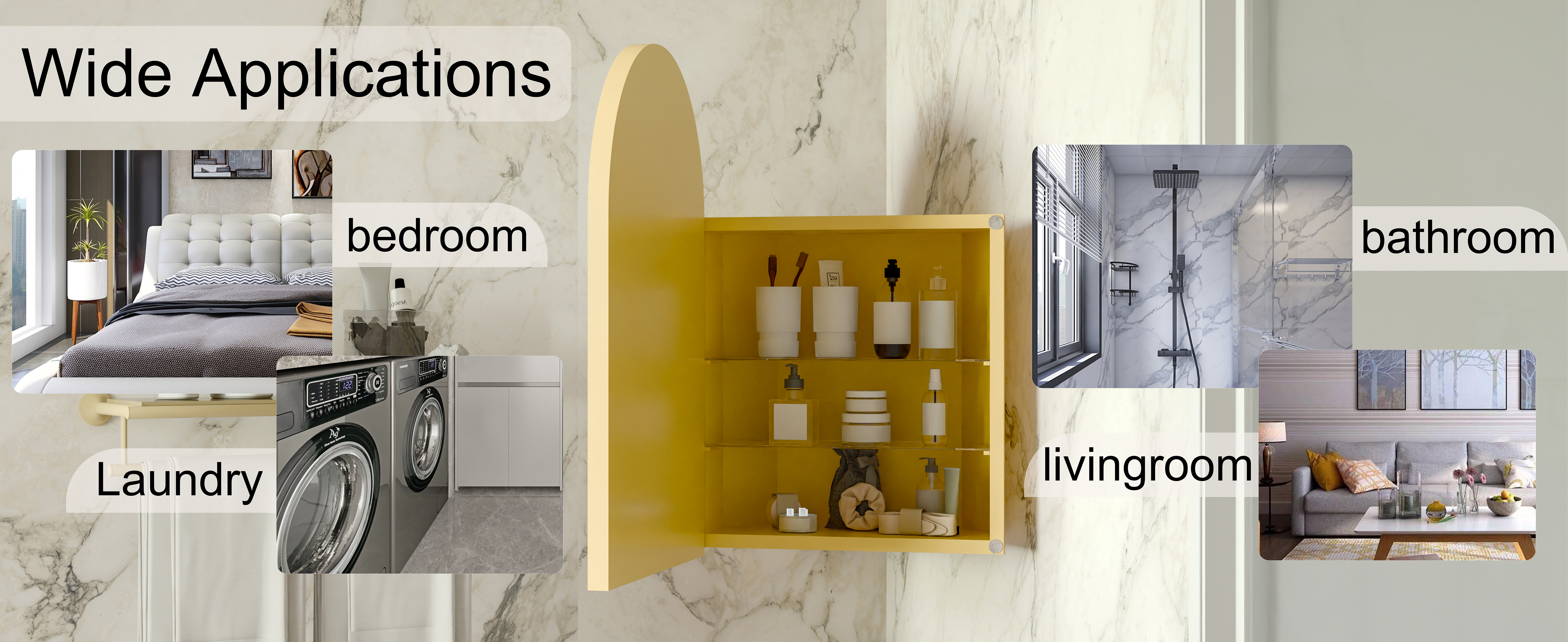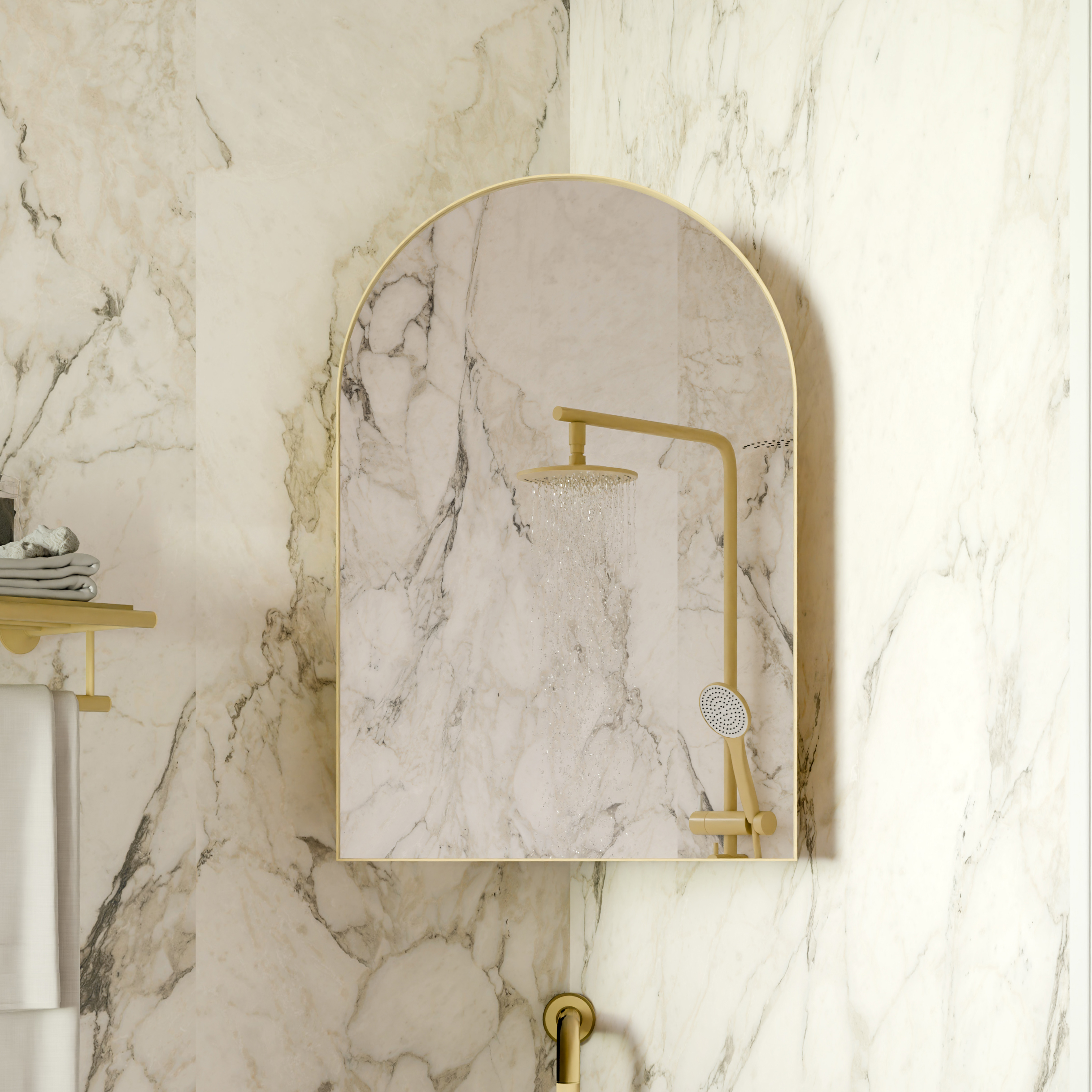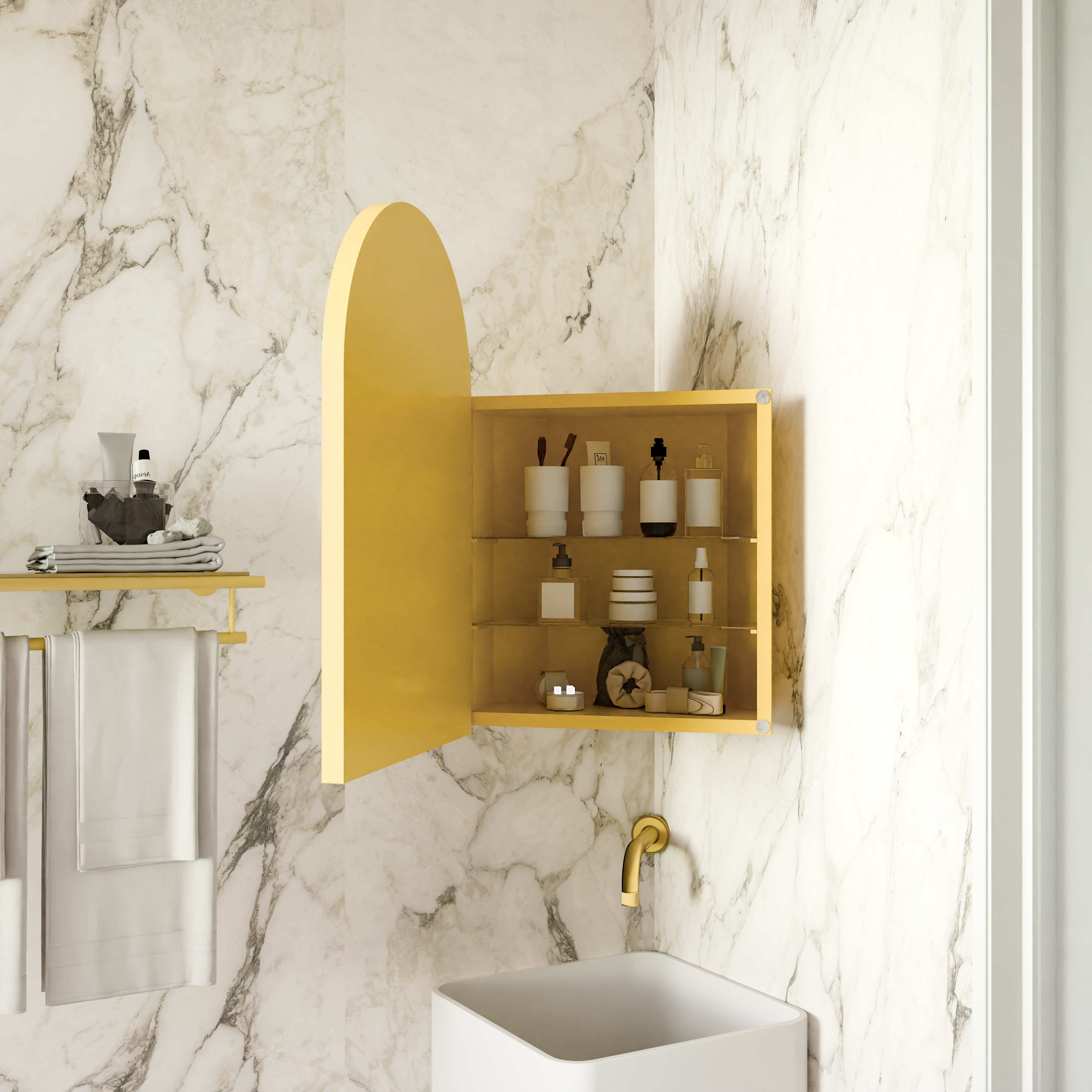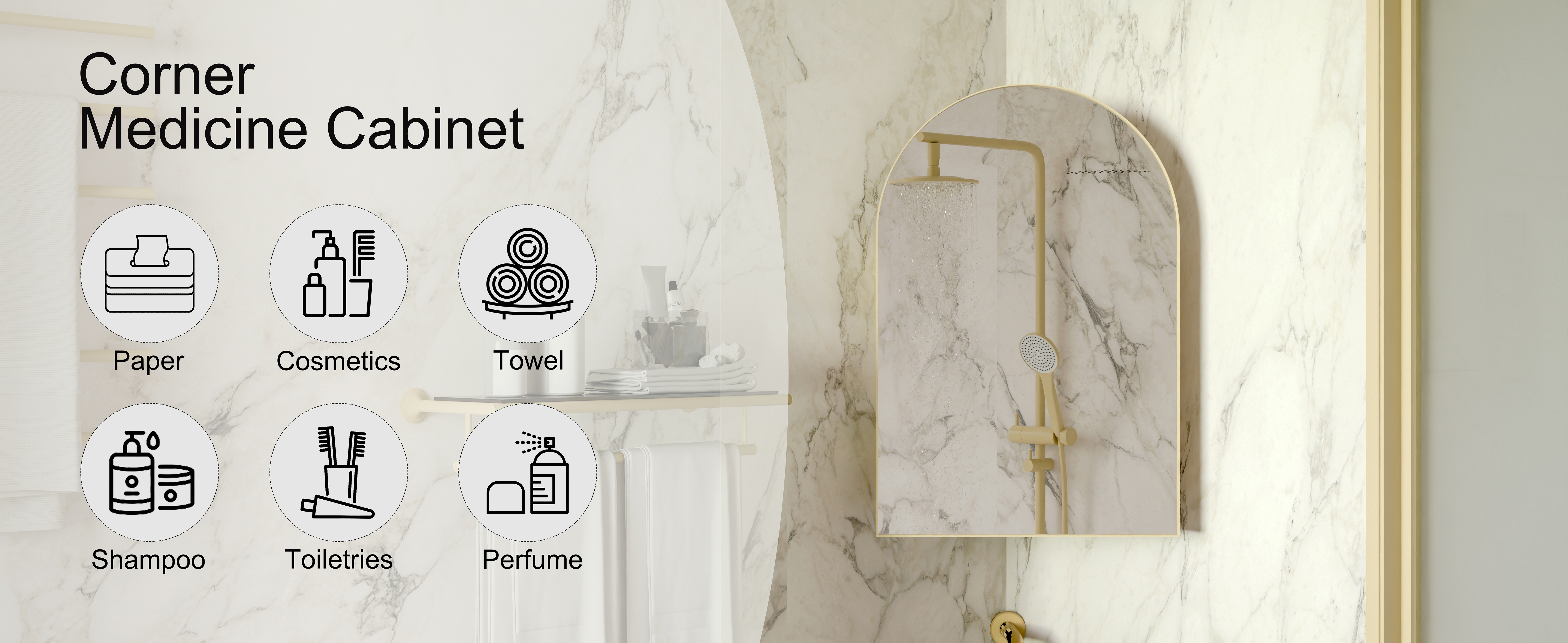 FS Furniture 18x24 Inch Metal Corner Medicine Cabinet with Arched Mirror, Adjustable Glass Shelves, Space-Saving Bathroom Storage Organizer for Small Spaces, Matte Gold. Designed to provide practical task lighting around a vanity or bathroom mirror while supporting everyday grooming routines. Material: Metal. Product dimensions and weight: length 26.8, width 9.5, height 20.9, weight 20.9.