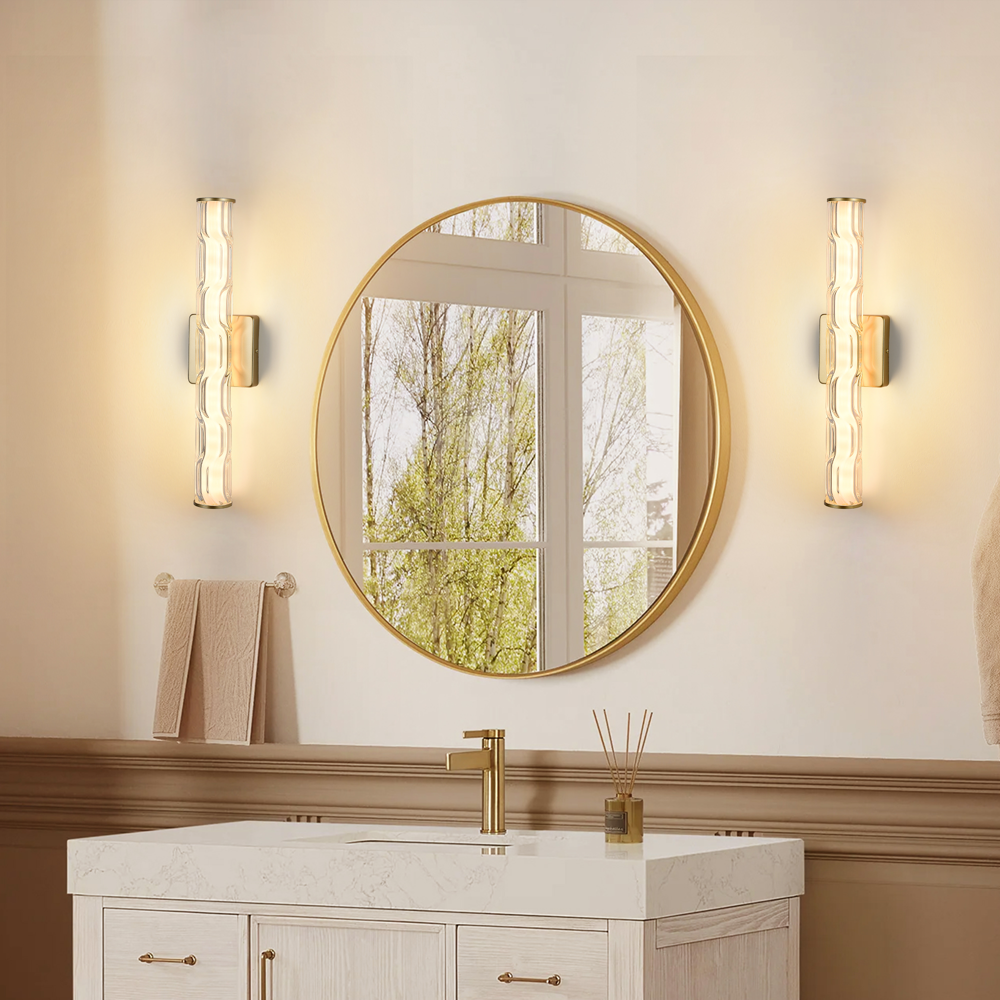 NEOSGO 19.7'' Gold Bathroom Wall Sconce Set of 2, Modern Single Sconce Wall Lighting, Upgrated K9 Crystal Bronze Wall Light, Bedroom Vanity Sconce, Wall Lamp for Living Room, Stairway, Hallway is intended to provide focused wall lighting while also adding decorative detail to the surrounding space. This style is especially useful near mirrors, over bathroom vanities, along hallways, in bedrooms, or in accent areas that benefit from directed light rather than relying only on ceiling fixtures. Based on the product presentation, it offers a practical mix of daily illumination and visual styling, which helps the room feel more complete and intentionally designed. It is a good option for customers who want better task lighting together with a more refined finished look on the wall. Overall size is approximately 22 x 12.6 x 5.9 inches with a listed weight of 9. The current listing includes 10 product images, which help clarify the product shape, proportions, and visual placement in a real room setting.