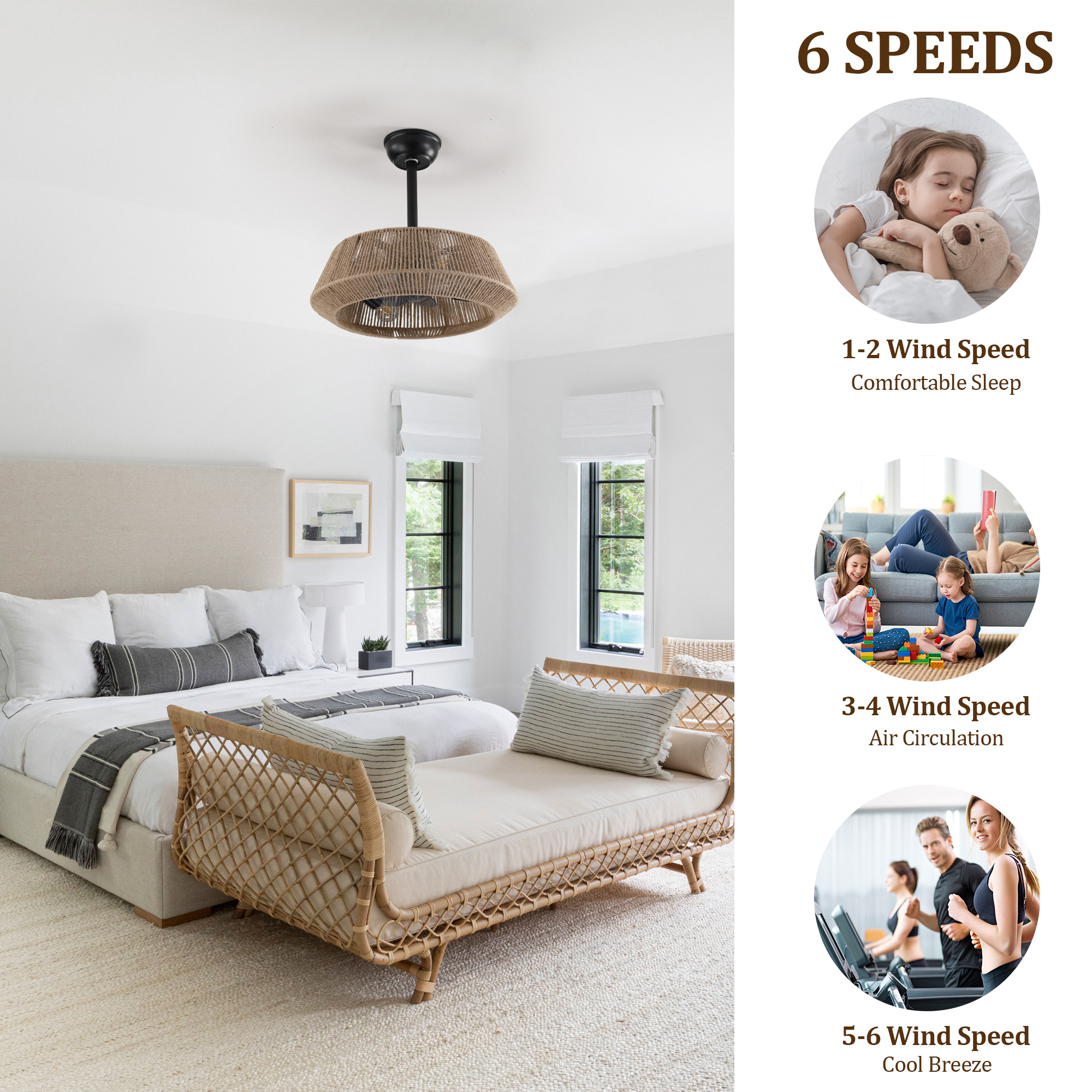 19" Bedroom Fan Light with Rope Suspension with 4 Bulbs, Dimmable, 7 Dlades, Reversible DC Motor