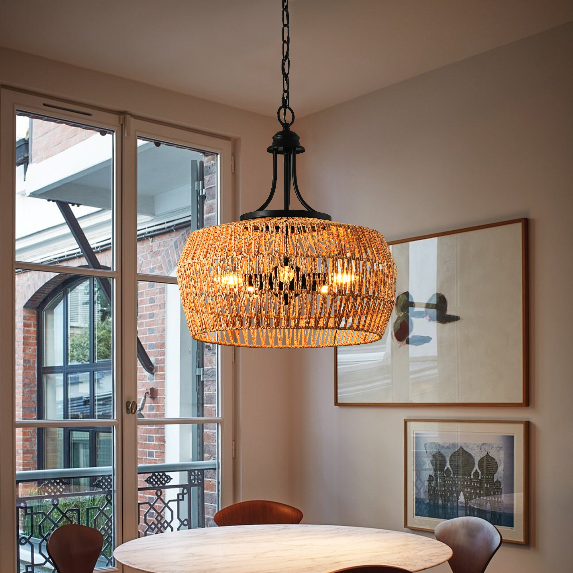 19" Boho Hemp Rope Pendant Light, Hand-Woven Jute Hanging Lamp with Adjustable Chain, Natural Rope Shade Ceiling Light Fixture for Kitchen Island, Dining Room, or Entryway (Bulb Not Included)
