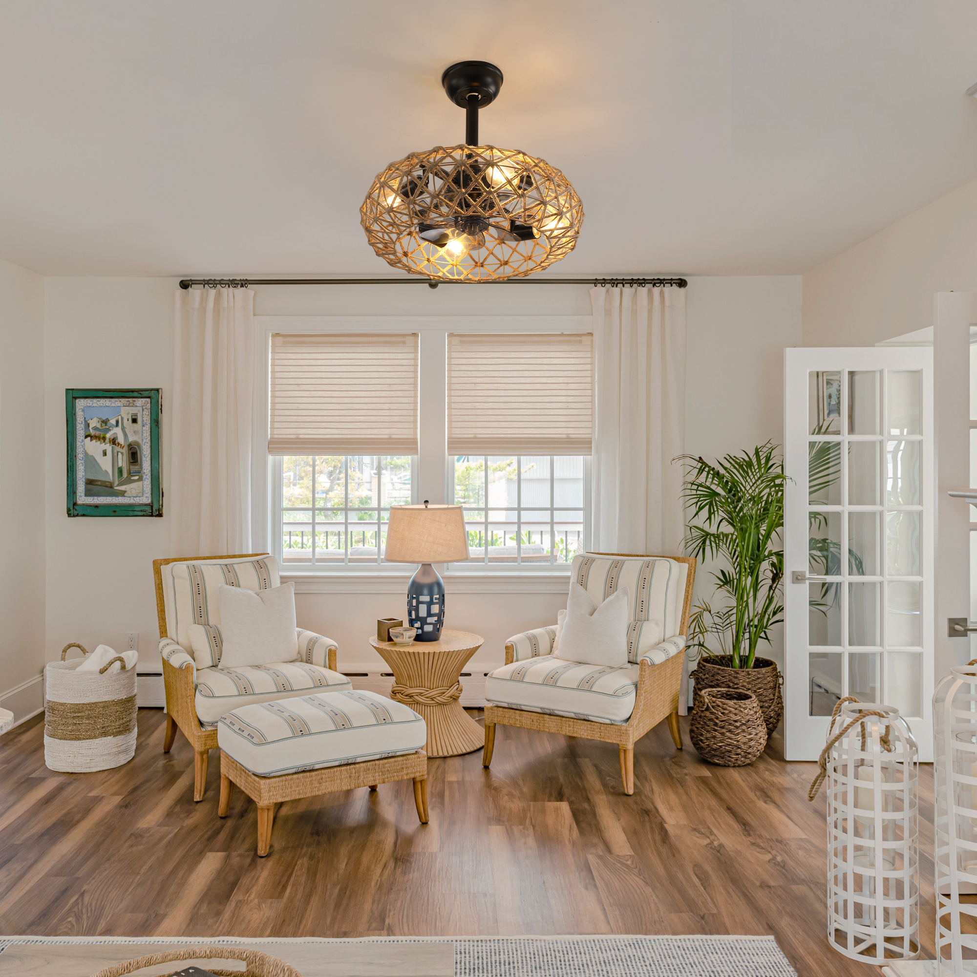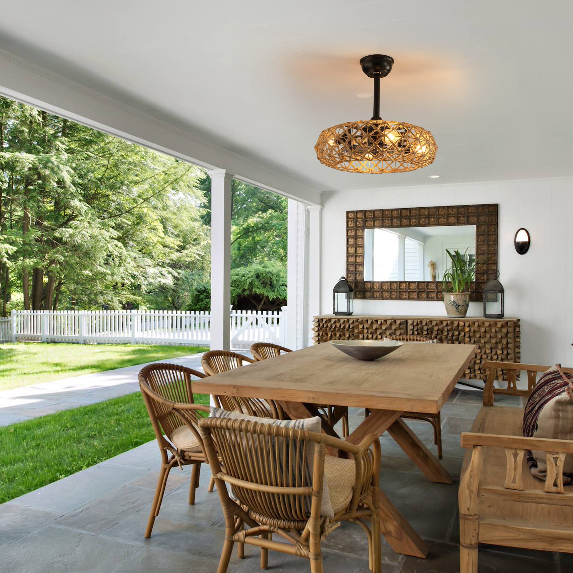 NEOSGO 19" Hemp Rope Woven Ceiling Fan with 4 bulbs, Dimmable, 7 Blades, Reversible DC motor. combines ceiling lighting and airflow in one fixture, making it useful for rooms that need everyday comfort as well as a more finished overhead look. The caged or close-to-ceiling style shown in the product presentation helps it work well in spaces where customers want decorative character without the visual bulk of a larger hanging fixture. It is well suited for kitchens, dining rooms, bedrooms, living areas, and similar spaces where air movement, ambient light, and a coordinated design all matter. This is a practical choice for customers who want to save ceiling space while improving comfort and keeping the room visually polished. Overall size is approximately 20.08 x 9.45 x 20.08 inches with a listed weight of 13.01. The current listing includes 9 product images, which help clarify the product shape, proportions, and visual placement in a real room setting.