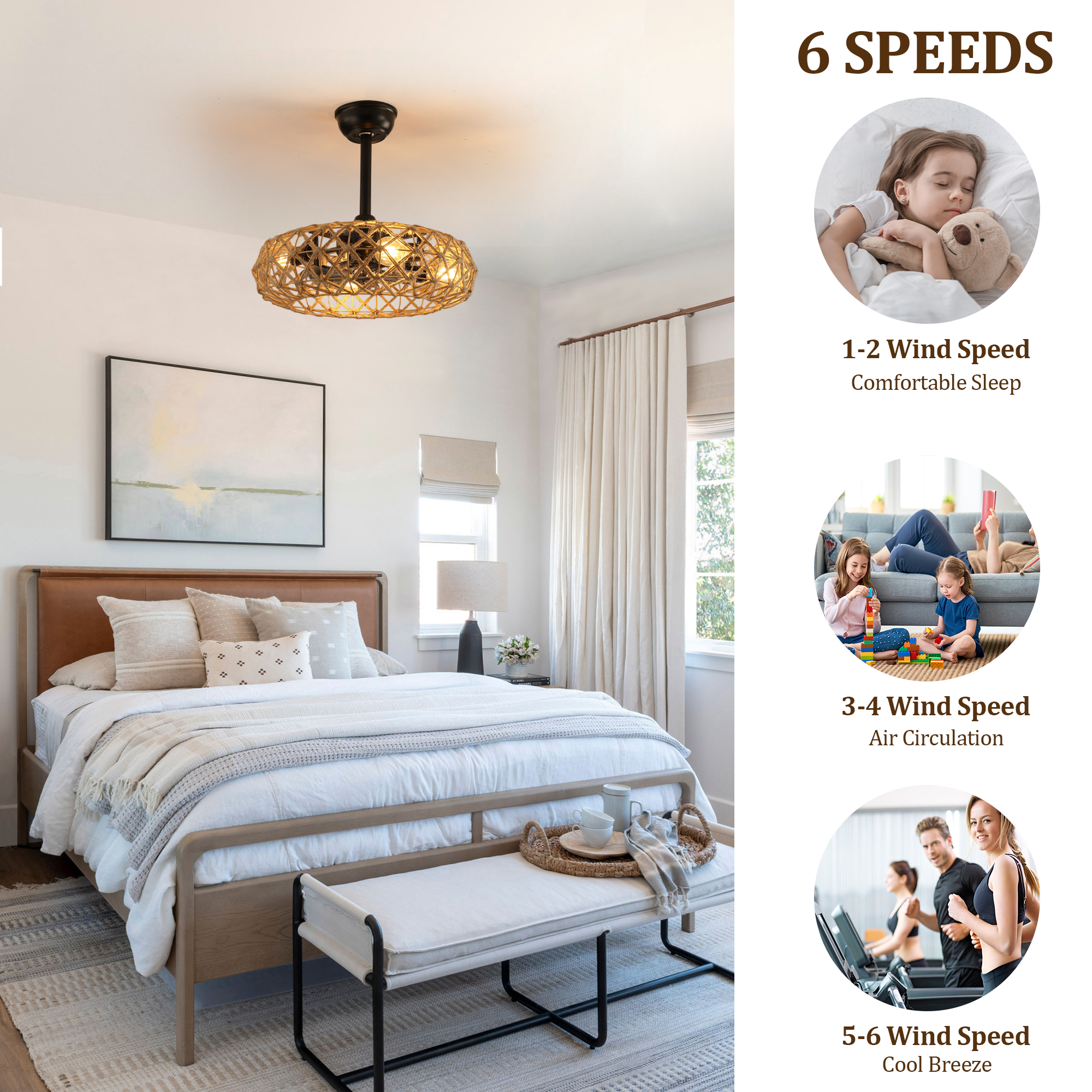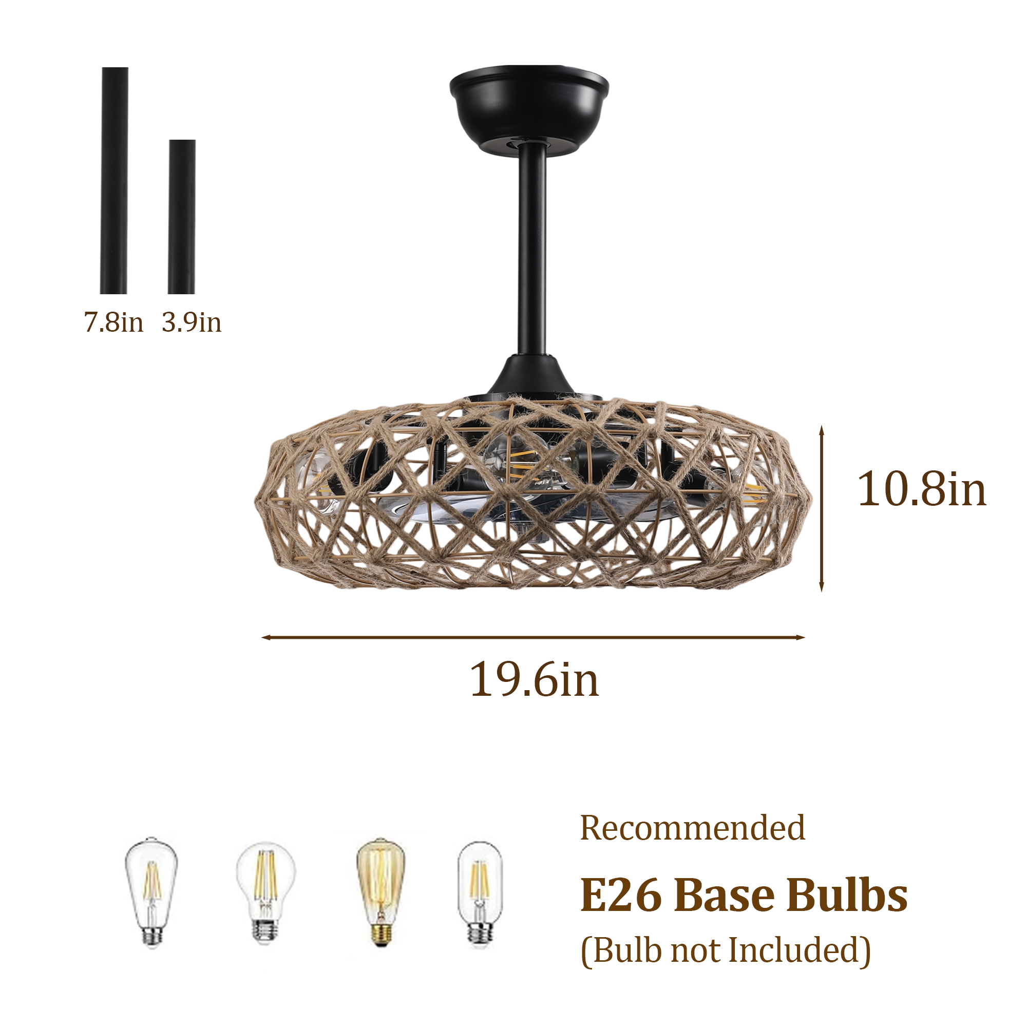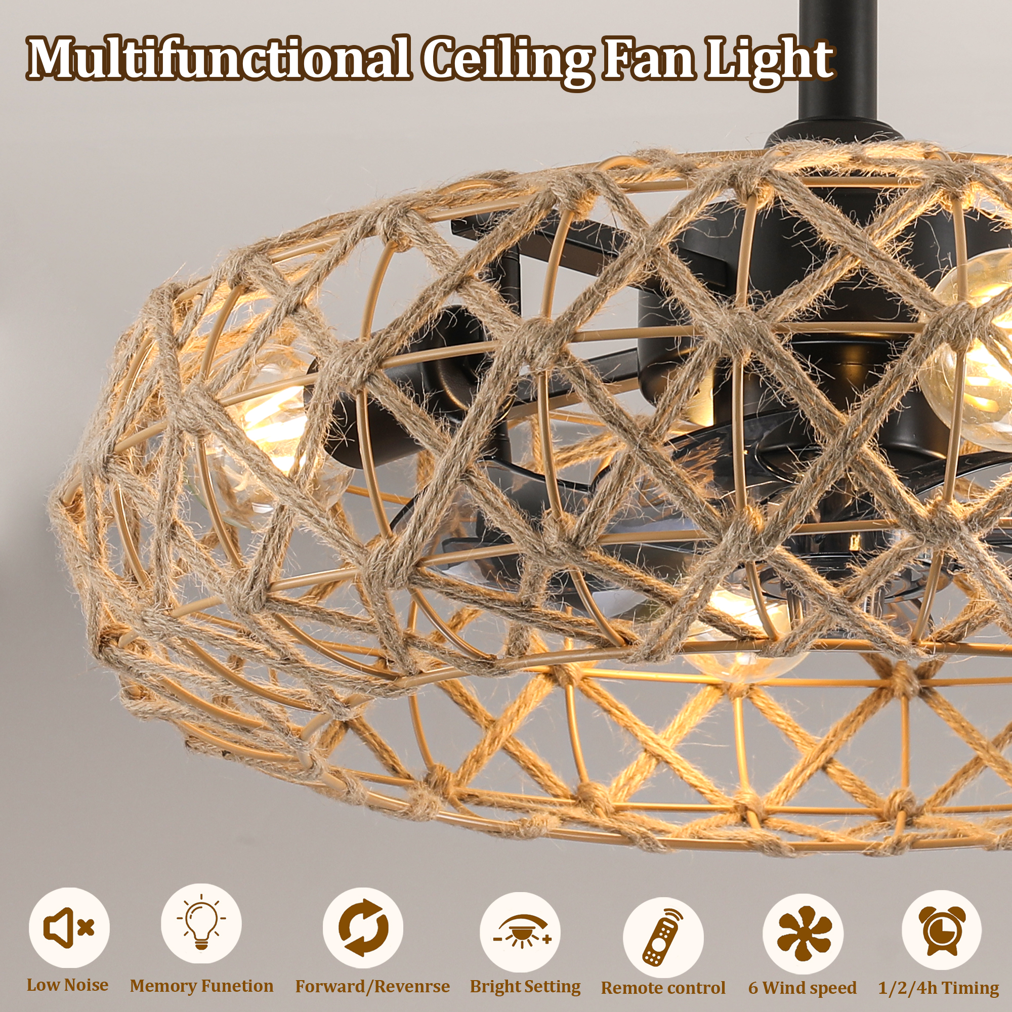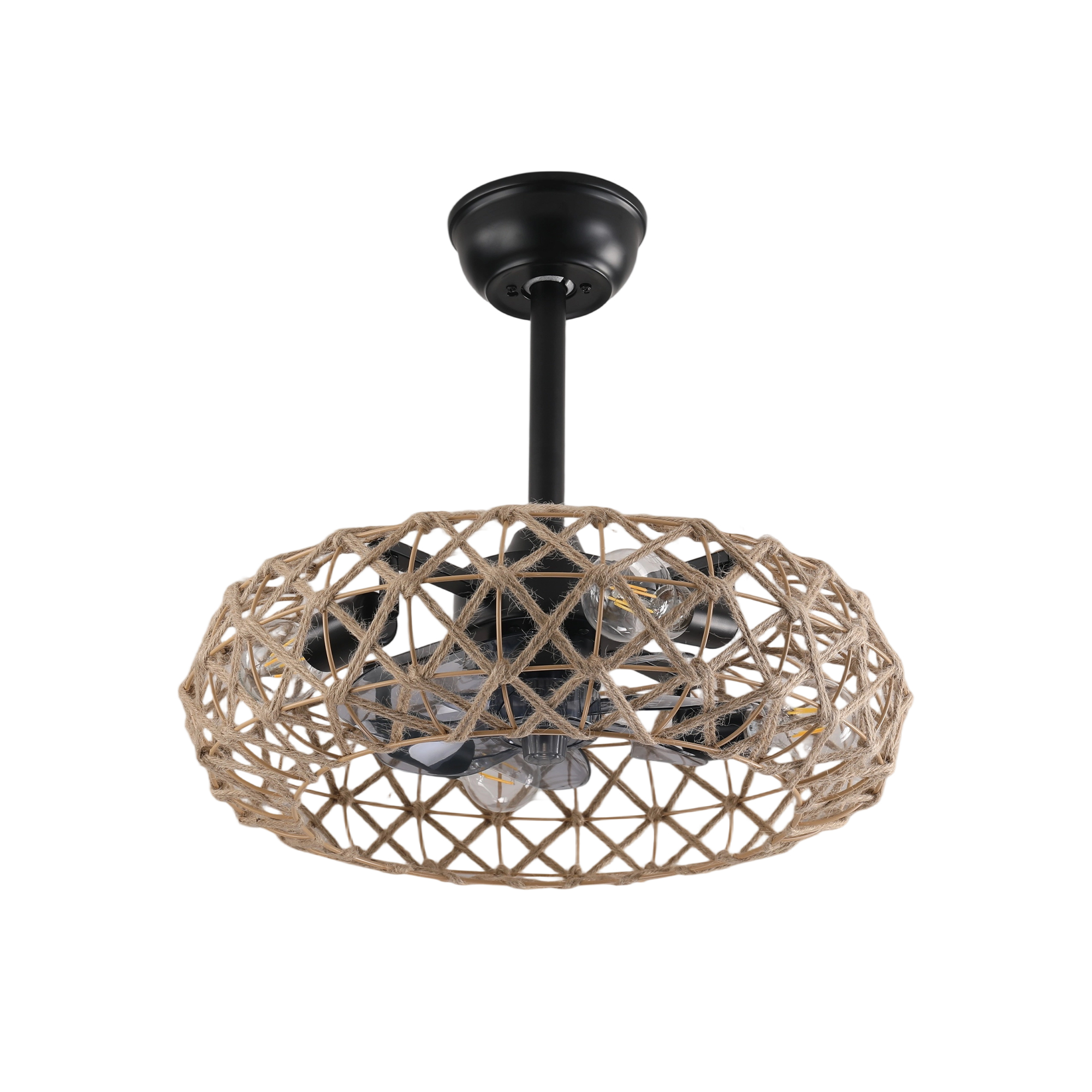 19" Hemp Rope Woven Ceiling Fan with 4 bulbs, Dimmable, 7 Blades, Reversible DC motor.