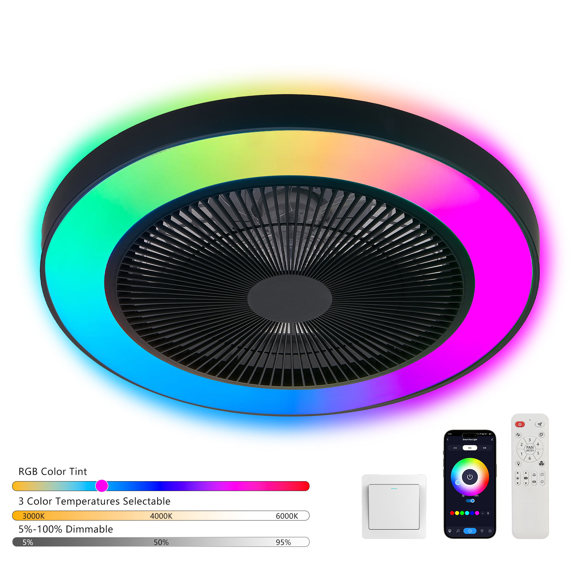<div style="width:100%; margin-top:24px;display:flex;align-items:center;"> <div style="width: 33%;position: relative;"> <div style="width:100%;position: relative;padding-top: 100%;"> <img src=https://b2bfiles1.gigab2b.cn/image/wkseller/15543/67a50dffdd9e7e4cc043249f3d815535.jpg?x-cc=10&x-cu=15543&x-ct=1748588400&x-cs=4822509b492143ca8375680015d860ab alt="" style="max-width: 100%;display:block;max-height: 100%;position: absolute;left: 50%;top: 50%;transform: translate(-50%,-50%);"> </div> </div> <div style="flex: 1;margin-left:24px;"> <div style="font-size: 16px; font-weight:bold;line-height:24px;color: #333333;word-break: break-word;">19-inch Black and White Ceiling Fan Light with LED RGB – Dimmable and Color-Changing, APP & Remote</div> <div style="margin-top:12px;word-break: break-word;white-space:pre-line;line-height:18px;">Material: Iron + ABS Color: Black + White Light Source Type: LED RGB Brightness Adjustment: Support Dimming Installation Mode: Ceiling Power Supply Mode: Hard-wired Support Control: APP & Remote Control Color Temperature: 3000K-4000K-6000K Color Rendering Index: 80 Wattage: 32W Voltage: 110V </div> </div> </div>