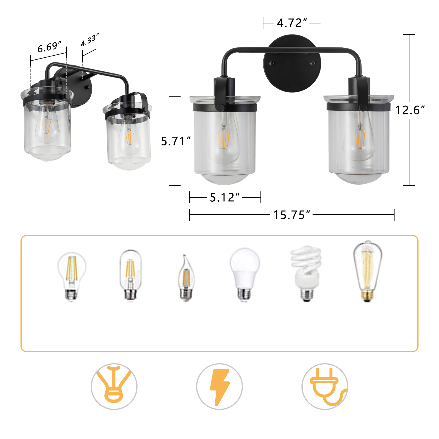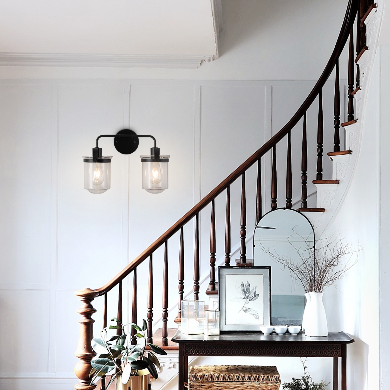 NEOSGO 2-Light with Clear Glass Shade, Modern Sconce, Industrial Indoor Light Fixture for Bathroom Living Room Bedroom Over Kitchen Sink, E26 Socket, [No Bulb]. Works well as accent or supplemental wall lighting for hallways, bedrooms, bathrooms, and other interior spaces. Product dimensions and weight: length 16.14, width 8.66, height 7.48, weight 4.47.