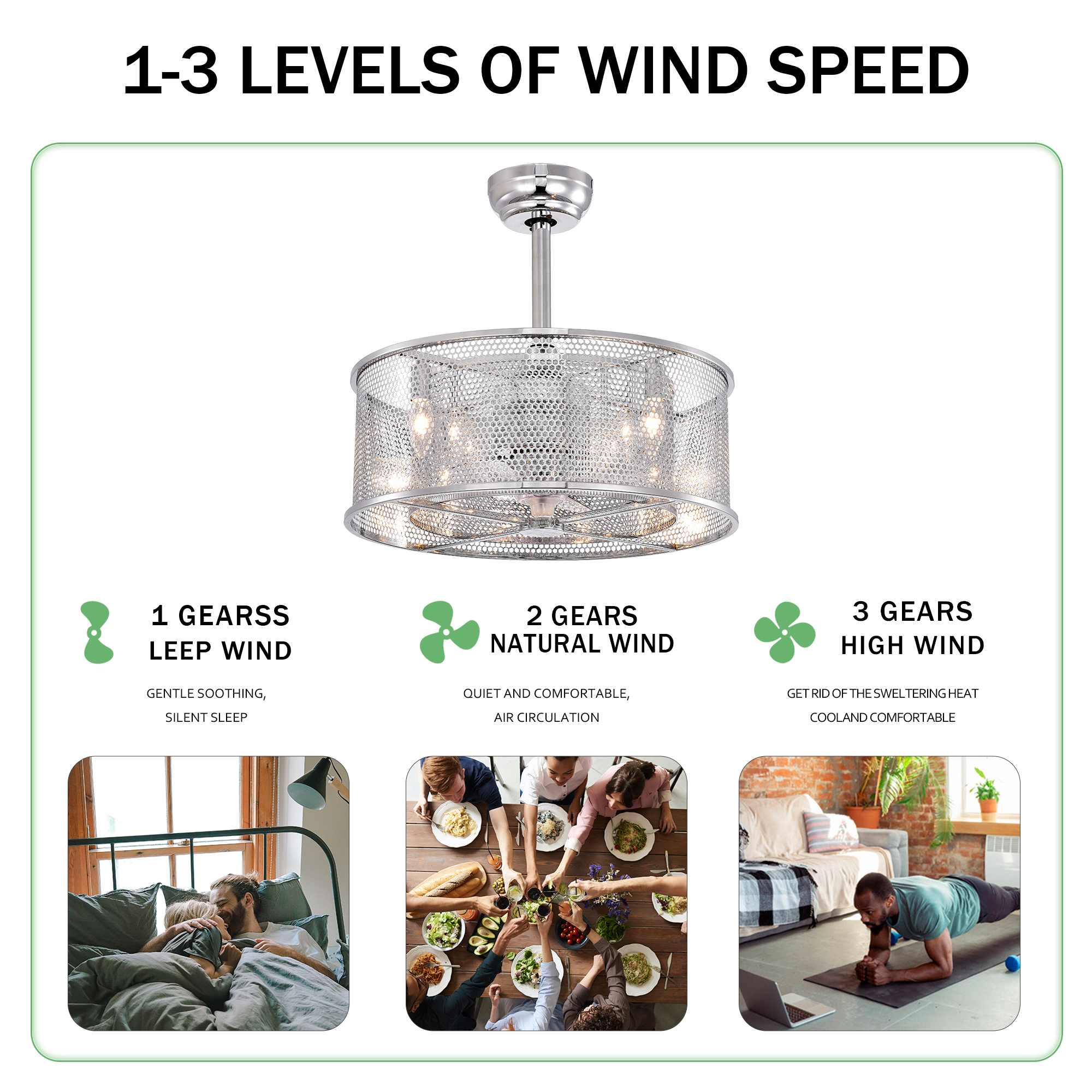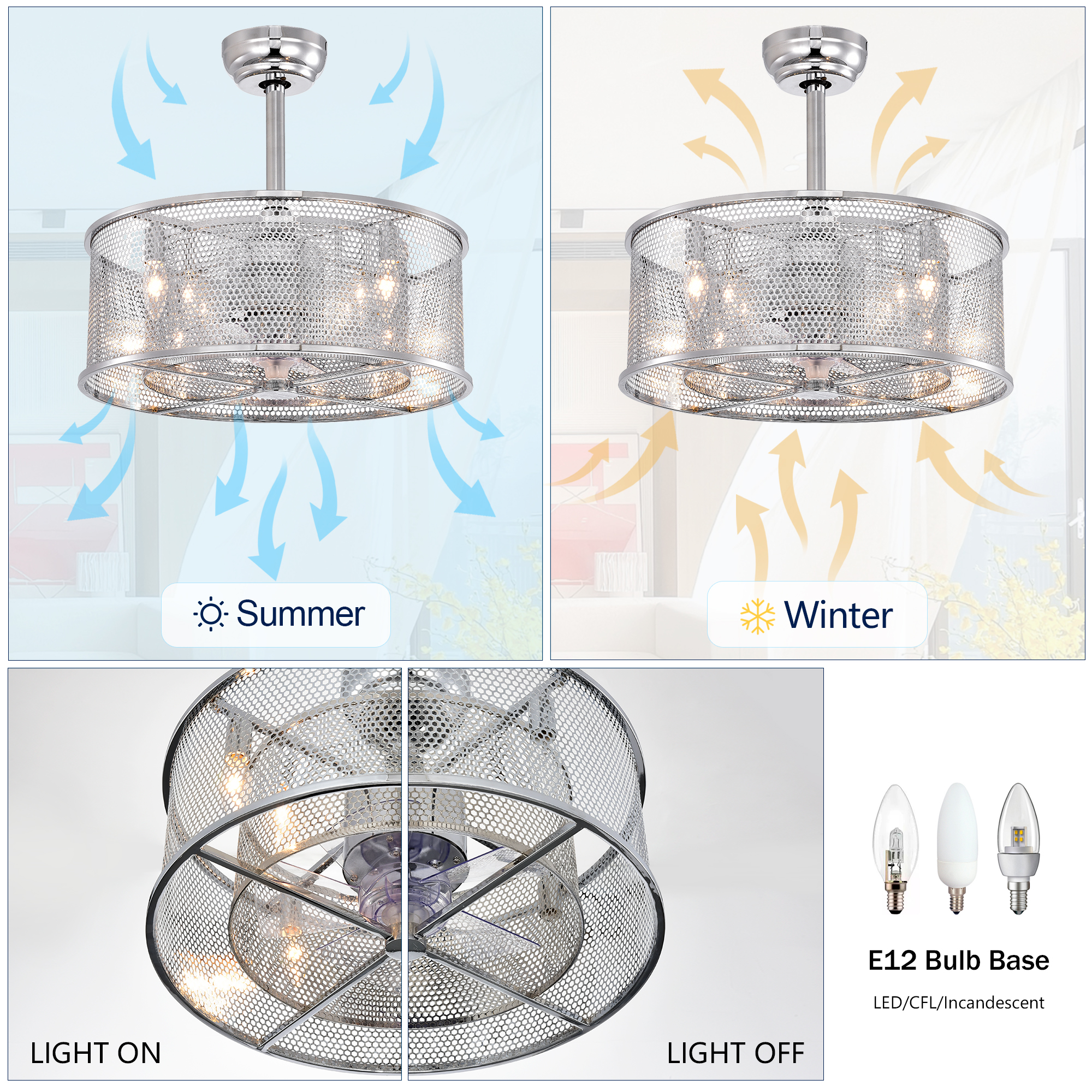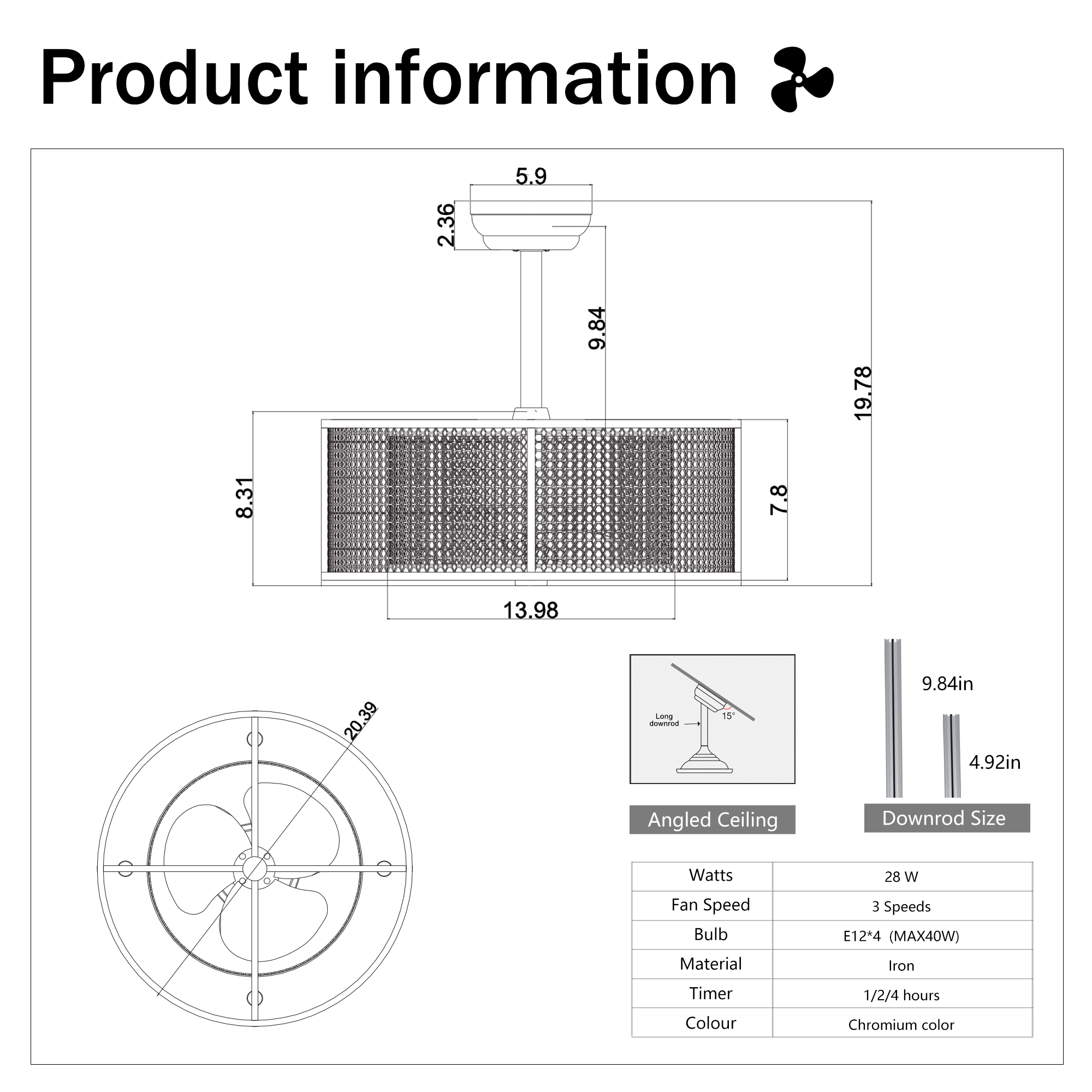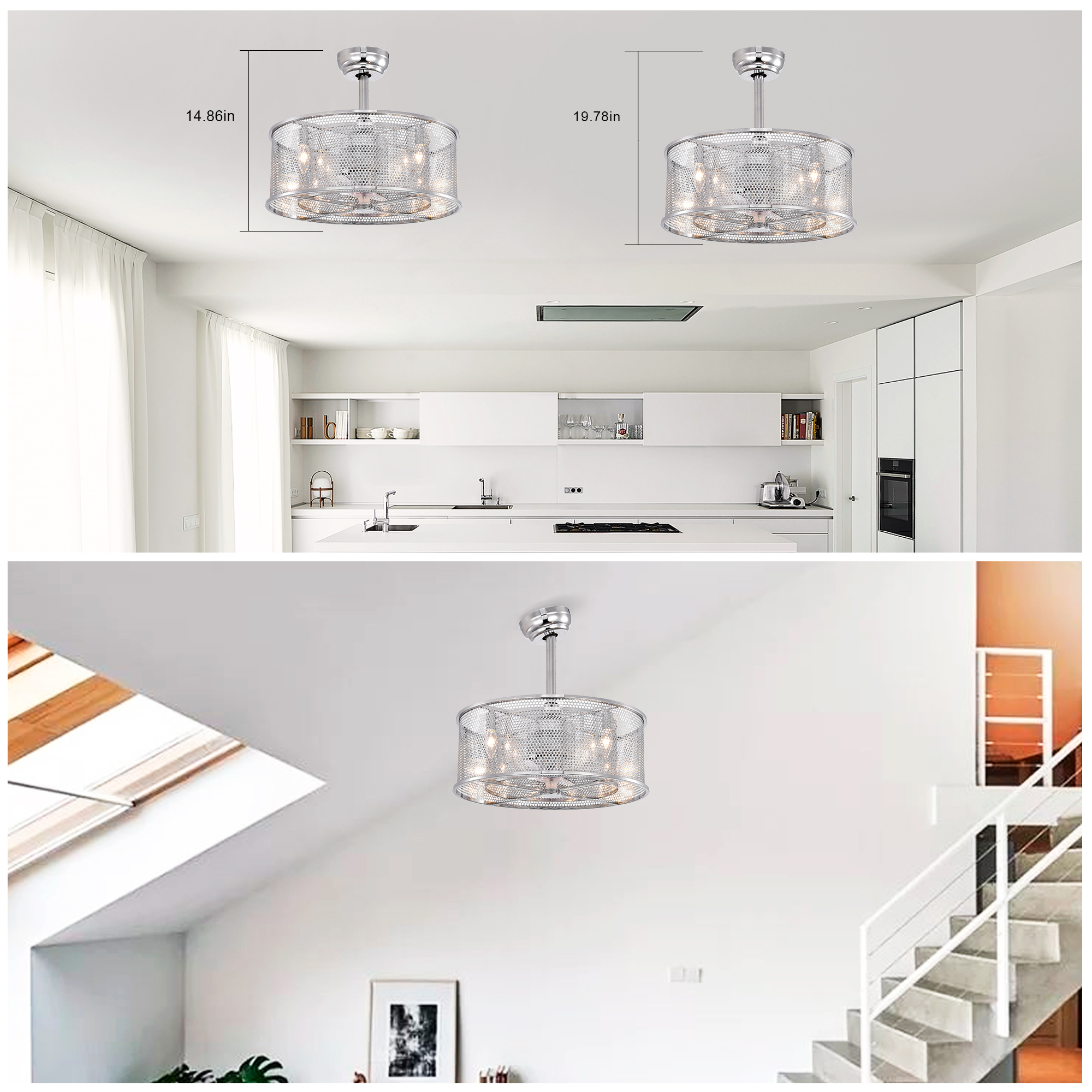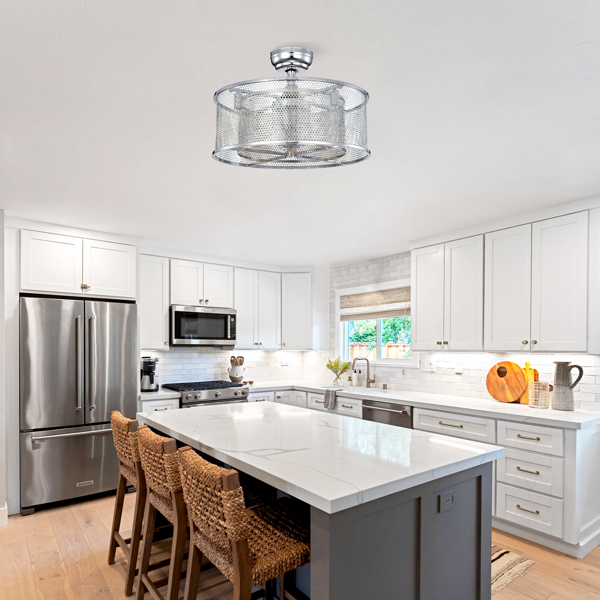 NEOSGO 20.4'' 3 ABS Fan Blades Dual Shade Modern Ceiling Fan with Remote Control, Noiseless Reversible AC Motor for Bedroom/Living Room/Study/Patio,Chrome combines ceiling lighting and airflow in one fixture, making it useful for rooms that need everyday comfort as well as a more finished overhead look. The caged or close-to-ceiling style shown in the product presentation helps it work well in spaces where customers want decorative character without the visual bulk of a larger hanging fixture. It is well suited for kitchens, dining rooms, bedrooms, living areas, and similar spaces where air movement, ambient light, and a coordinated design all matter. This is a practical choice for customers who want to save ceiling space while improving comfort and keeping the room visually polished. Overall size is approximately 20.9 x 20.9 x 13 inches with a listed weight of 15.4. The current listing includes 12 product images, which help clarify the product shape, proportions, and visual placement in a real room setting.