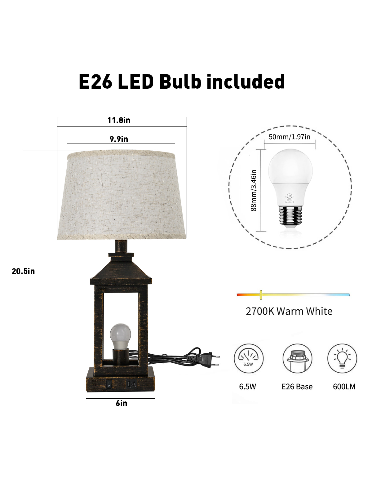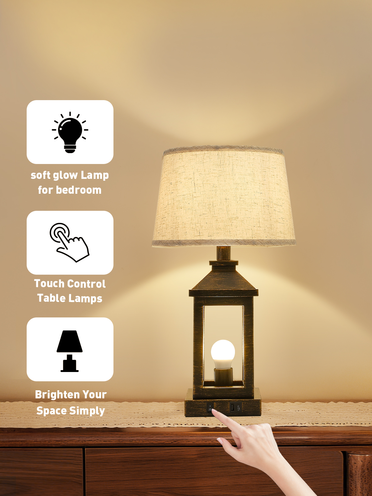 20.5in Black Gold Farmhouse Bedside Table Lamp, Suitable For Living Rooms, 3-Way Dimmable Touch Modern Bedside Table With 2 Lights For Bedrooms, Homes, Offices (Including Light Bulbs)