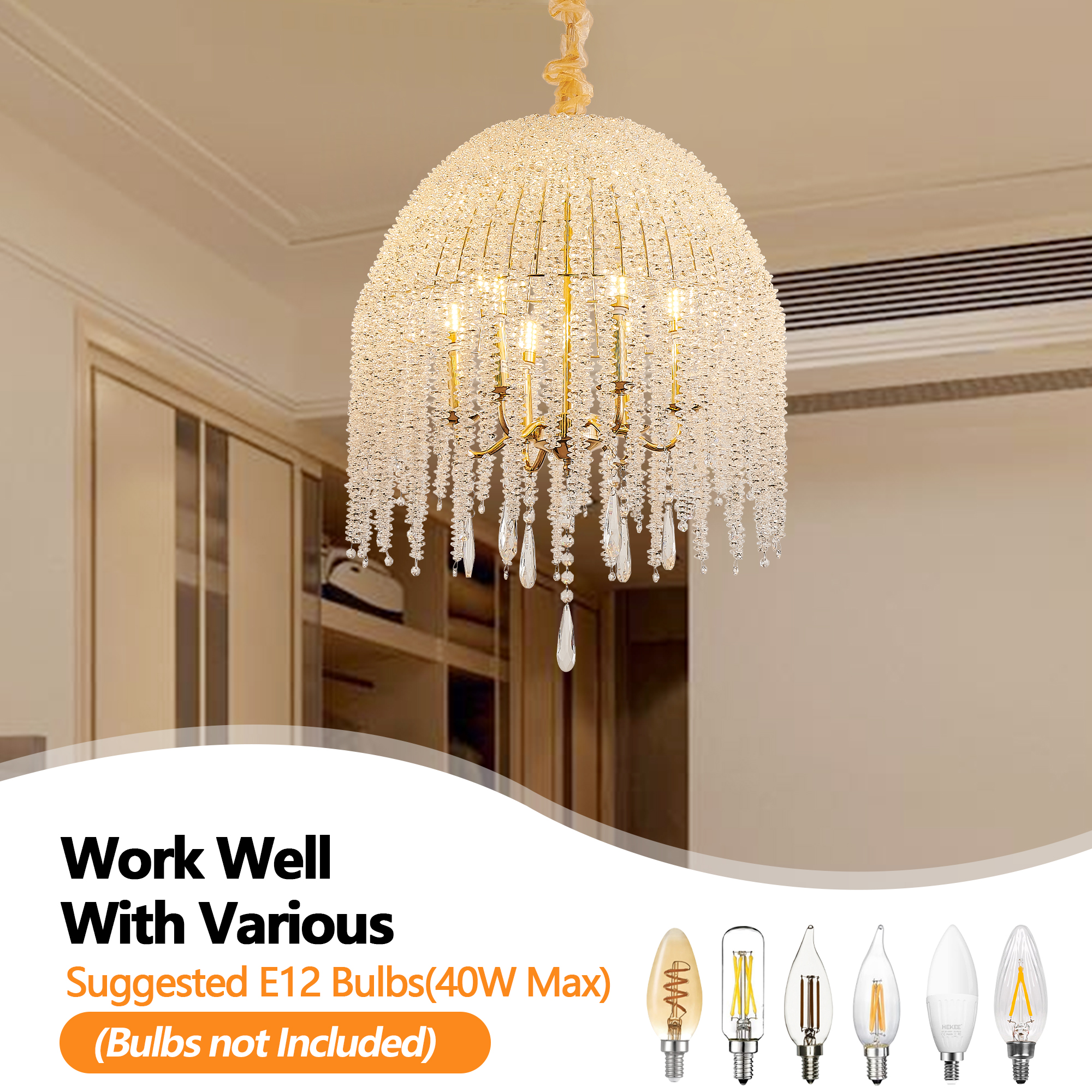 NEOSGO 20 Inch 6-Light K9 Crystal Pendant Light Chandelier– Elegant Waterfall Design with Cascading Crystal Bead Strings and Gold Finish for Living Room, Bedroom, or Dining Area (Bulb Not Included) is designed to serve as both a lighting source and a decorative focal point within the room. This type of fixture is especially effective above dining tables, in entryways, and in living spaces where the customer wants overhead light with stronger visual impact. The product presentation suggests a style-driven fixture that helps define the ceiling area and gives the space a more elevated, finished character. It is a strong fit for customers who want lighting that contributes to the overall look of the room rather than functioning as a utility piece alone. Overall size is approximately 20.1 x 20.1 x 10.6 inches with a listed weight of 26.4. The current listing includes 9 product images, which help clarify the product shape, proportions, and visual placement in a real room setting.