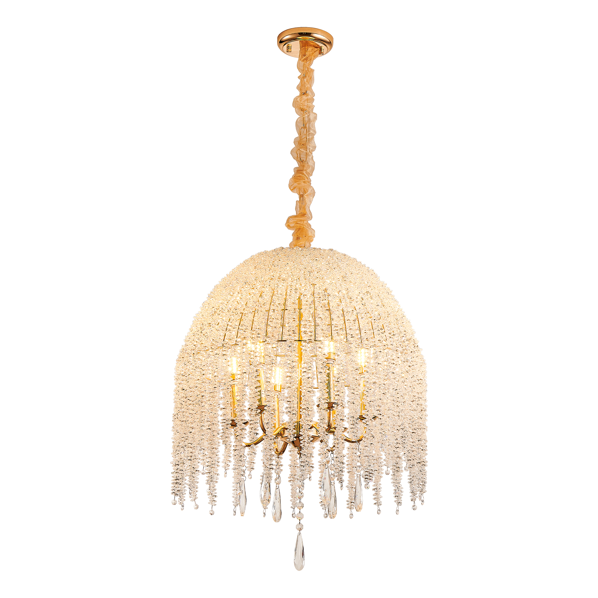 20 Inch 6-Light K9 Crystal Pendant Light Chandelier– Elegant Waterfall Design with Cascading Crystal Bead Strings and Gold Finish for Living Room, Bedroom, or Dining Area (Bulb Not Included)