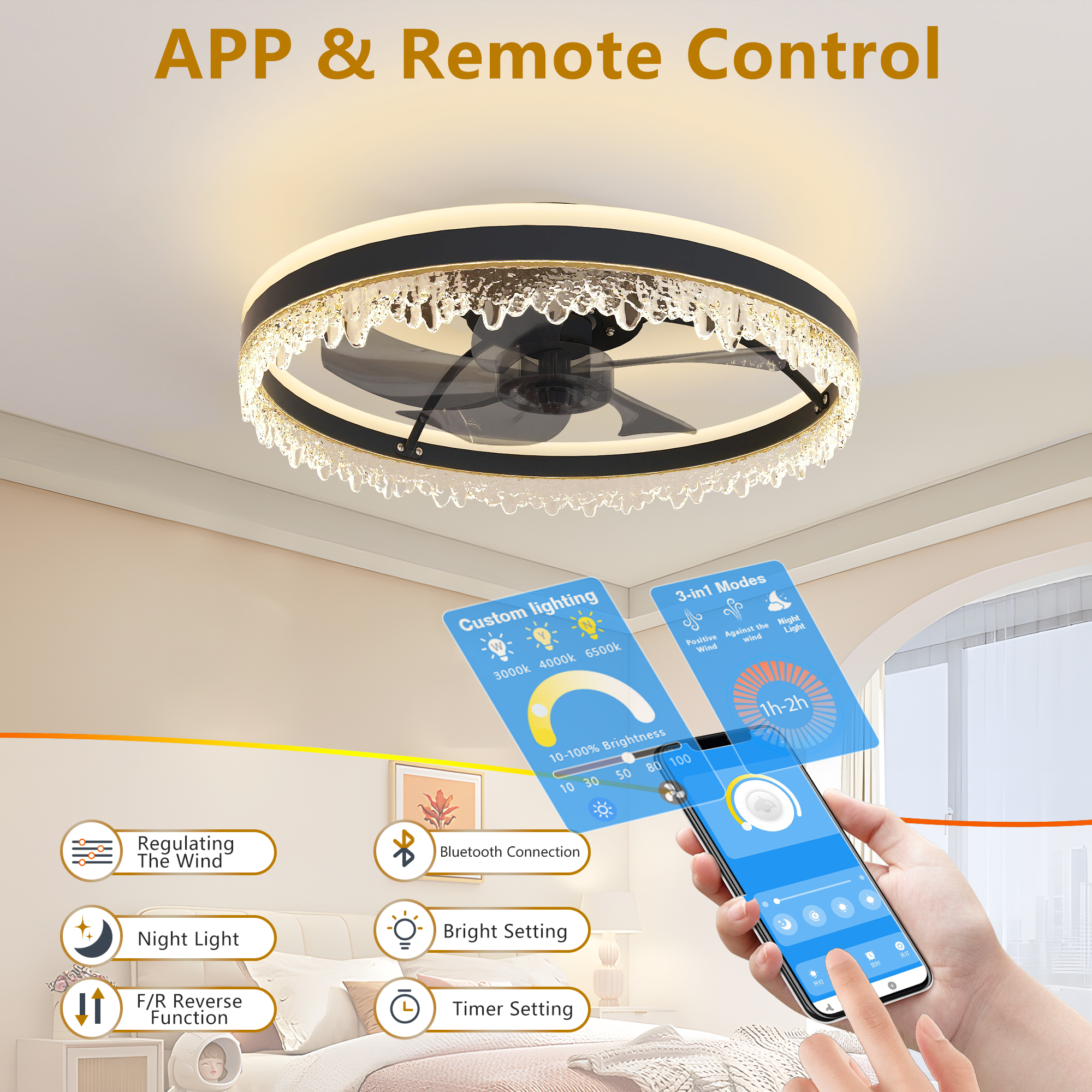 20-inch Black Smart Ceiling Fan Light with Silent Function, Multi-Speed Adjustment for Bedroom, Study Room, and Dining Room
