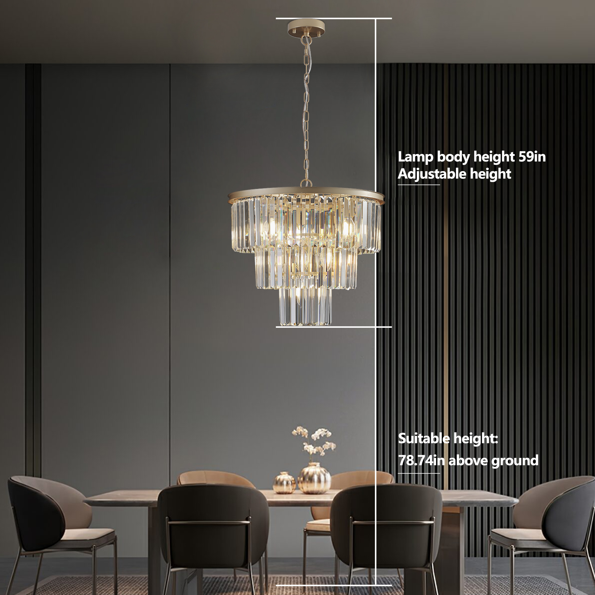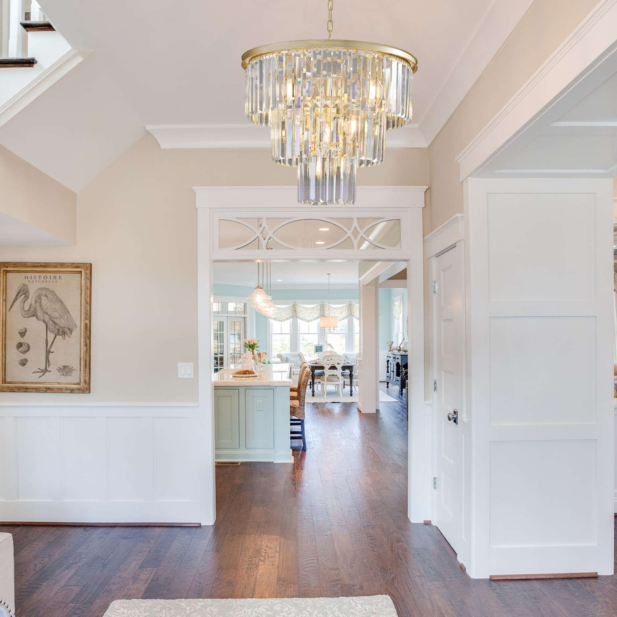 NEOSGO 20" Luxury 3-Tier Crystal Chandelier, 7-Light Gold Frame Pendant Light, Elegant Ceiling Lighting for Living Room, Dining Room, Bedroom (No Bulbs) is designed to serve as both a lighting source and a decorative focal point within the room. This type of fixture is especially effective above dining tables, in entryways, and in living spaces where the customer wants overhead light with stronger visual impact. The product presentation suggests a style-driven fixture that helps define the ceiling area and gives the space a more elevated, finished character. It is a strong fit for customers who want lighting that contributes to the overall look of the room rather than functioning as a utility piece alone. Overall size is approximately 20.1 x 20.1 x 10.6 inches with a listed weight of 19. The current listing includes 12 product images, which help clarify the product shape, proportions, and visual placement in a real room setting.