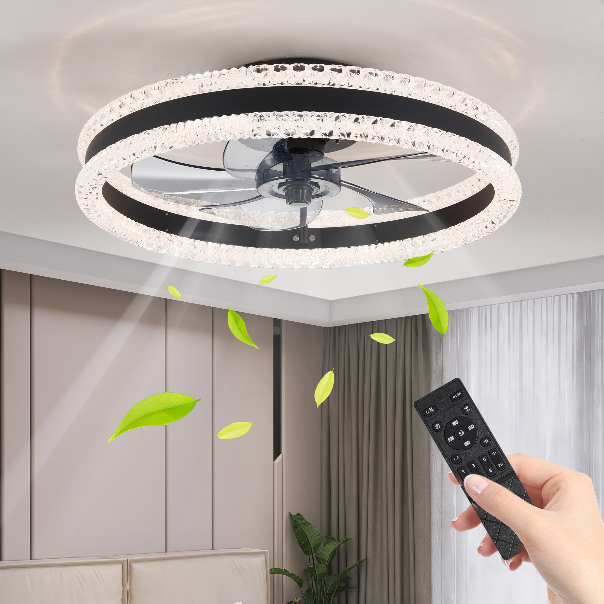 NEOSGO 20" Luxury Double Ring LED Ceiling Fan with Light – Modern Flush Mount Design, Hidden Blades, Dimmable Lighting & Remote Control, Low Profile Silent Fan for Bedroom, Living Room (Black) combines ceiling lighting and airflow in one fixture, making it useful for rooms that need everyday comfort as well as a more finished overhead look. The caged or close-to-ceiling style shown in the product presentation helps it work well in spaces where customers want decorative character without the visual bulk of a larger hanging fixture. It is well suited for kitchens, dining rooms, bedrooms, living areas, and similar spaces where air movement, ambient light, and a coordinated design all matter. This is a practical choice for customers who want to save ceiling space while improving comfort and keeping the room visually polished. Overall size is approximately 20.9 x 20.9 x 6.9 inches with a listed weight of 10.1. The current listing includes 9 product images, which help clarify the product shape, proportions, and visual placement in a real room setting.