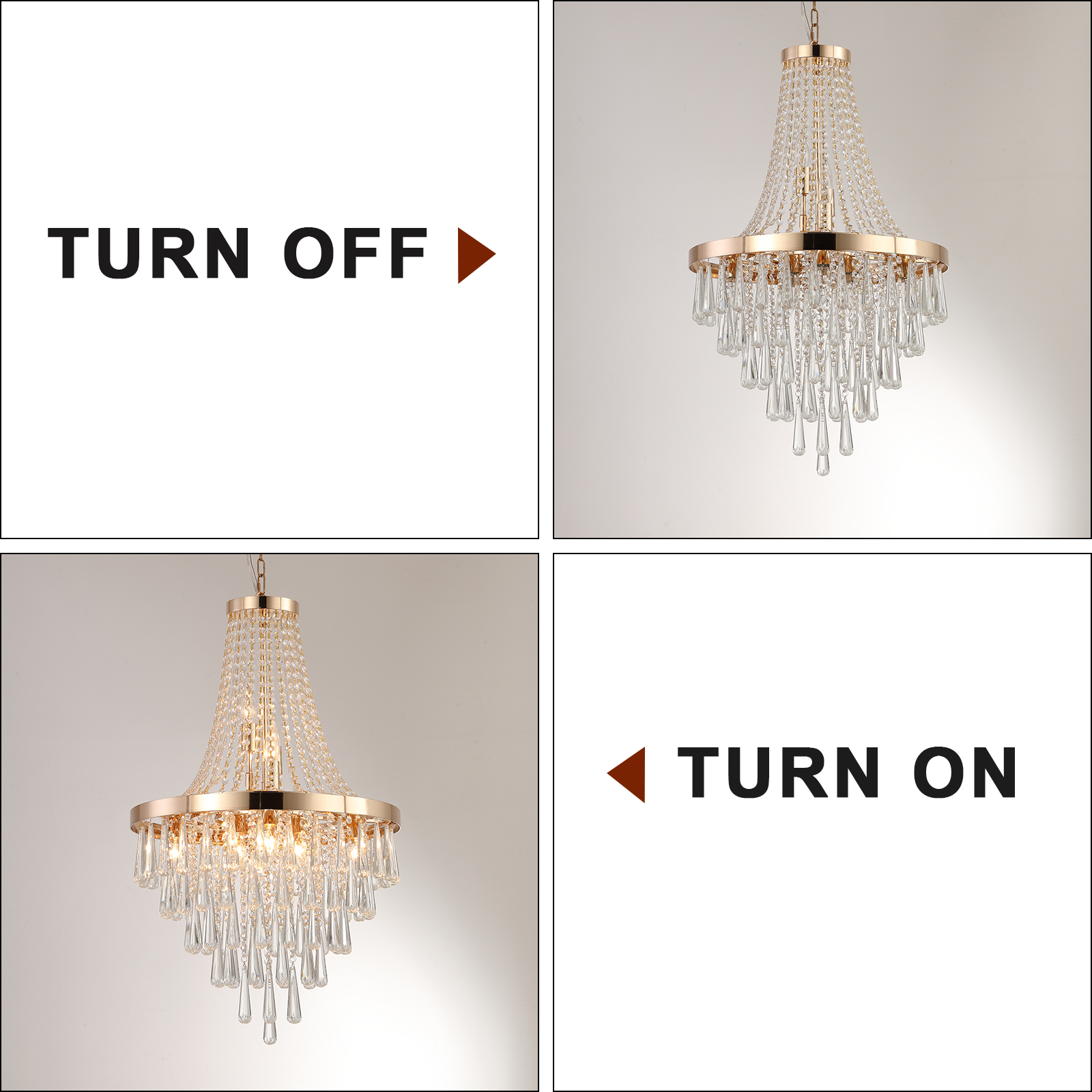 NEOSGO 20" Modern Crystal Pendant Chandelier with Golden Finish – Elegant 11-Light Hanging Light Fixture Tiered Design for Dining Room, Living Room, or Entryway (No Bulbs) is designed to serve as both a lighting source and a decorative focal point within the room. This type of fixture is especially effective above dining tables, in entryways, and in living spaces where the customer wants overhead light with stronger visual impact. The product presentation suggests a style-driven fixture that helps define the ceiling area and gives the space a more elevated, finished character. It is a strong fit for customers who want lighting that contributes to the overall look of the room rather than functioning as a utility piece alone. Overall size is approximately 22 x 22 x 11 inches with a listed weight of 24.7. The current listing includes 9 product images, which help clarify the product shape, proportions, and visual placement in a real room setting.