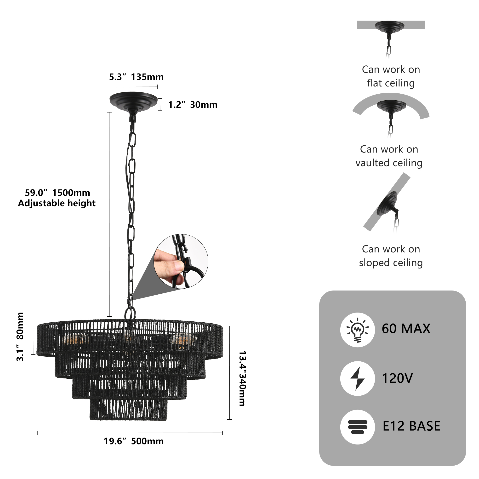 NEOSGO 20" Rustic 4-Tier Black Hemp Rope Pendant Light Chandelier with 6 E12 Sockets, Handmade Tiered Boho Ceiling Light Fixture for Dining Room, Kitchen, or Foyer (Bulb Not Included) is designed to serve as both a lighting source and a decorative focal point within the room. This type of fixture is especially effective above dining tables, in entryways, and in living spaces where the customer wants overhead light with stronger visual impact. The product presentation suggests a style-driven fixture that helps define the ceiling area and gives the space a more elevated, finished character. It is a strong fit for customers who want lighting that contributes to the overall look of the room rather than functioning as a utility piece alone. Overall size is approximately 20.1 x 20.1 x 5.5 inches with a listed weight of 7.49. The current listing includes 9 product images, which help clarify the product shape, proportions, and visual placement in a real room setting.