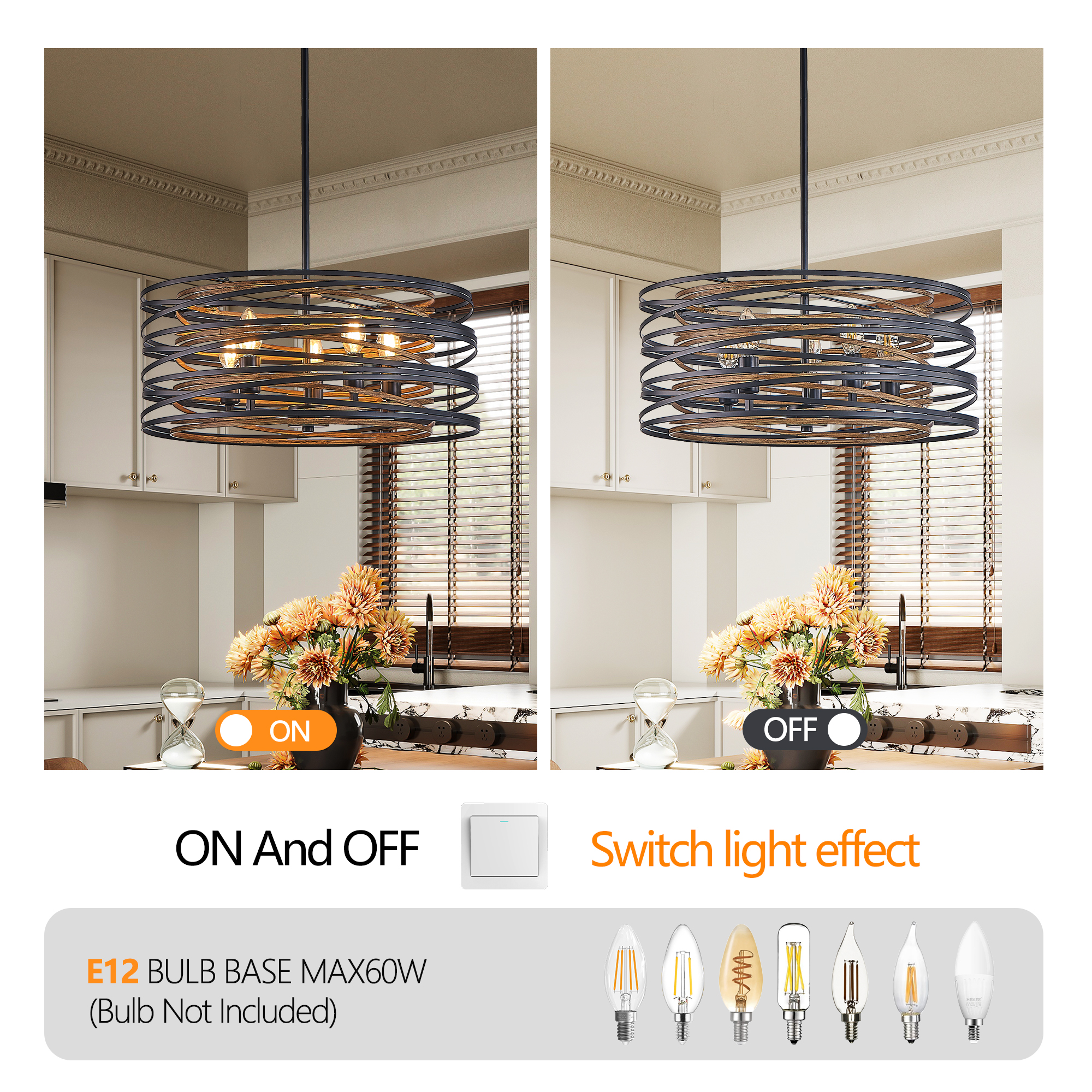 NEOSGO 20" Rustic Industrial Pendant Light, 5-Light Black and Walnut Metal Cage Chandelier with Wood Accents for Kitchen Island and Dining Room (No Bulbs) is designed to serve as both a lighting source and a decorative focal point within the room. This type of fixture is especially effective above dining tables, in entryways, and in living spaces where the customer wants overhead light with stronger visual impact. The product presentation suggests a style-driven fixture that helps define the ceiling area and gives the space a more elevated, finished character. It is a strong fit for customers who want lighting that contributes to the overall look of the room rather than functioning as a utility piece alone. Overall size is approximately 20.1 x 20.1 x 9.1 inches with a listed weight of 12.9. The current listing includes 10 product images, which help clarify the product shape, proportions, and visual placement in a real room setting.