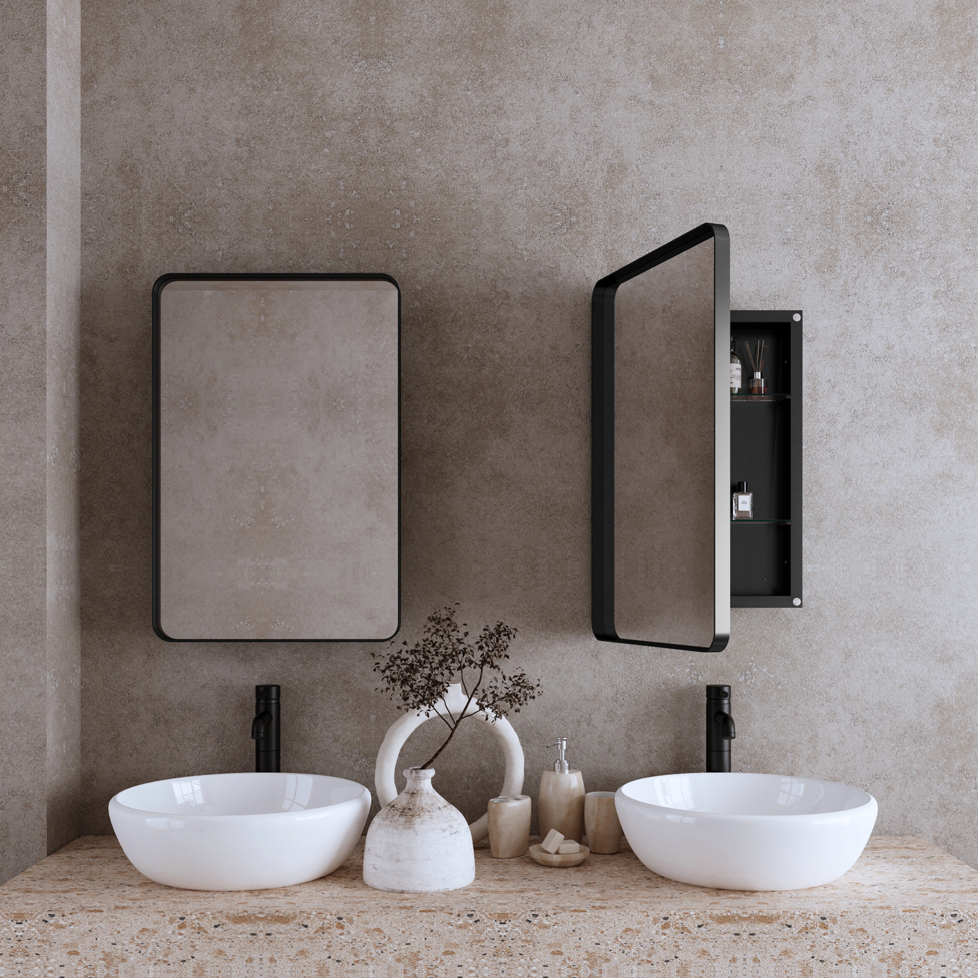 FS Furniture 20x30 Inch Recessed Black Metal Framed Medicine Cabinet with Mirror and Adjustable Shelves Black Wall Mirror with Storage for Bathroom. Designed to provide practical task lighting around a vanity or bathroom mirror while supporting everyday grooming routines. Material: Metal. Product dimensions and weight: length 33.86, width 7.09, height 24.02, weight 27.5.