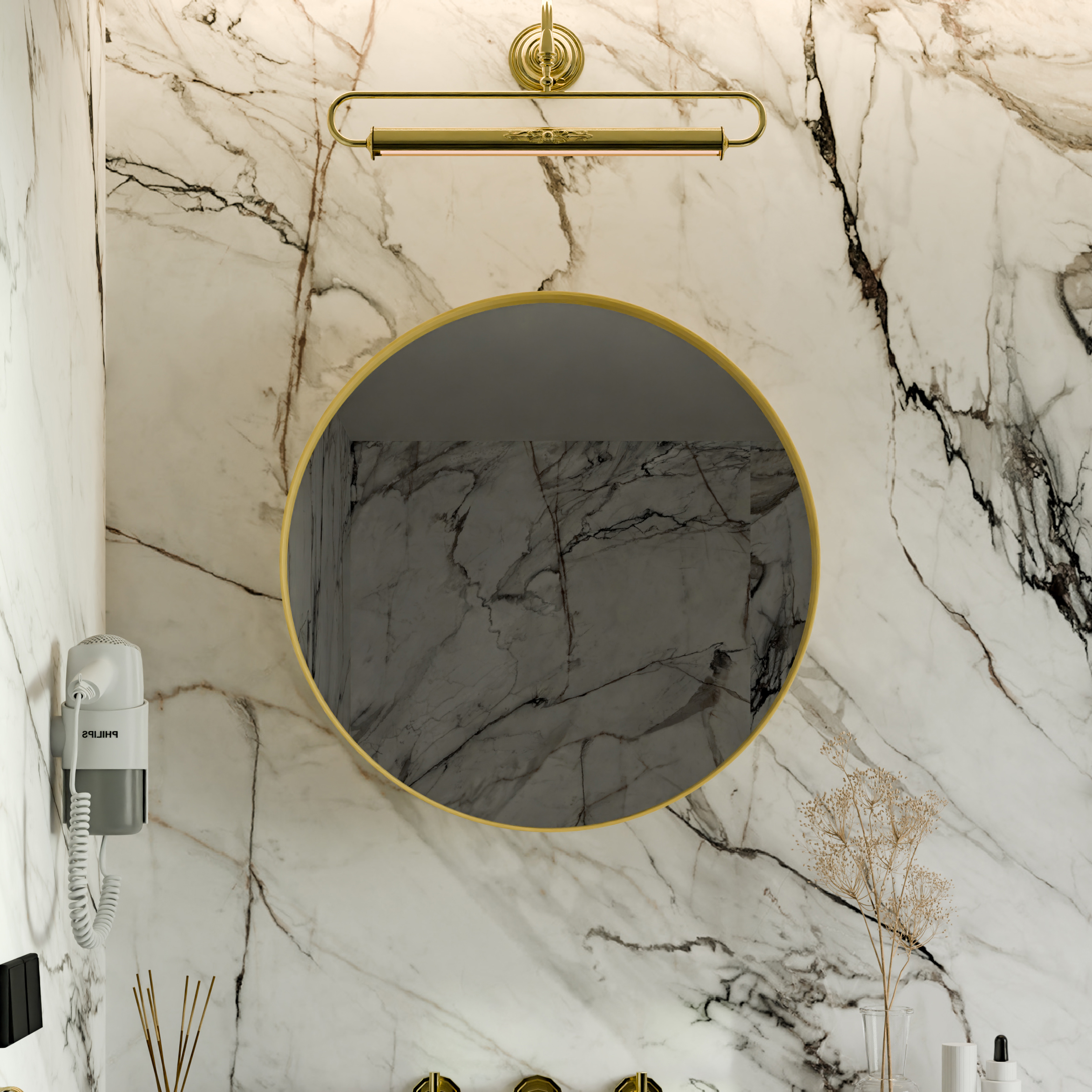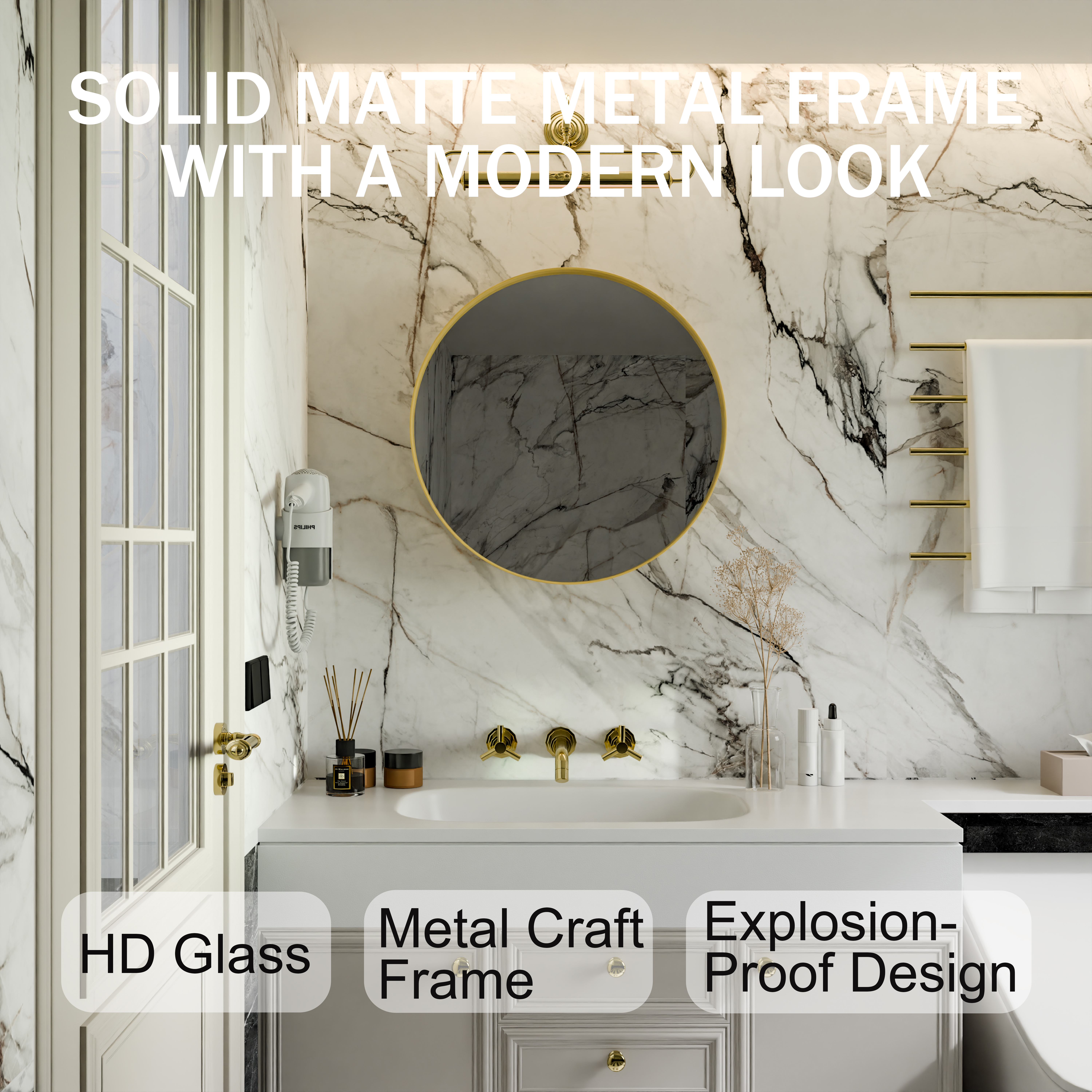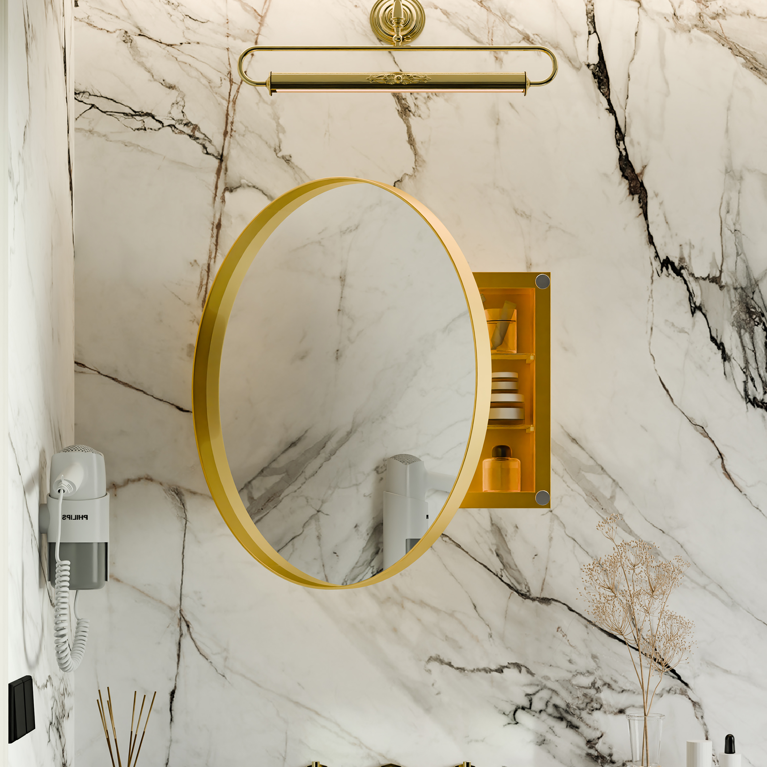 FS Furniture 23.6 Inch Surface Mount Round Metal Framed Medicine Cabinet with Mirror and Adjustable Shelves Black Wall Mirror with Storage for Bathroom, Matte Gold. Designed to provide practical task lighting around a vanity or bathroom mirror while supporting everyday grooming routines. Material: Metal. Product dimensions and weight: length 26.8, width 26.8, height 7.3, weight 23.8.