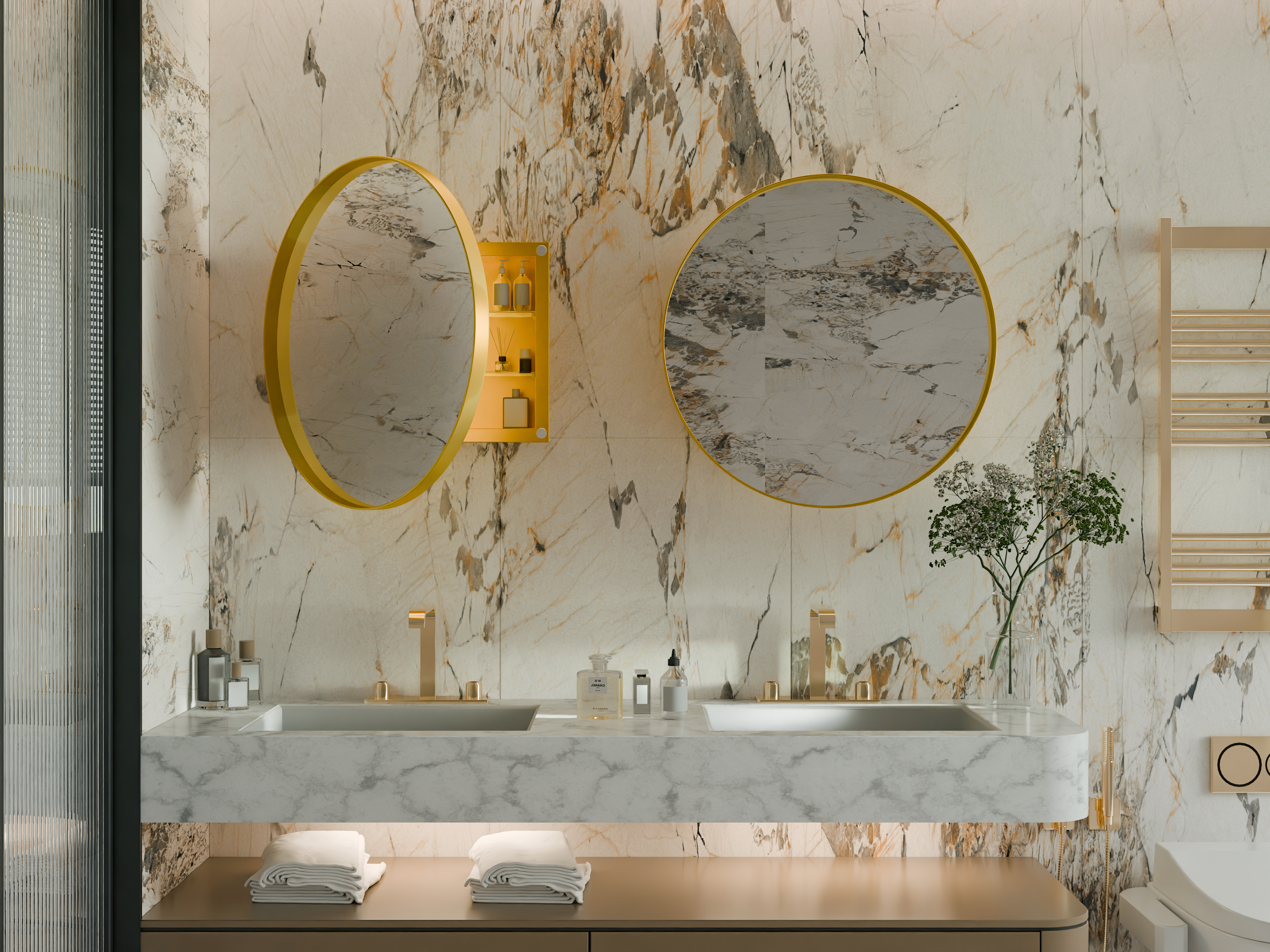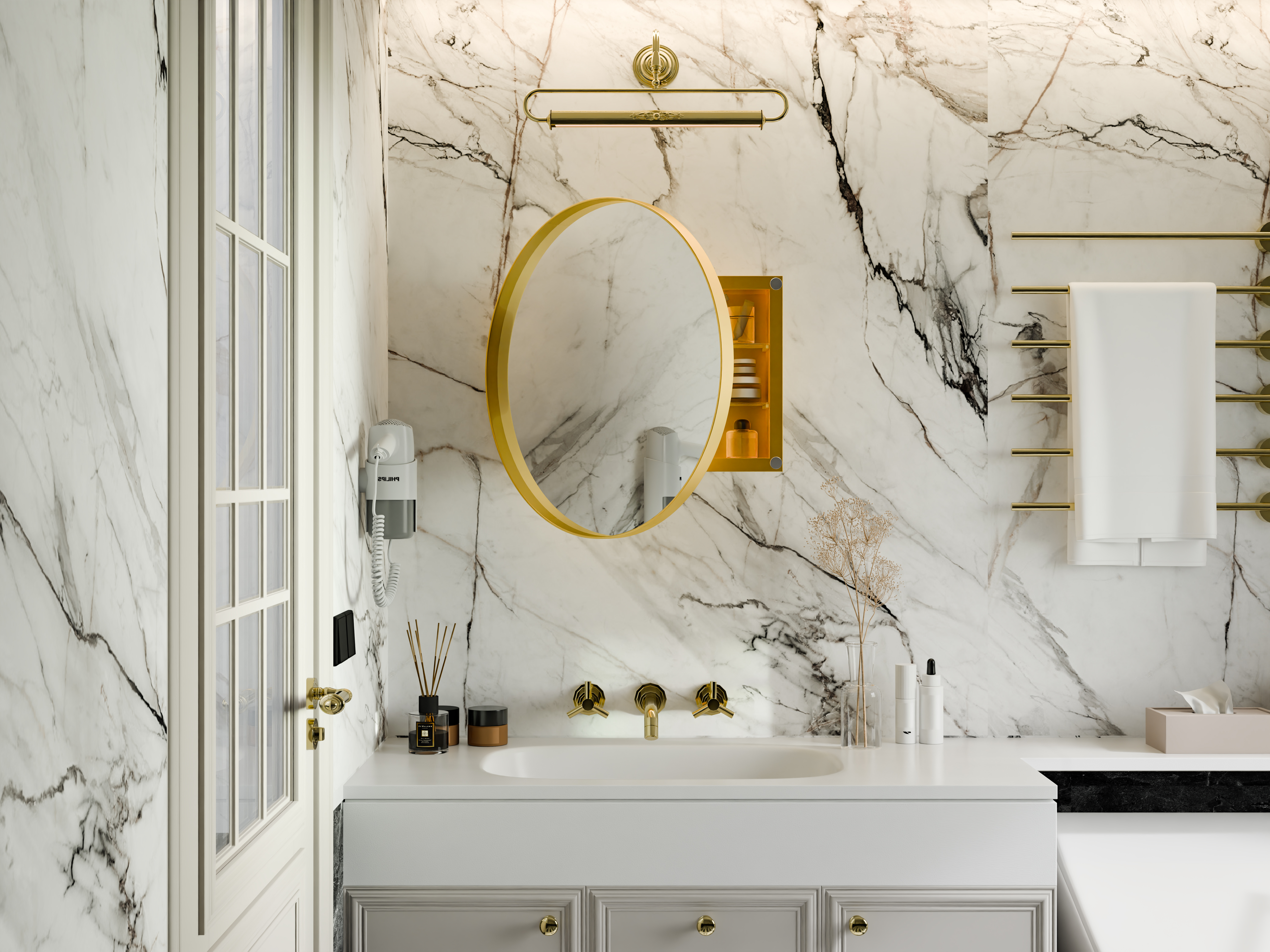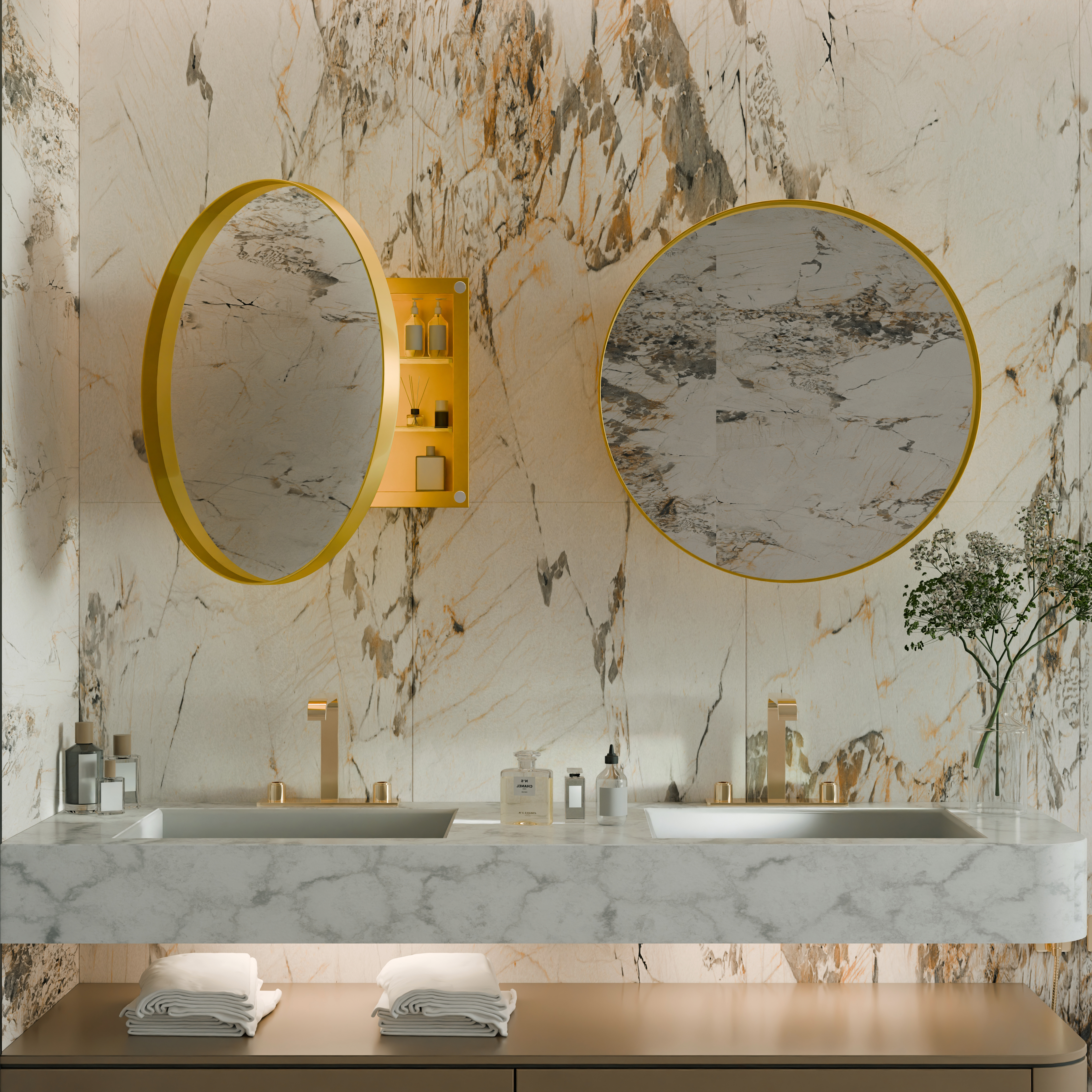 FS Furniture 23.6 Inch Surface Mount Round Metal Framed Medicine Cabinet with Mirror and Adjustable Shelves Black Wall Mirror with Storage for Bathroom, Matte Gold. Designed to provide practical task lighting around a vanity or bathroom mirror while supporting everyday grooming routines. Material: Metal. Product dimensions and weight: length 26.8, width 26.8, height 7.3, weight 23.8.