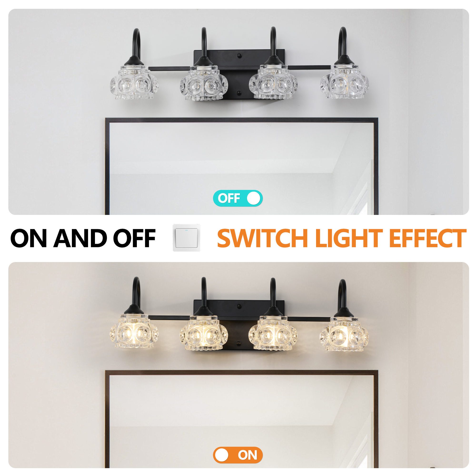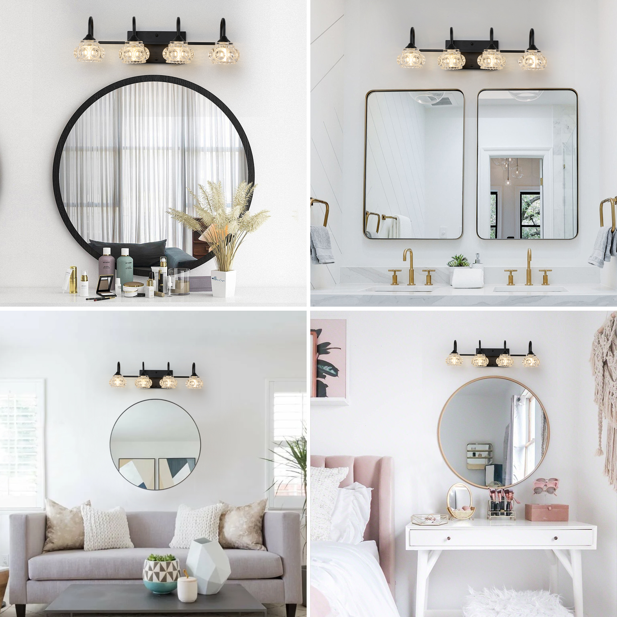 NEOSGO 23" Retro 4-Light Bathroom Vanity Light Fixture - Black Finish with Crystal Glass Shades, Wall Mounted Lighting for Bathroom, Powder Room, and Vanity Mirror (No Bulbs) is designed to improve daily bathroom routines with a clearer mirror area and more useful lighting around the vanity space. The product presentation suggests a modern wall-mounted mirror intended for grooming, makeup, skincare, shaving, and other tasks that benefit from more even front-facing light. It works especially well in bathrooms, powder rooms, and remodeled vanity areas where customers want the mirror to provide both practical function and a cleaner visual upgrade. This type of mirror is a strong fit for shoppers looking to make the room feel brighter, more modern, and easier to use every day. Overall size is approximately 22.44 x 12.99 x 7.09 inches with a listed weight of 9. The current listing includes 8 product images, which help clarify the product shape, proportions, and visual placement in a real room setting.