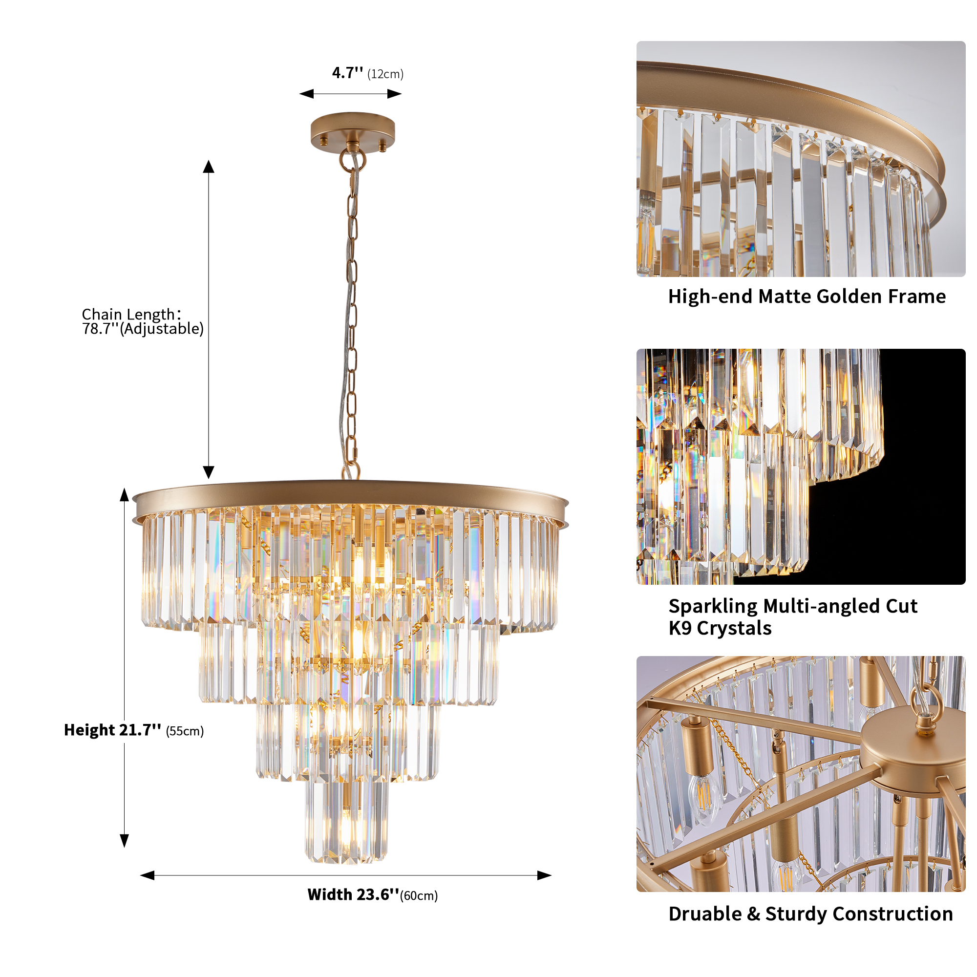 NEOSGO 24" Contemporary Crystal Modern Chandeliers Crystal Ceiling Chandelier 4 Tier Golden Chandelier Lighting for Dining Room Living Room Bedroom (Bulbs Not Included) is designed to serve as both a lighting source and a decorative focal point within the room. This type of fixture is especially effective above dining tables, in entryways, and in living spaces where the customer wants overhead light with stronger visual impact. The product presentation suggests a style-driven fixture that helps define the ceiling area and gives the space a more elevated, finished character. It is a strong fit for customers who want lighting that contributes to the overall look of the room rather than functioning as a utility piece alone. Overall size is approximately 25.2 x 25.2 x 8.7 inches with a listed weight of 30.7. The current listing includes 11 product images, which help clarify the product shape, proportions, and visual placement in a real room setting.
