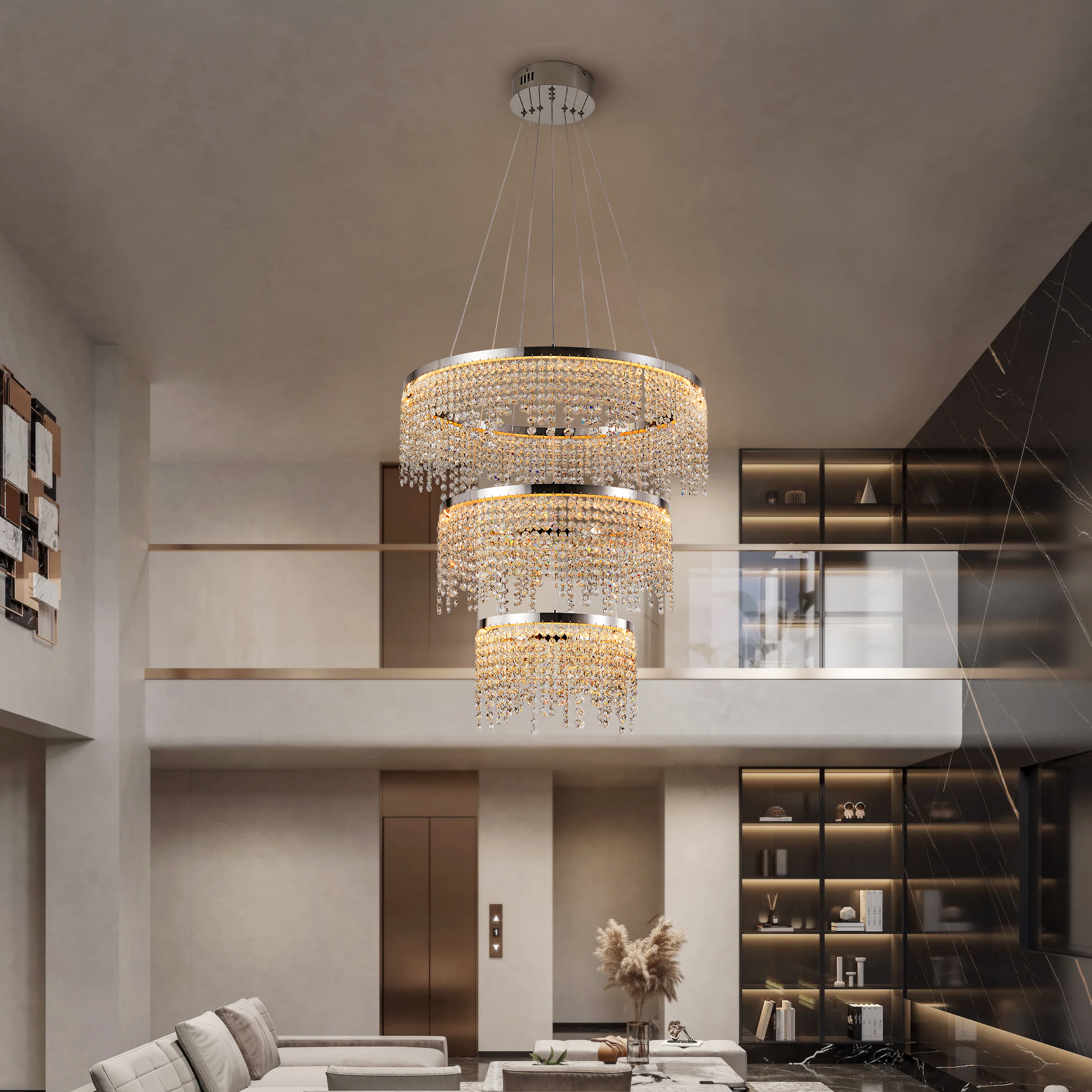NEOSGO 24-inch Crystal Chandelier LED Ceiling Lamp, Adjustable Color Temperature 3000K/4000K/6000K, Height Adjustable, Luxury Round Chandelier, Suitable for Living Room, Dining Room, Bedroom is designed to serve as both a lighting source and a decorative focal point within the room. This type of fixture is especially effective above dining tables, in entryways, and in living spaces where the customer wants overhead light with stronger visual impact. The product presentation suggests a style-driven fixture that helps define the ceiling area and gives the space a more elevated, finished character. It is a strong fit for customers who want lighting that contributes to the overall look of the room rather than functioning as a utility piece alone. Overall size is approximately 24.4 x 24.4 x 2.8 inches with a listed weight of 18.2. The current listing includes 9 product images, which help clarify the product shape, proportions, and visual placement in a real room setting.