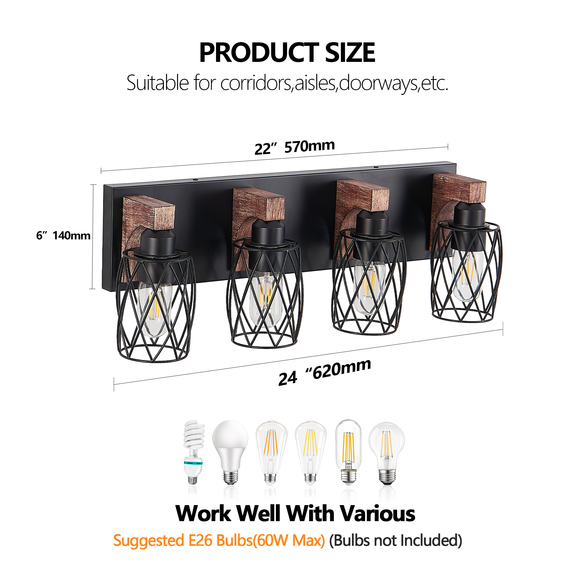 NEOSGO 24" Industrial Vintage 4-Light Wall Sconce - Black Cage Wall Lighting Fixture with Wooden Accents for Bathroom, Hallway, or Living Room (Bulb Not Included) is intended to provide focused wall lighting while also adding decorative detail to the surrounding space. This style is especially useful near mirrors, over bathroom vanities, along hallways, in bedrooms, or in accent areas that benefit from directed light rather than relying only on ceiling fixtures. Based on the product presentation, it offers a practical mix of daily illumination and visual styling, which helps the room feel more complete and intentionally designed. It is a good option for customers who want better task lighting together with a more refined finished look on the wall. Overall size is approximately 24.41 x 7.48 x 10.63 inches with a listed weight of 7.6. The current listing includes 10 product images, which help clarify the product shape, proportions, and visual placement in a real room setting.