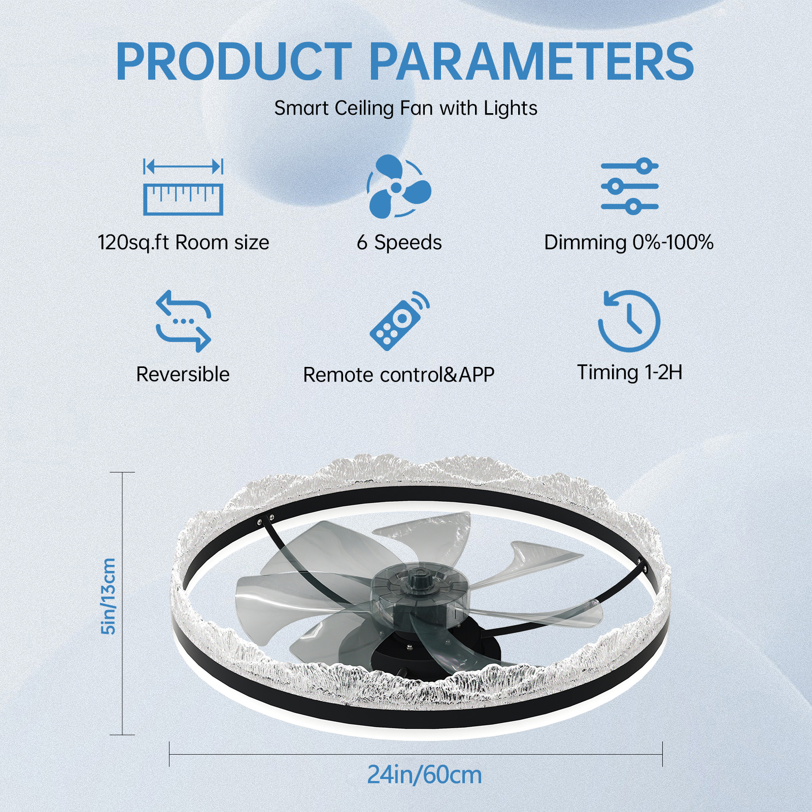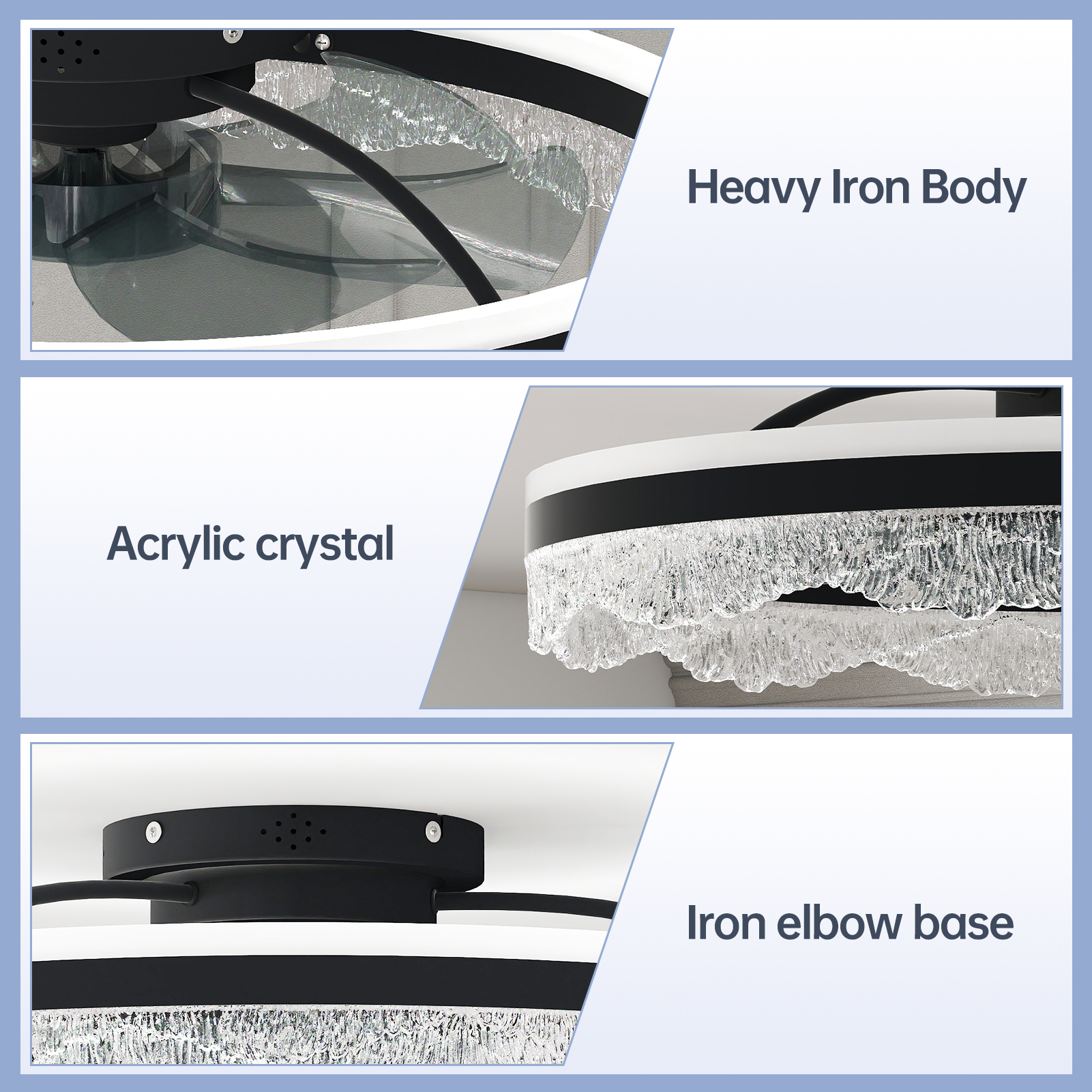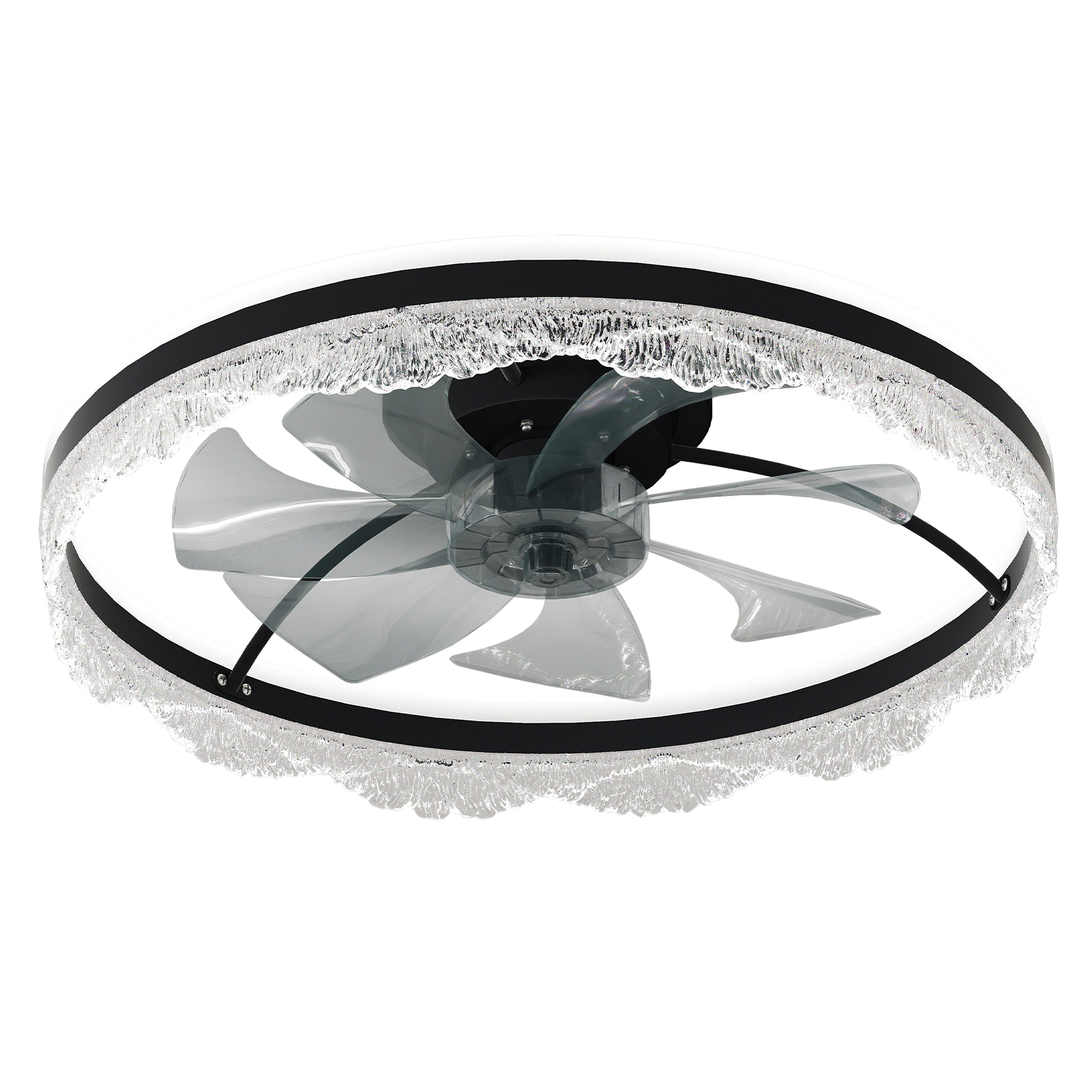 24" Quiet Ceiling Fan with Light – LED Crystal Flush Mount Fan Lamp with Hidden Blades and Natural Airflow, Perfect for Bedroom, Kids Room, Study Room