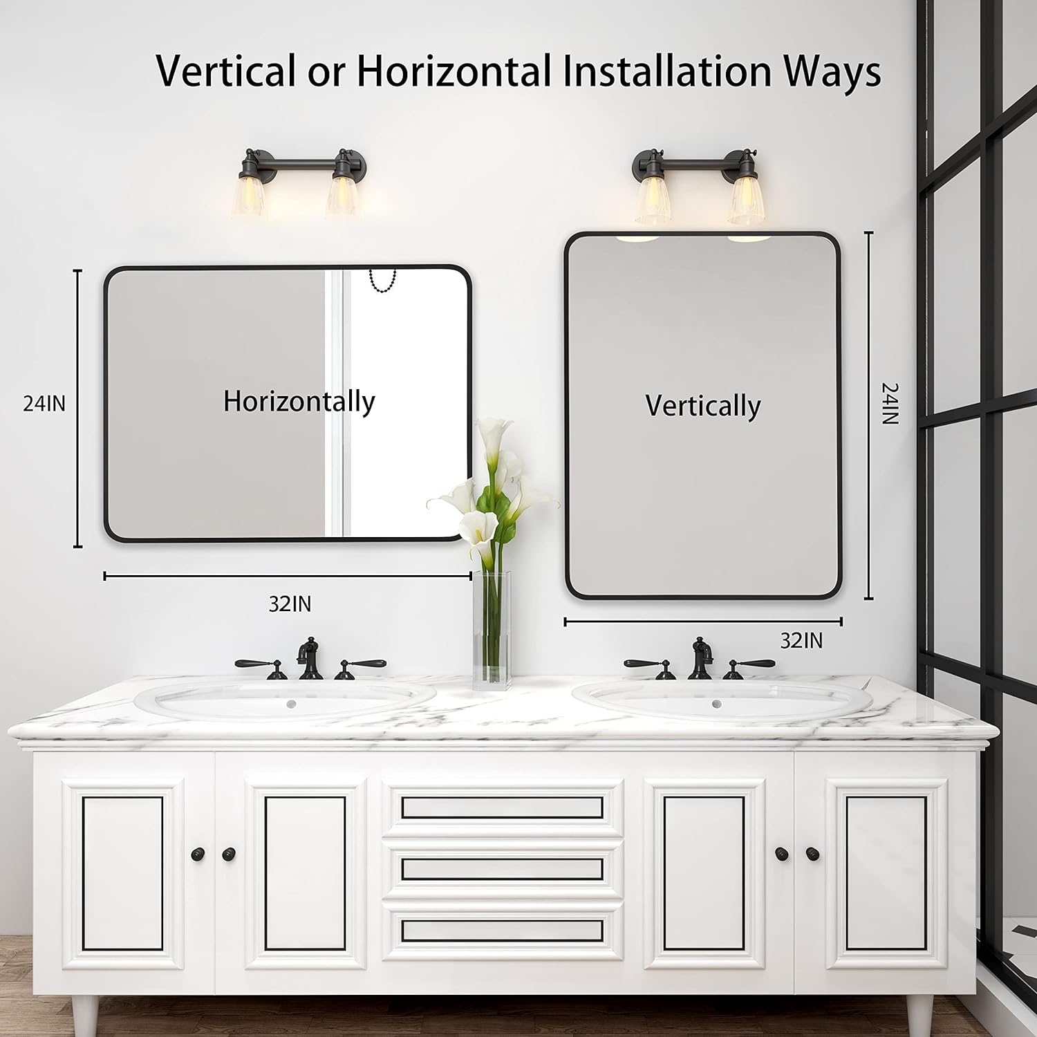 HUOVTR 24x32 Inch Black Metal Framed Rectangular Bathrrom Mirror for Wall.(W2203135016). Designed to provide practical task lighting around a vanity or bathroom mirror while supporting everyday grooming routines. Material: Aluminium,Glass,MDF. Product dimensions and weight: length 34, width 26.2, height 1.61, weight 14.3.