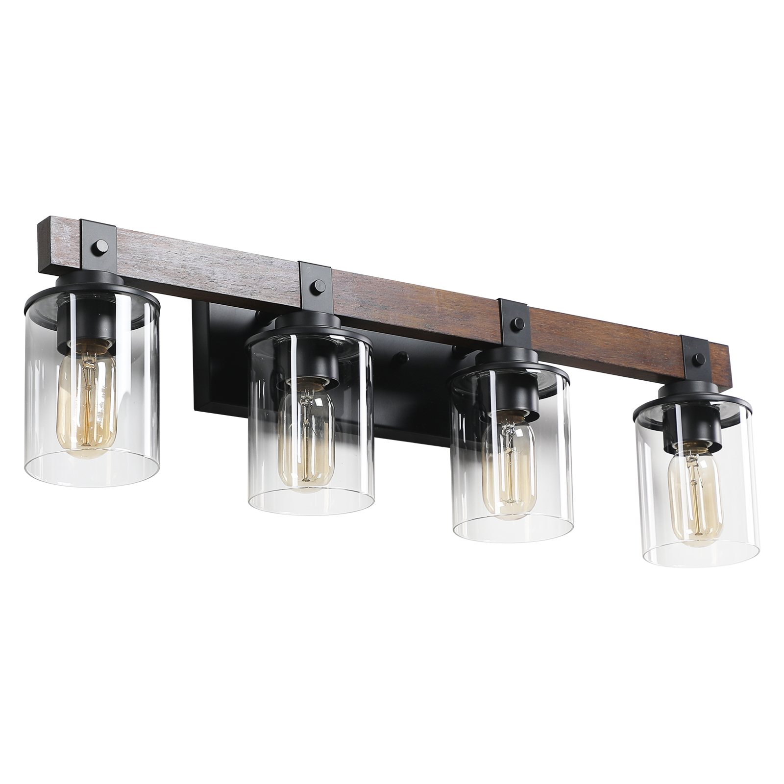 27" Rustic 4-Light Vanity Light, Industrial Bathroom Wall Sconce with Glass Shades and Wood Accent, Modern Farmhouse Lighting Fixture (No Bulbs)