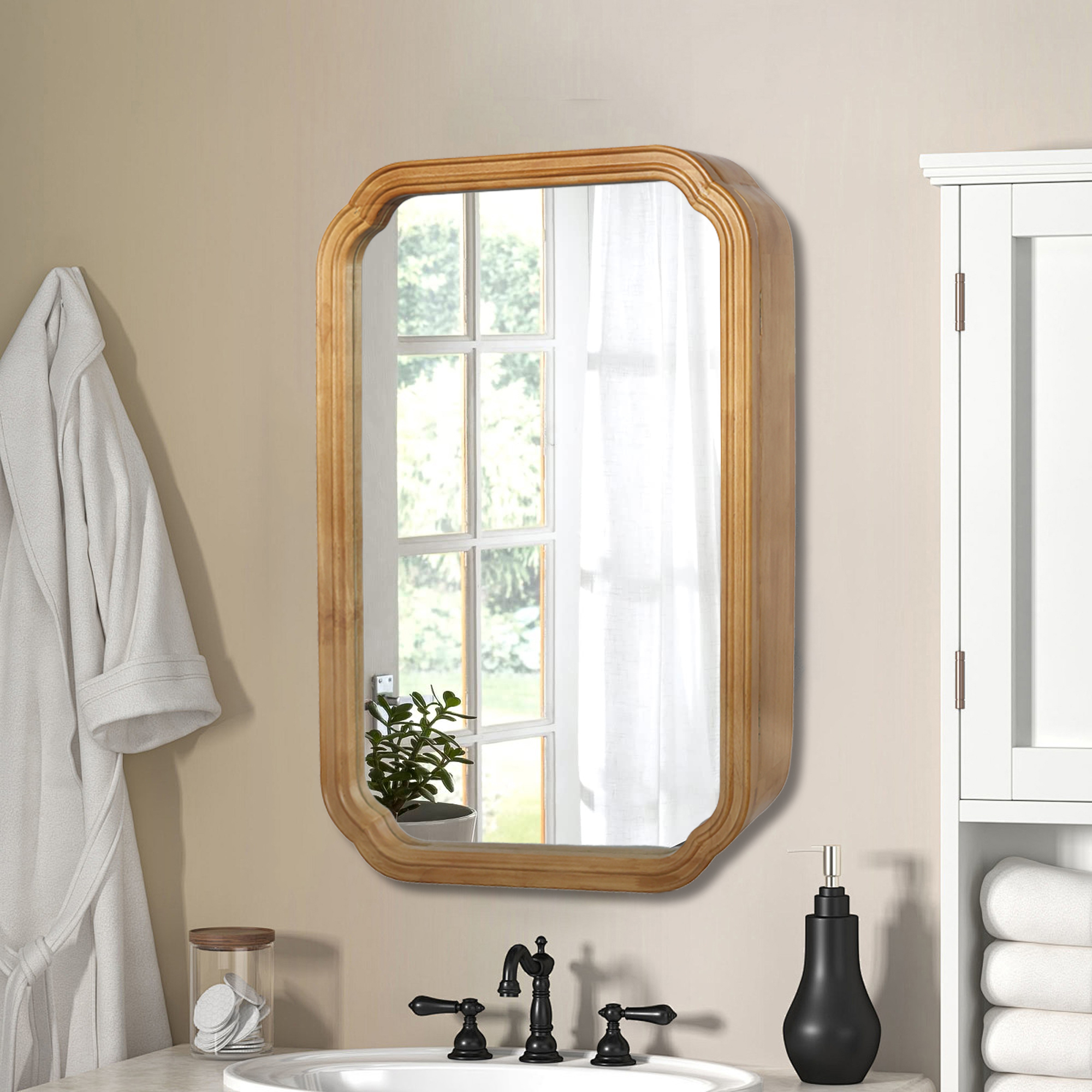 29.72*19.69 inches Functional Mirror with Cabinet, Wood Framed Bathroom Wall Cabinet with Mirror and Adjustable Shelves, Wall Mounted Mirror with Storage for Bathroom