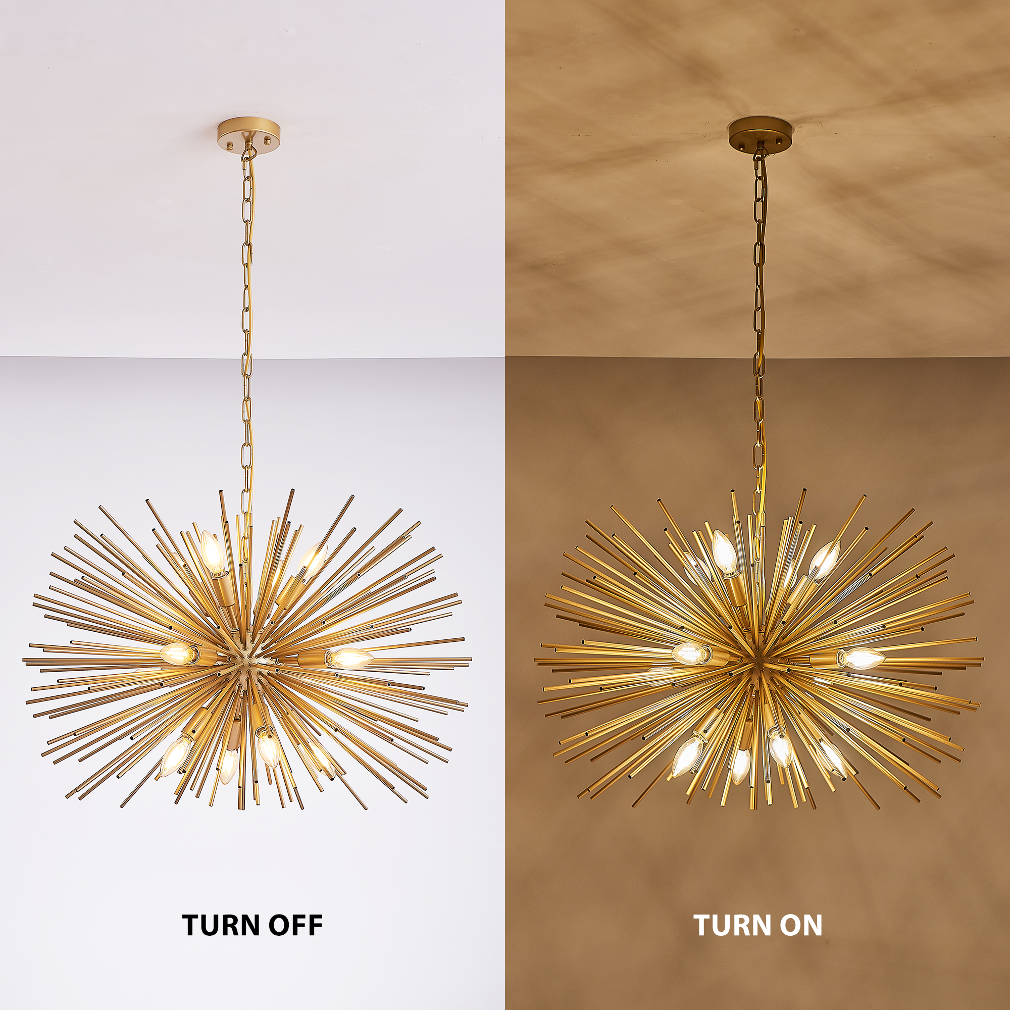 NEOSGO 29" Mid-Century Modern 12-Light Starburst Chandelier – Gold Sputnik Pendant Light Fixture for Living Room, Dining Room, or Foyer (Bulb Not Included) is designed to serve as both a lighting source and a decorative focal point within the room. This type of fixture is especially effective above dining tables, in entryways, and in living spaces where the customer wants overhead light with stronger visual impact. The product presentation suggests a style-driven fixture that helps define the ceiling area and gives the space a more elevated, finished character. It is a strong fit for customers who want lighting that contributes to the overall look of the room rather than functioning as a utility piece alone. Overall size is approximately 14.2 x 11.8 x 8.7 inches with a listed weight of 16.7. The current listing includes 12 product images, which help clarify the product shape, proportions, and visual placement in a real room setting.