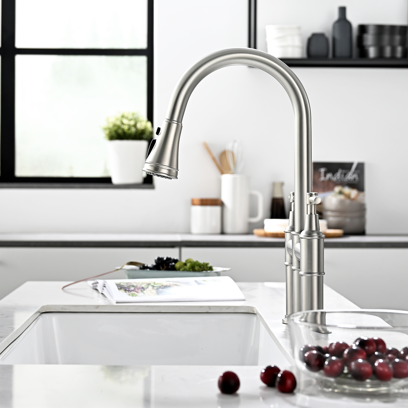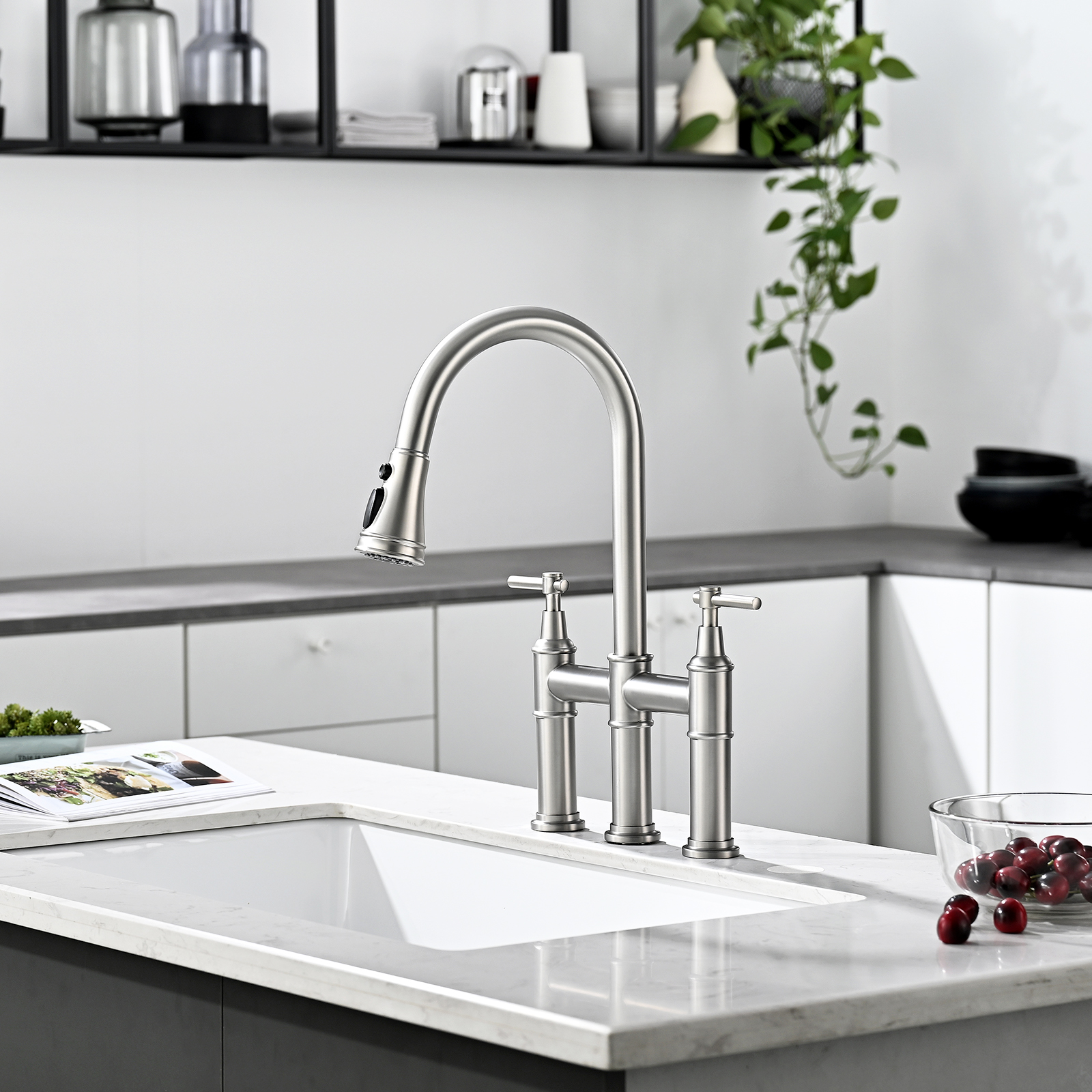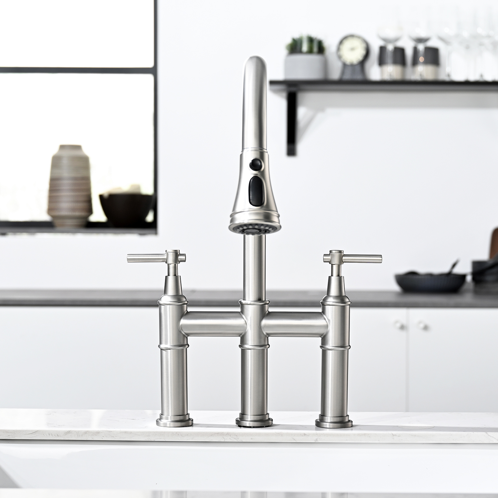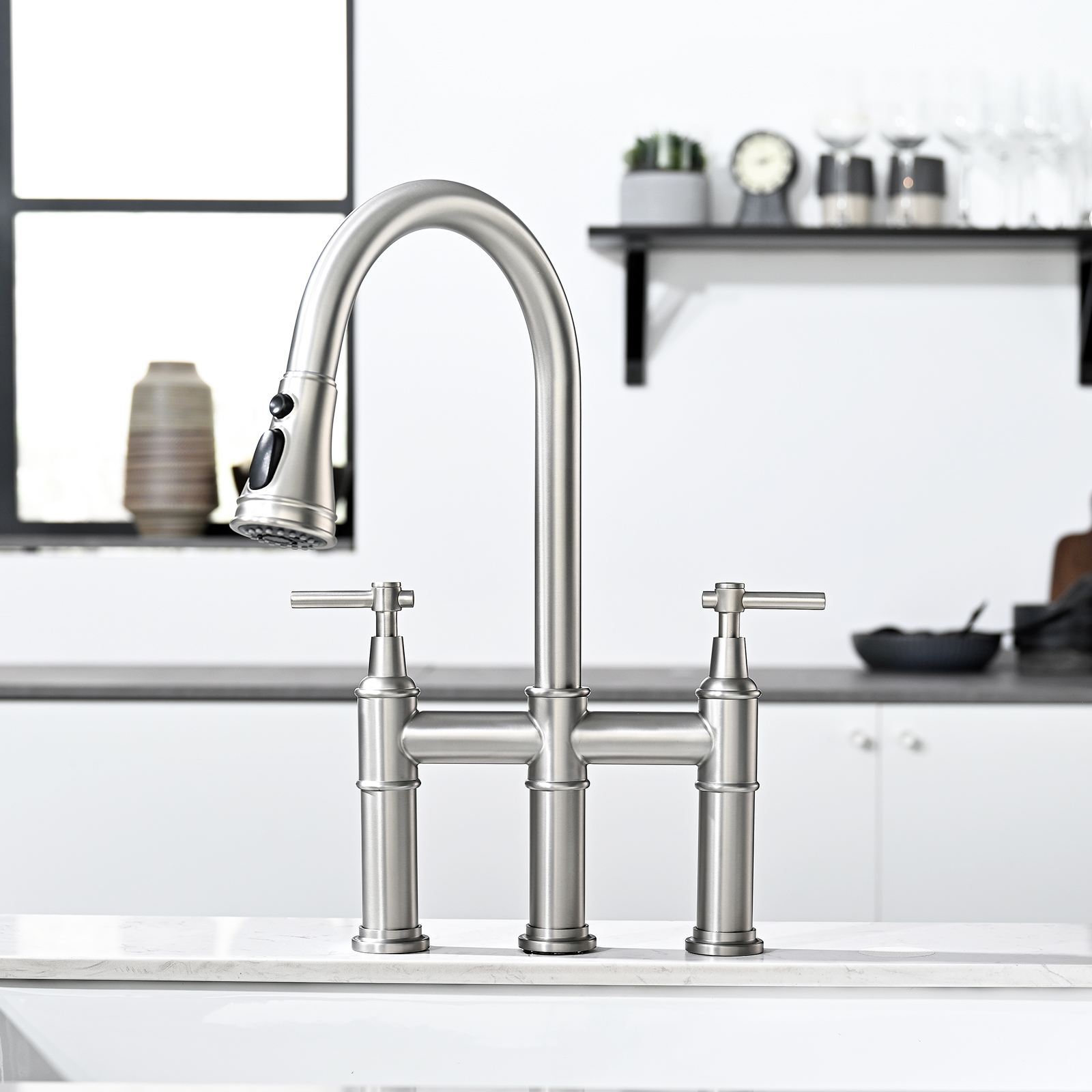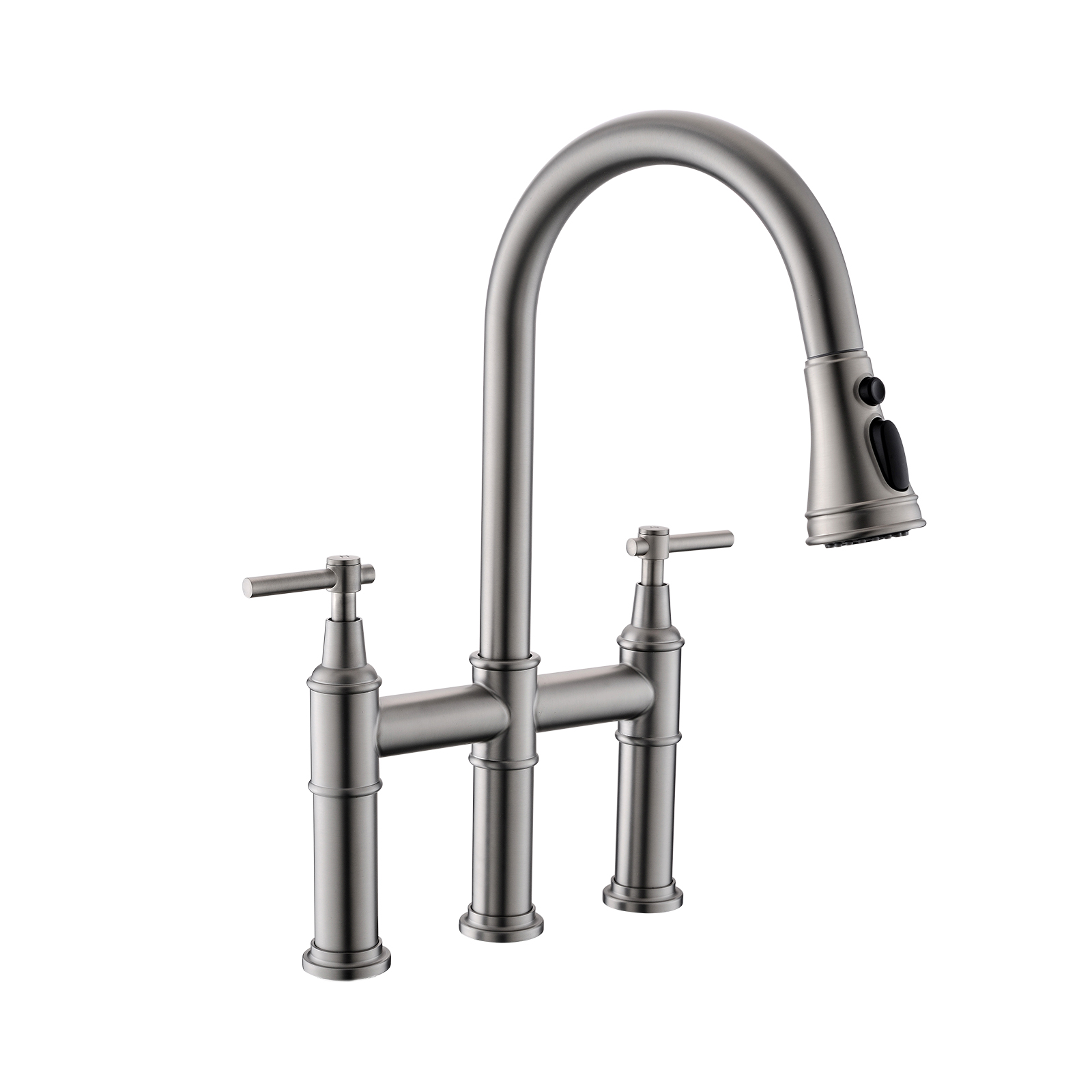 3 Hole Brushed Nickel Bridge Kitchen Faucet with Pull Down Sprayer,2 Handle Faucet for Kitchen Sinks Pull Out Sprayer Kitchen Sink Faucet