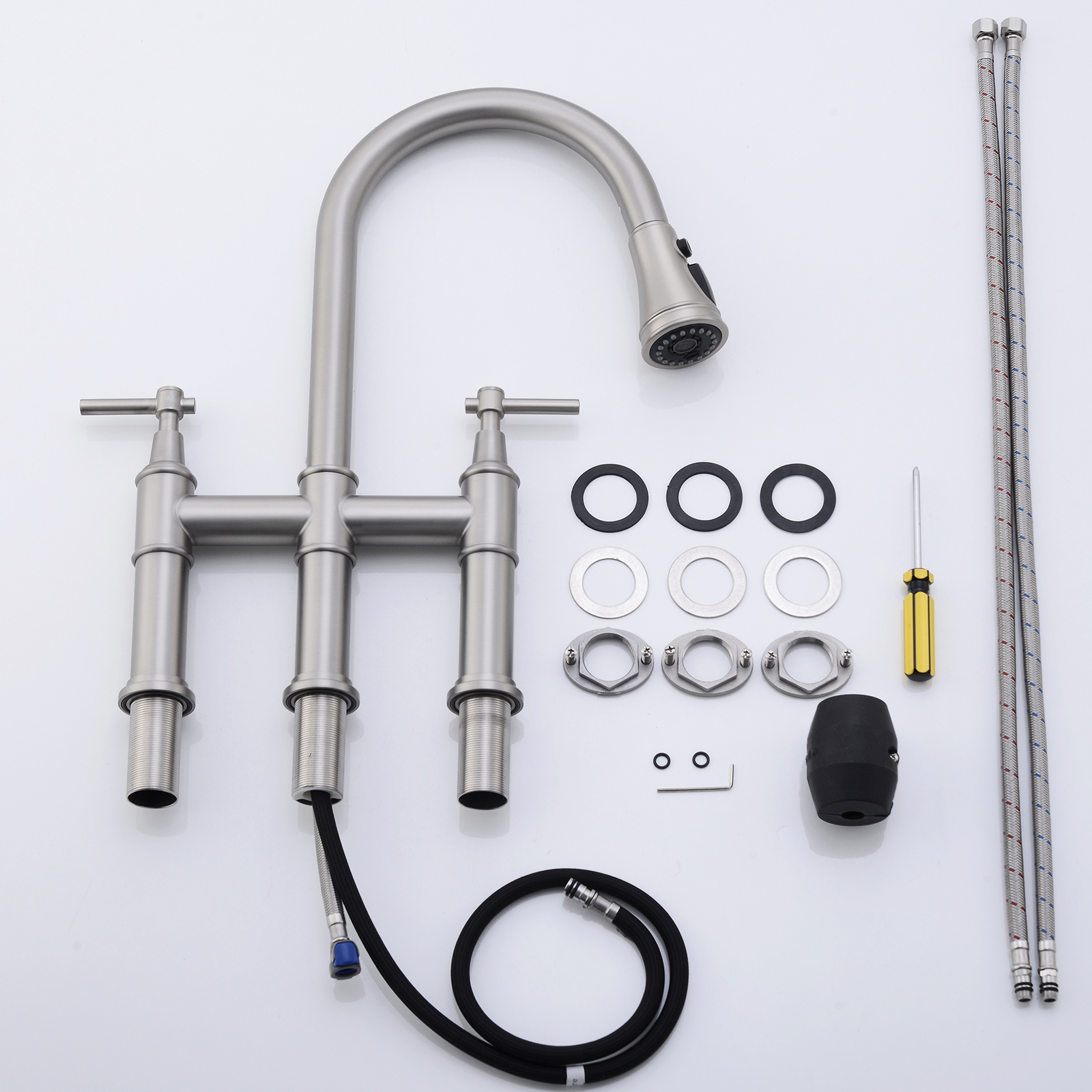 FLG 3 Hole Brushed Nickel Bridge Kitchen Faucet with Pull Down Sprayer,2 Handle Faucet for Kitchen Sinks Pull Out Sprayer Kitchen Sink Faucet. Designed as a practical decorative lighting piece that supports everyday use while helping complete the look of the space. Material: Stainless Steel. Product dimensions and weight: length 24.4, width 16.7, height 2.8, weight 7.9.