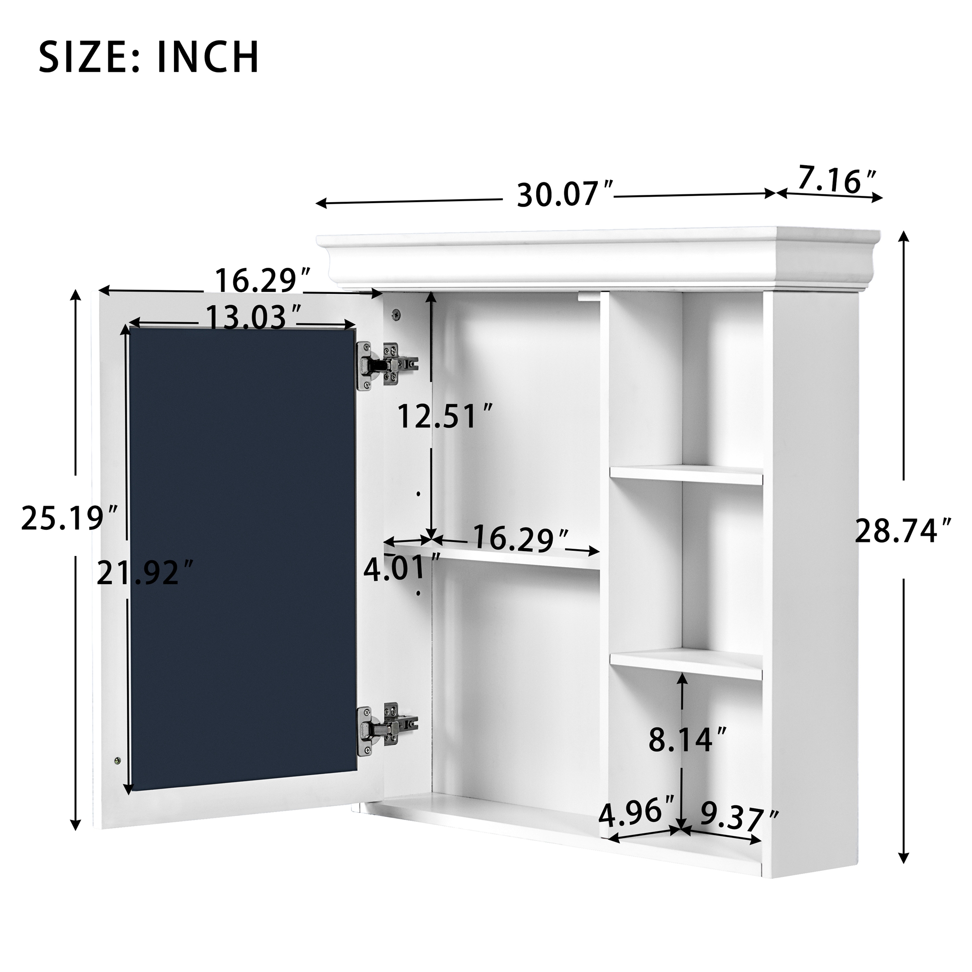 MRS 30'' x 28'' Bathroom Medicine Cabinet with Mirror, Wall Mounted Mirror Cabinet with Storage Organizer, Over the Toilet Storage White Storage Cabinet for Bathroom. Designed to provide practical task lighting around a vanity or bathroom mirror while supporting everyday grooming routines. Material: MDF. Product dimensions and weight: length 33.7, width 20.8, height 7, weight 34.83.