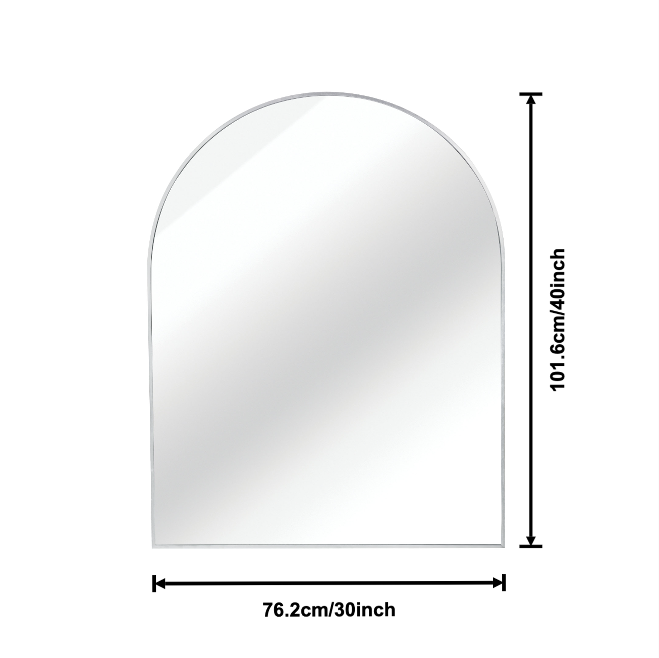 HUOVTR 30x40 Inch Silver Metal Framed Arched Bathrrom Mirror for Wall. Designed to provide practical task lighting around a vanity or bathroom mirror while supporting everyday grooming routines. Material: Aluminium,MDF,Mirror. Product dimensions and weight: length 42.1, width 32.08, height 1.61, weight 19.62.