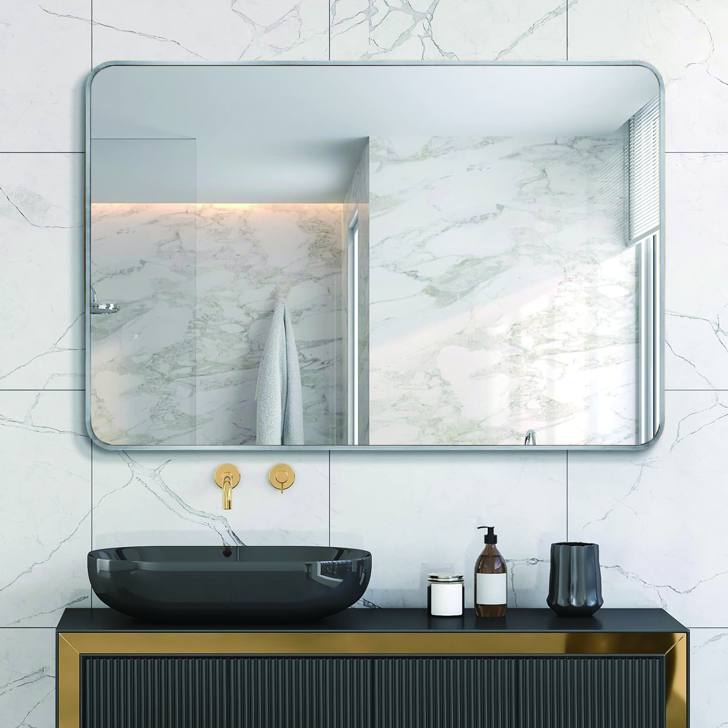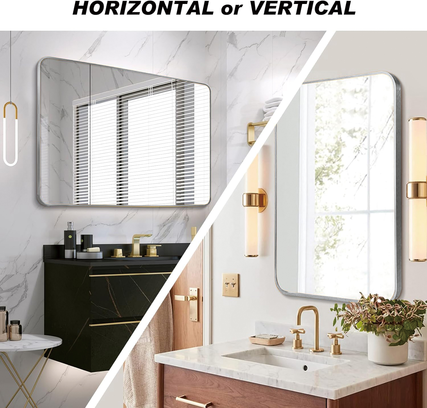 HUOVTR 30x40 Inch Silver Metal Framed Rectangular Rectangular Bathrrom Mirror for Wall.(W2203134526). Designed to provide practical task lighting around a vanity or bathroom mirror while supporting everyday grooming routines. Material: Aluminium,MDF,Mirror. Product dimensions and weight: length 41.93, width 32.1, height 1.61, weight 21.2.