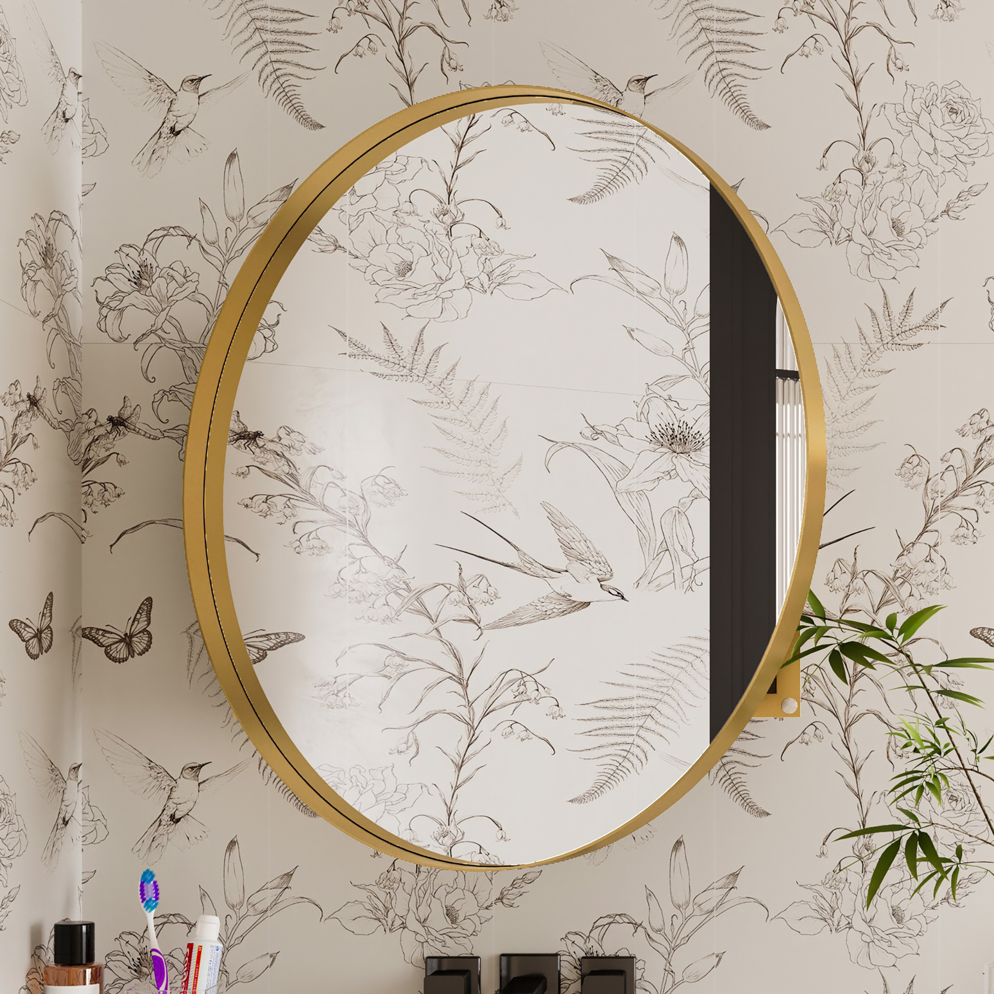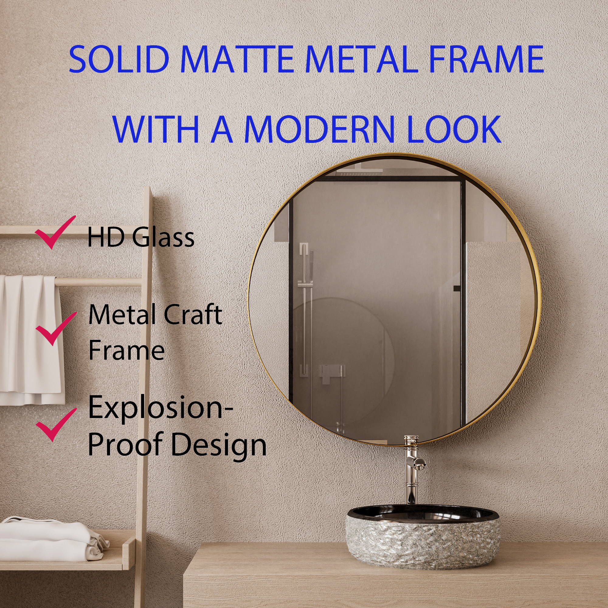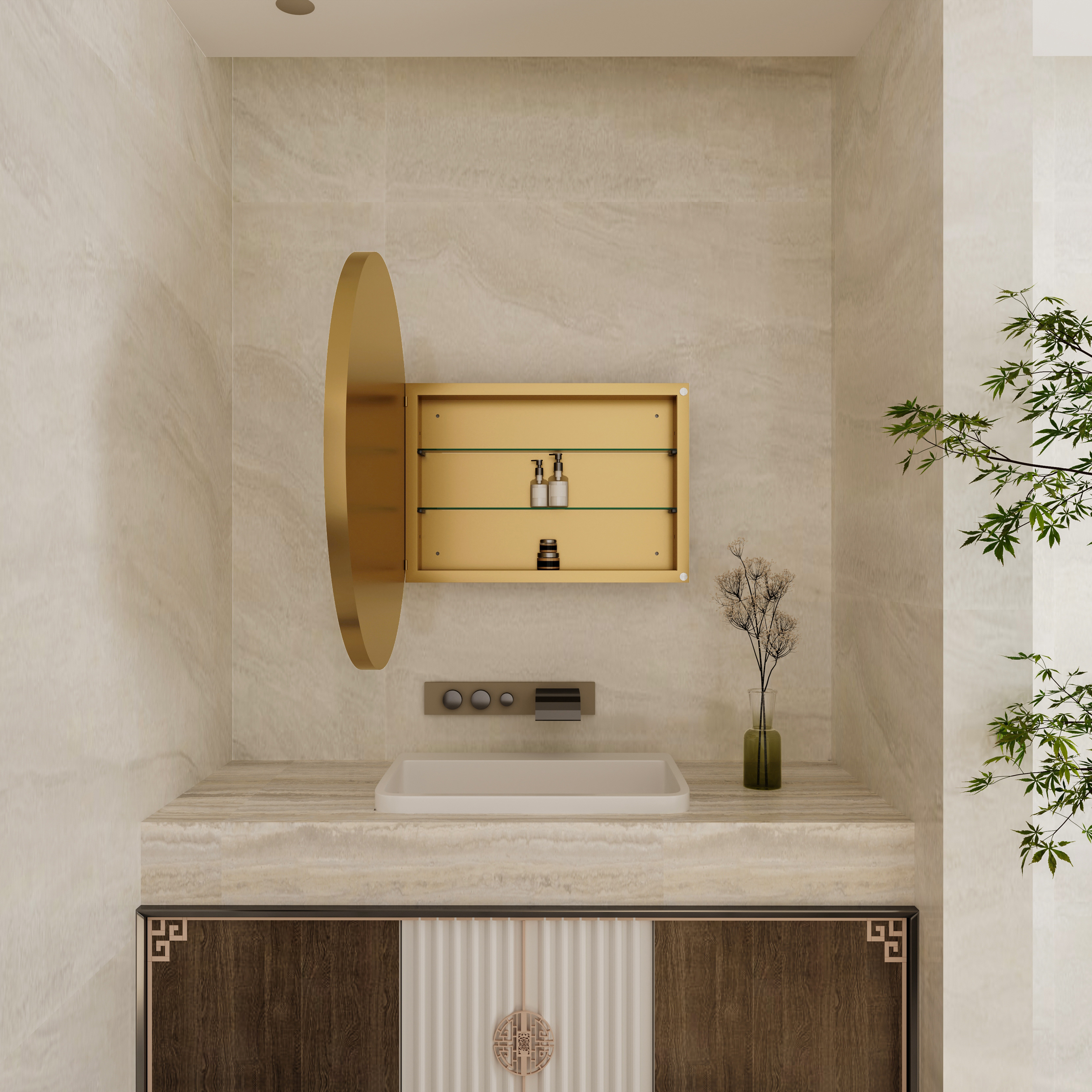 FS Furniture 31.5 Inch Surface Mount Round Metal Framed Medicine Cabinet with Mirror and Adjustable Shelves Black Wall Mirror with Storage for Bathroom, Matte Gold. Designed to provide practical task lighting around a vanity or bathroom mirror while supporting everyday grooming routines. Material: Metal. Product dimensions and weight: length 34.25, width 7.09, height 34.25, weight 35.2.