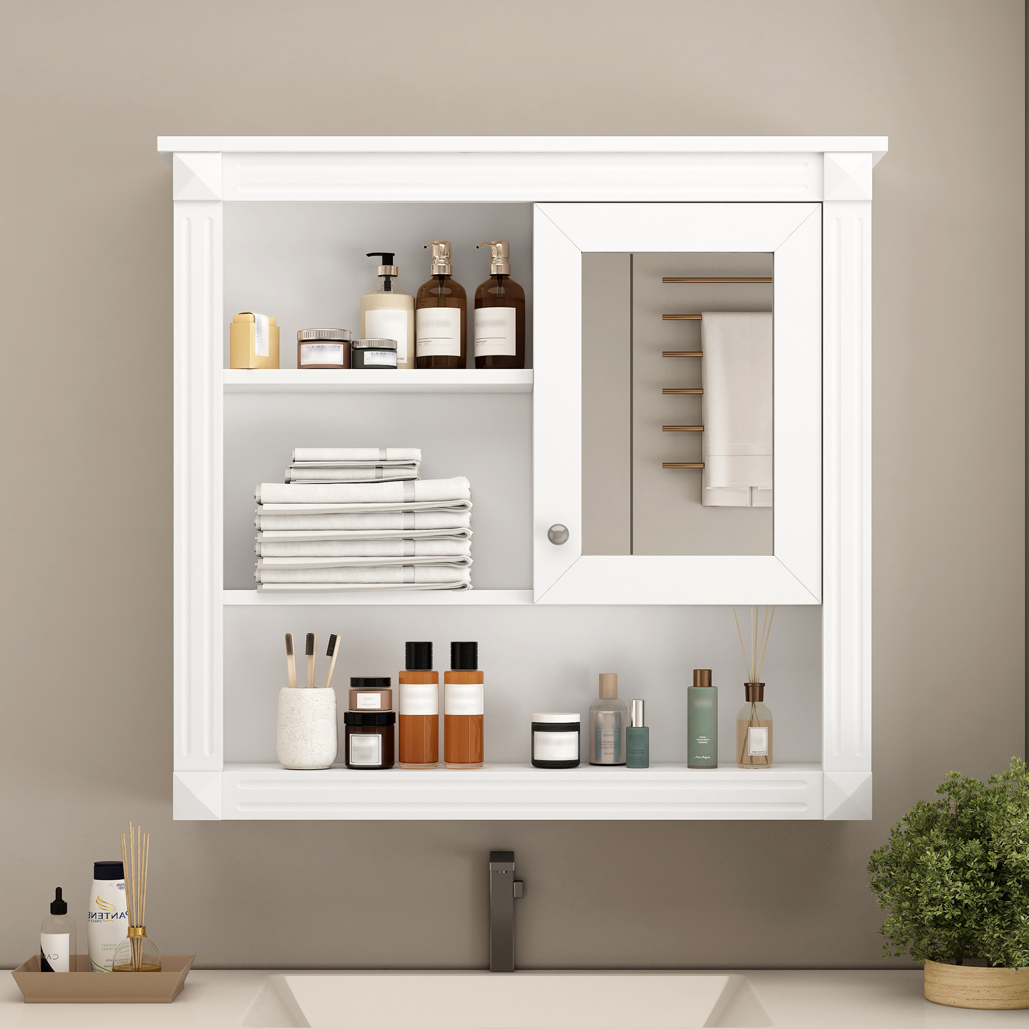 MRS 32'' Bathroom Wall Cabinet with Mirror, Wall Mounted Medicine Cabinet with 4 Shelves, Mirrored Door Over Toilet Storage Cabinet& Adjustable Shelves. Designed to provide practical task lighting around a vanity or bathroom mirror while supporting everyday grooming routines. Material: MDF+glass. Product dimensions and weight: length 36, width 17, height 7.5, weight 34.39.