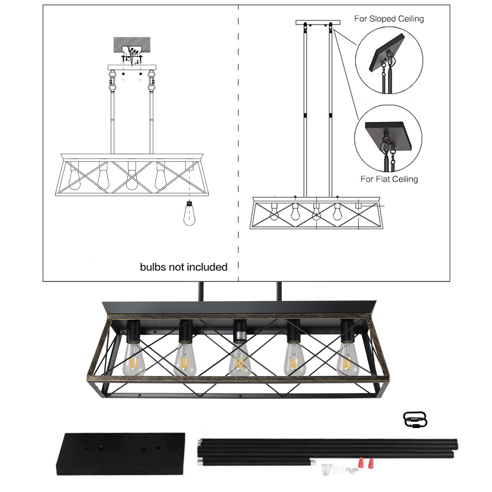 NEOSGO 32" Black Gold Industrial 5-Light Pendant Chandelier, Modern Metal Cage Design, Adjustable Hanging Light for Dining Room, Kitchen, Living Room (No Bulbs) is designed to serve as both a lighting source and a decorative focal point within the room. This type of fixture is especially effective above dining tables, in entryways, and in living spaces where the customer wants overhead light with stronger visual impact. The product presentation suggests a style-driven fixture that helps define the ceiling area and gives the space a more elevated, finished character. It is a strong fit for customers who want lighting that contributes to the overall look of the room rather than functioning as a utility piece alone. Overall size is approximately 33.5 x 12 x 10.6 inches with a listed weight of 15.4. The current listing includes 10 product images, which help clarify the product shape, proportions, and visual placement in a real room setting.