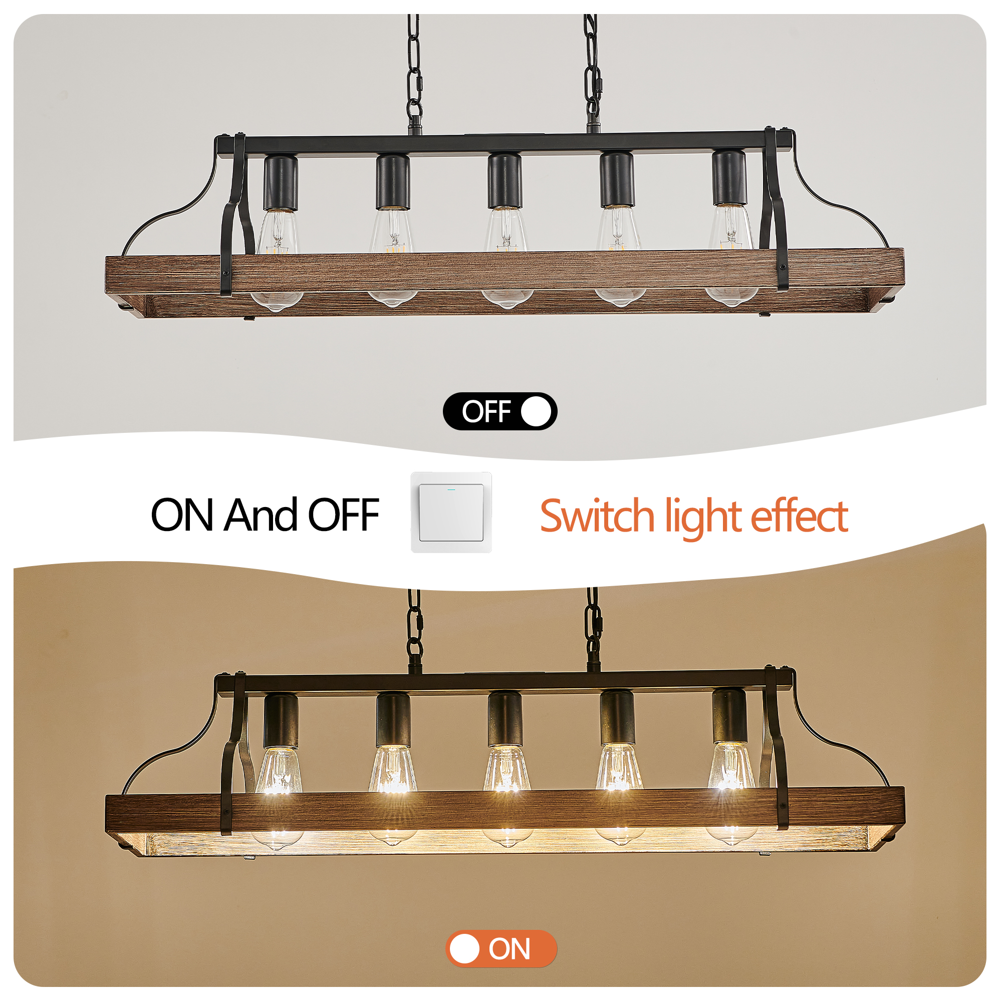NEOSGO 34-Inch Black and Walnut Wood Grain Pendant Light, 5 E26 Bulb Sockets, Adjustable Chain Height – Modern Farmhouse Chandelier for Dining Room, Kitchen, or Living Room (Bulb Not Included) is designed to serve as both a lighting source and a decorative focal point within the room. This type of fixture is especially effective above dining tables, in entryways, and in living spaces where the customer wants overhead light with stronger visual impact. The product presentation suggests a style-driven fixture that helps define the ceiling area and gives the space a more elevated, finished character. It is a strong fit for customers who want lighting that contributes to the overall look of the room rather than functioning as a utility piece alone. Overall size is approximately 33.86 x 10.24 x 2.95 inches with a listed weight of 10.4. The current listing includes 10 product images, which help clarify the product shape, proportions, and visual placement in a real room setting.