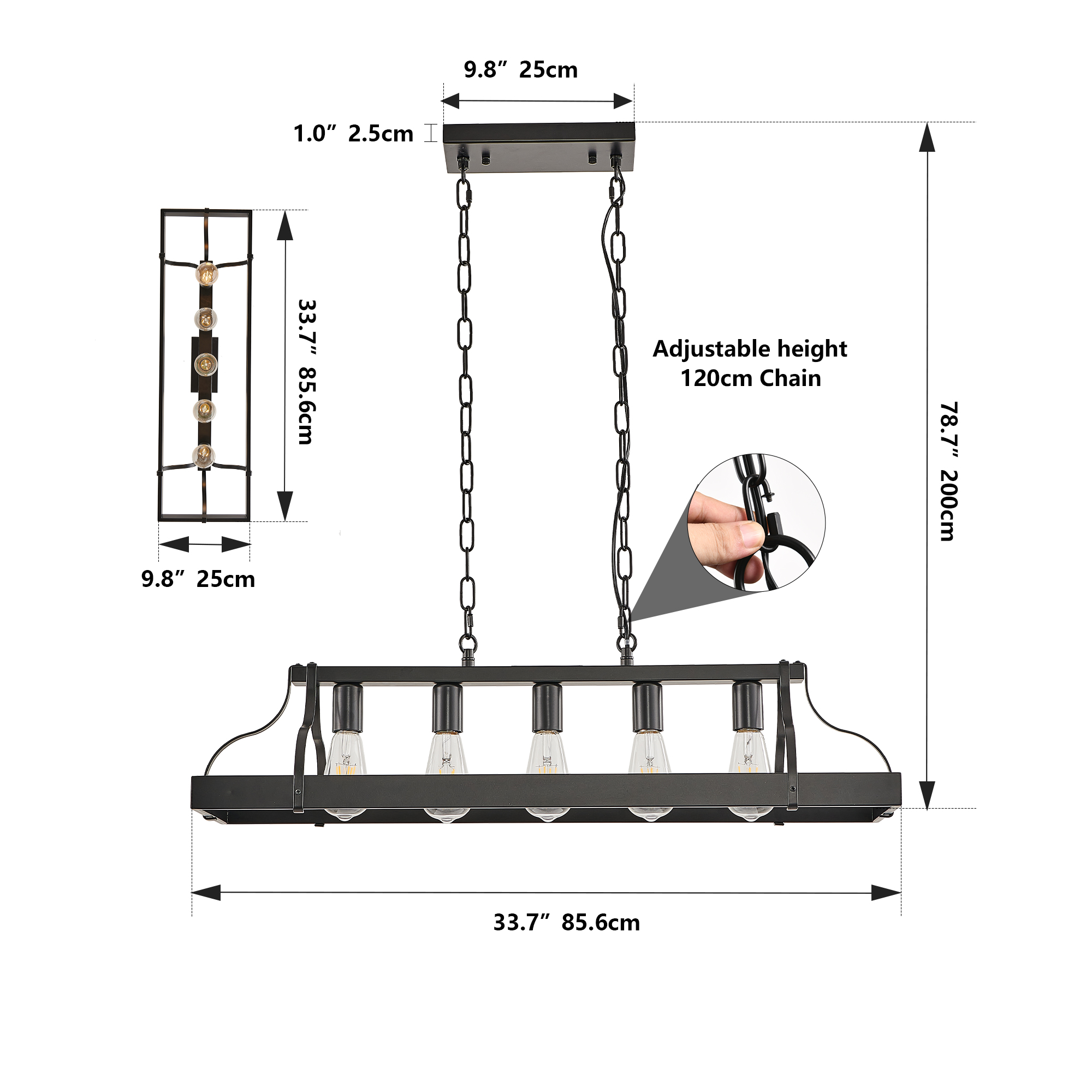 NEOSGO 34-Inch Black Industrial Pendant Light with 5 E26 Bulb Sockets, Adjustable Chain Height – Modern Farmhouse Linear Chandelier for Dining Room, Kitchen Island, or Living Room (Bulb Not Included) is designed to serve as both a lighting source and a decorative focal point within the room. This type of fixture is especially effective above dining tables, in entryways, and in living spaces where the customer wants overhead light with stronger visual impact. The product presentation suggests a style-driven fixture that helps define the ceiling area and gives the space a more elevated, finished character. It is a strong fit for customers who want lighting that contributes to the overall look of the room rather than functioning as a utility piece alone. Overall size is approximately 33.86 x 10.24 x 2.95 inches with a listed weight of 10.4. The current listing includes 10 product images, which help clarify the product shape, proportions, and visual placement in a real room setting.
