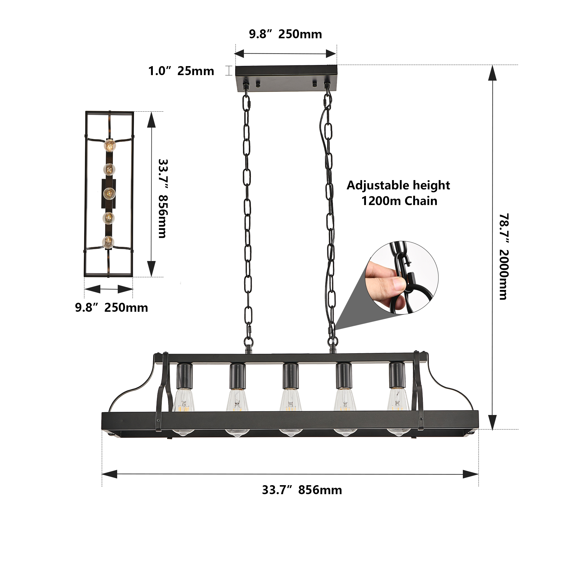 34-Inch Black Industrial Pendant Light with 5 E26 Bulb Sockets, Adjustable Chain Height – Modern Farmhouse Linear Chandelier for Dining Room, Kitchen Island, or Living Room (Bulb Not Included)