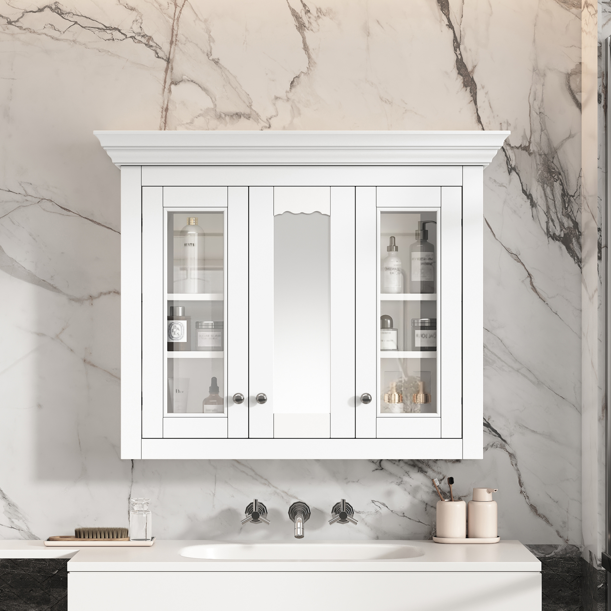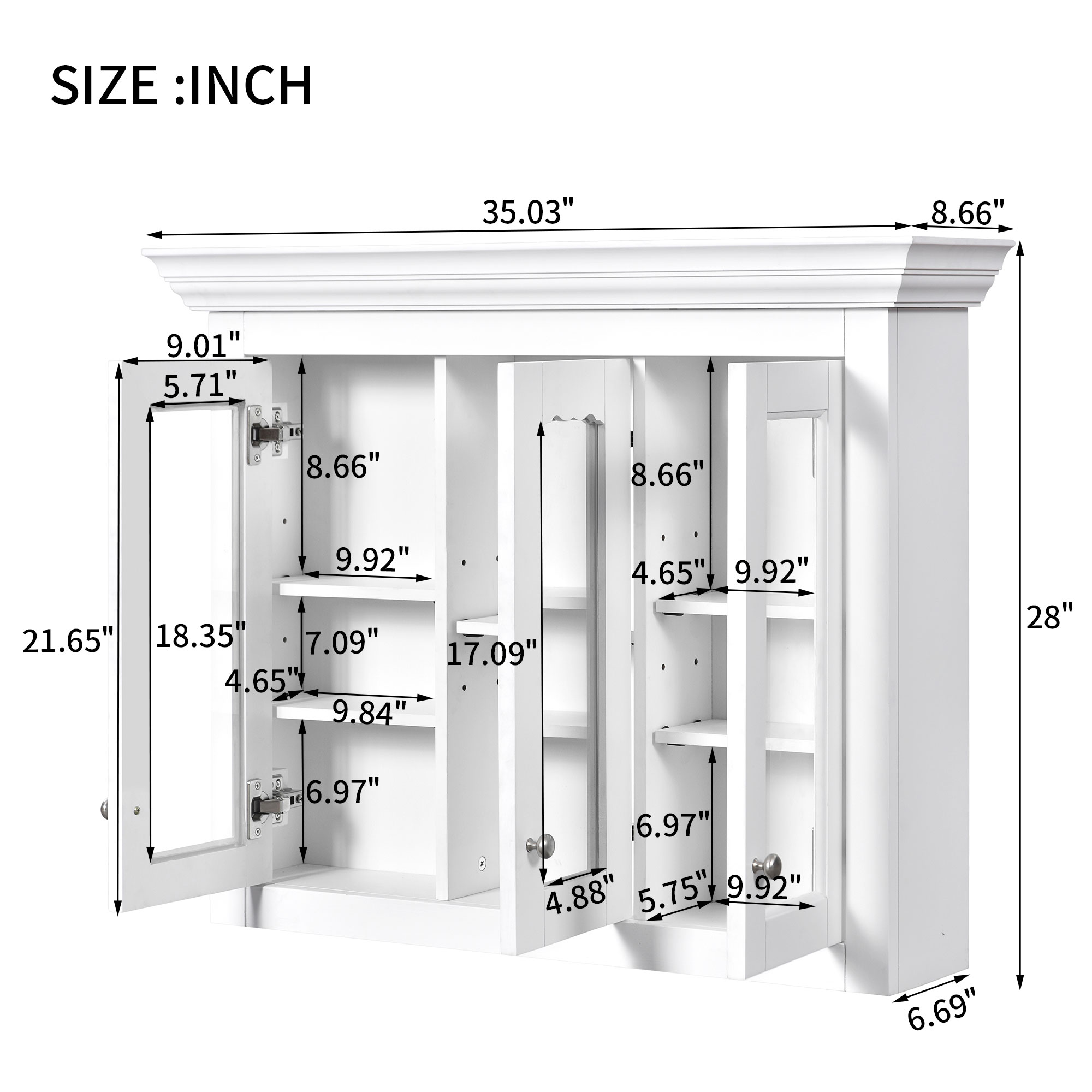 MRS 35" Bathroom Medicine Cabinet with Mirror, 5 Closed & Adjustable Shelves, Bathroom Wall Mounted Storage Cabinet with Glass Doors. Designed to provide practical task lighting around a vanity or bathroom mirror while supporting everyday grooming routines. Material: Solid Wood+MDF. Product dimensions and weight: length 39.25, width 19, height 8, weight 44.53.