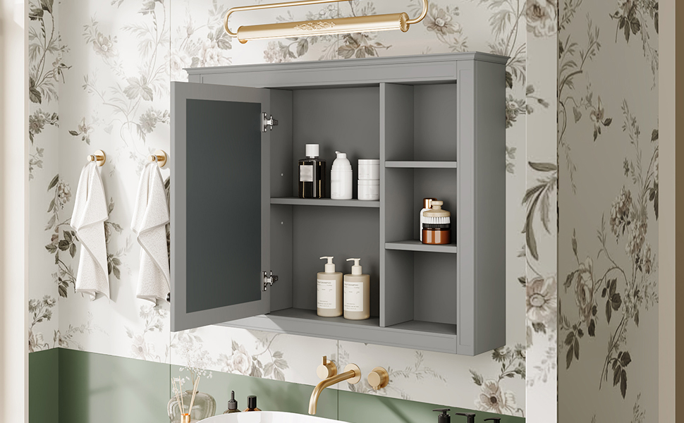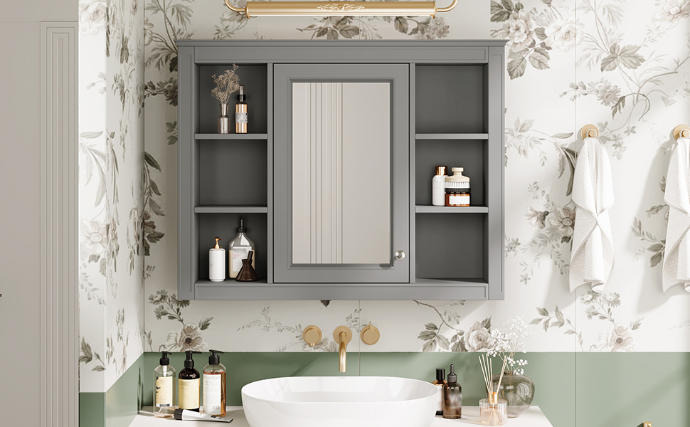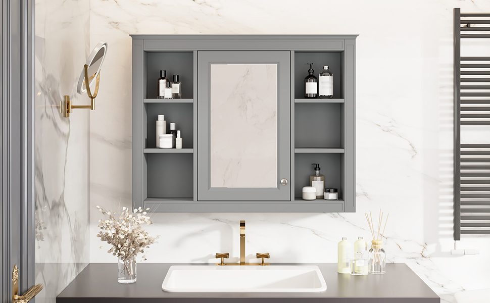 MRS 35'' x 27.5'' Medicine Cabinet, Wall Mounted Bathroom Storage Cabinet, Modern Bathroom Wall Cabinet with Mirror, Mirror Cabinet with 6 Open Shelves (Not Include Bathroom Vanity ). Designed to provide practical task lighting around a vanity or bathroom mirror while supporting everyday grooming routines. Material: MDF. Product dimensions and weight: length 39.5, width 19.75, height 7, weight 40.95.