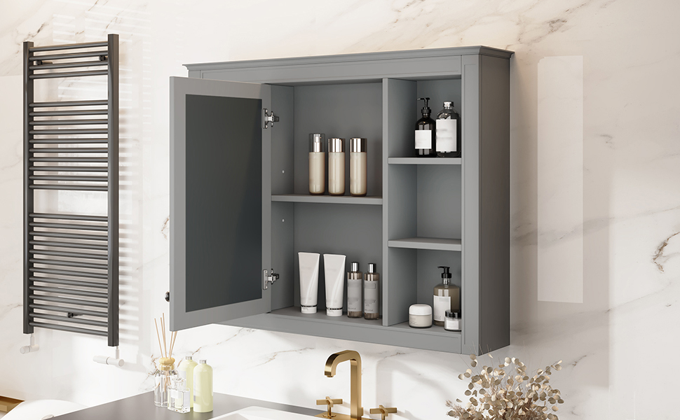 35'' x 27.5'' Medicine Cabinet, Wall Mounted Bathroom Storage Cabinet, Modern Bathroom Wall Cabinet with Mirror, Mirror Cabinet with 6 Open Shelves (Not Include Bathroom Vanity )